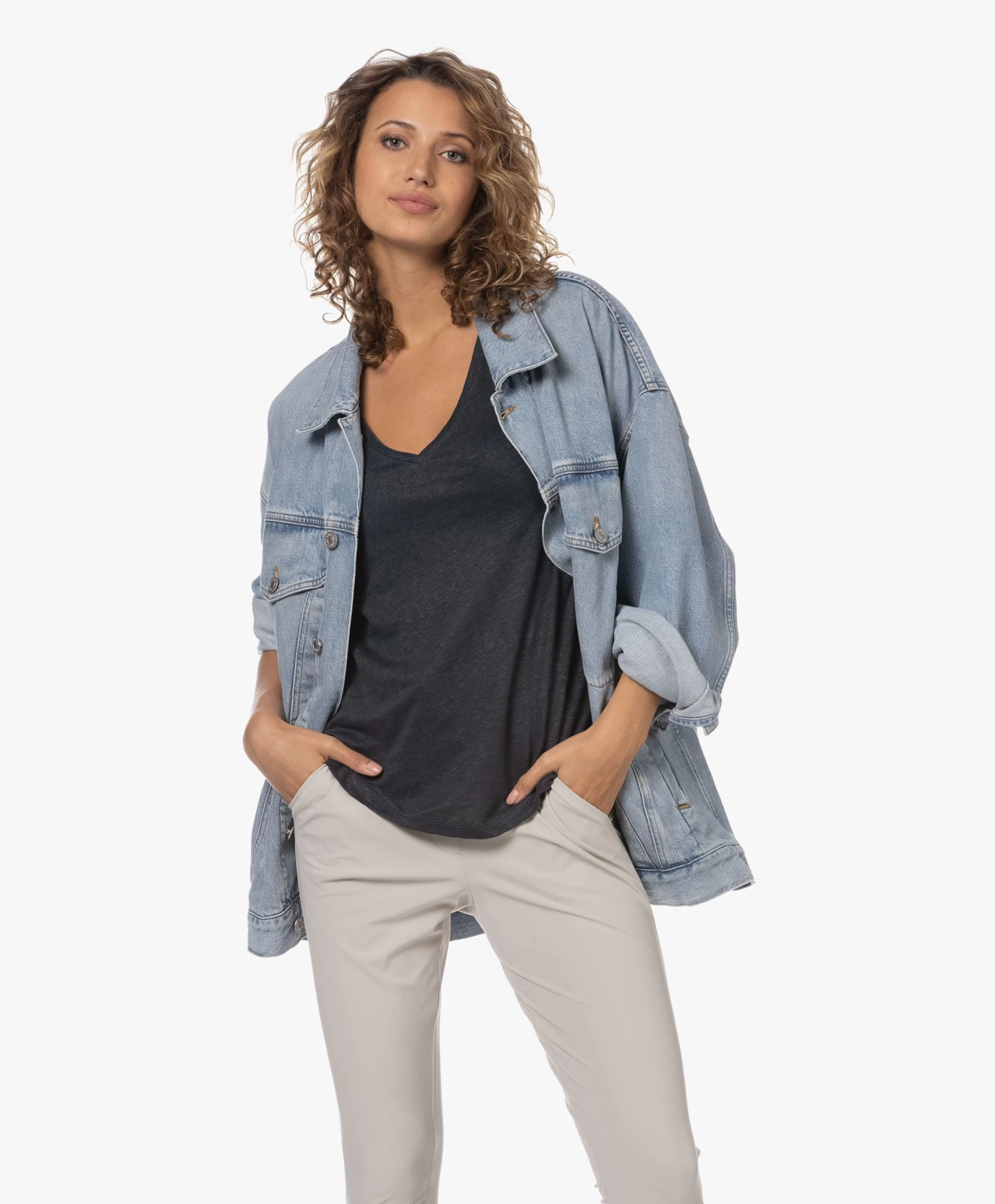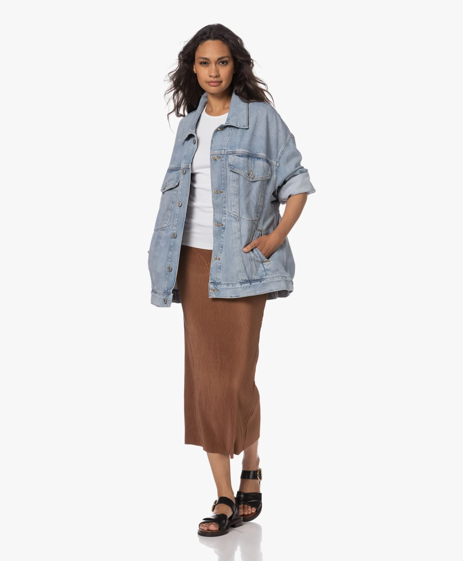 Bij AGOLDE’s bleekblauwe Wayne Jacket laten we de toevoeging ‘subtiel’ maar weg: de pasvorm is serieus oversized – tot de mouwlengte en de afmetingen van de zakken aan toe. Te volumineus wordt het nooit: dankzij het flinke aandeel lyocell is de gewassen denim extra zacht en soepel. Is je stijl wat vrouwelijker, draag er dan ook eens een rok bij.