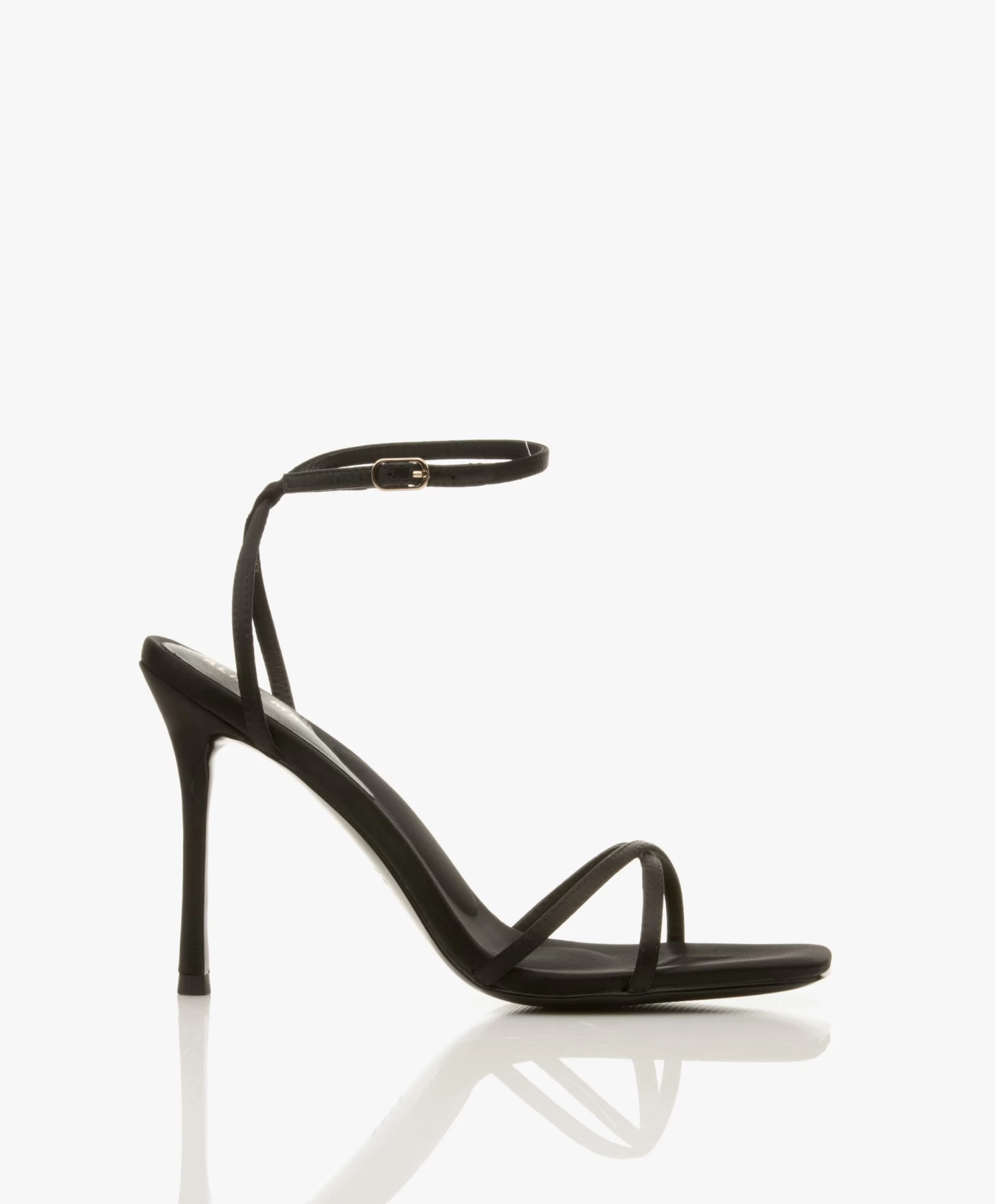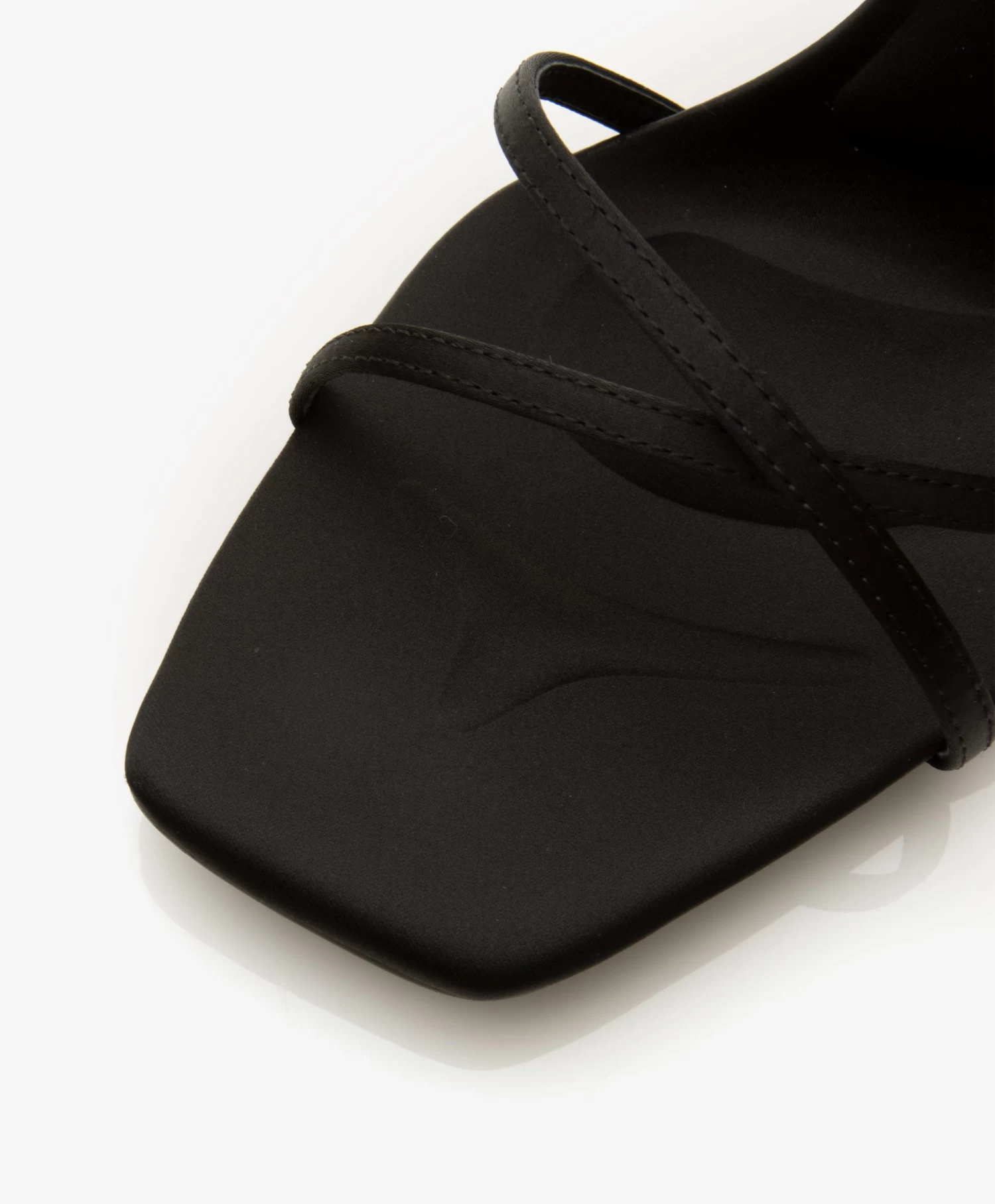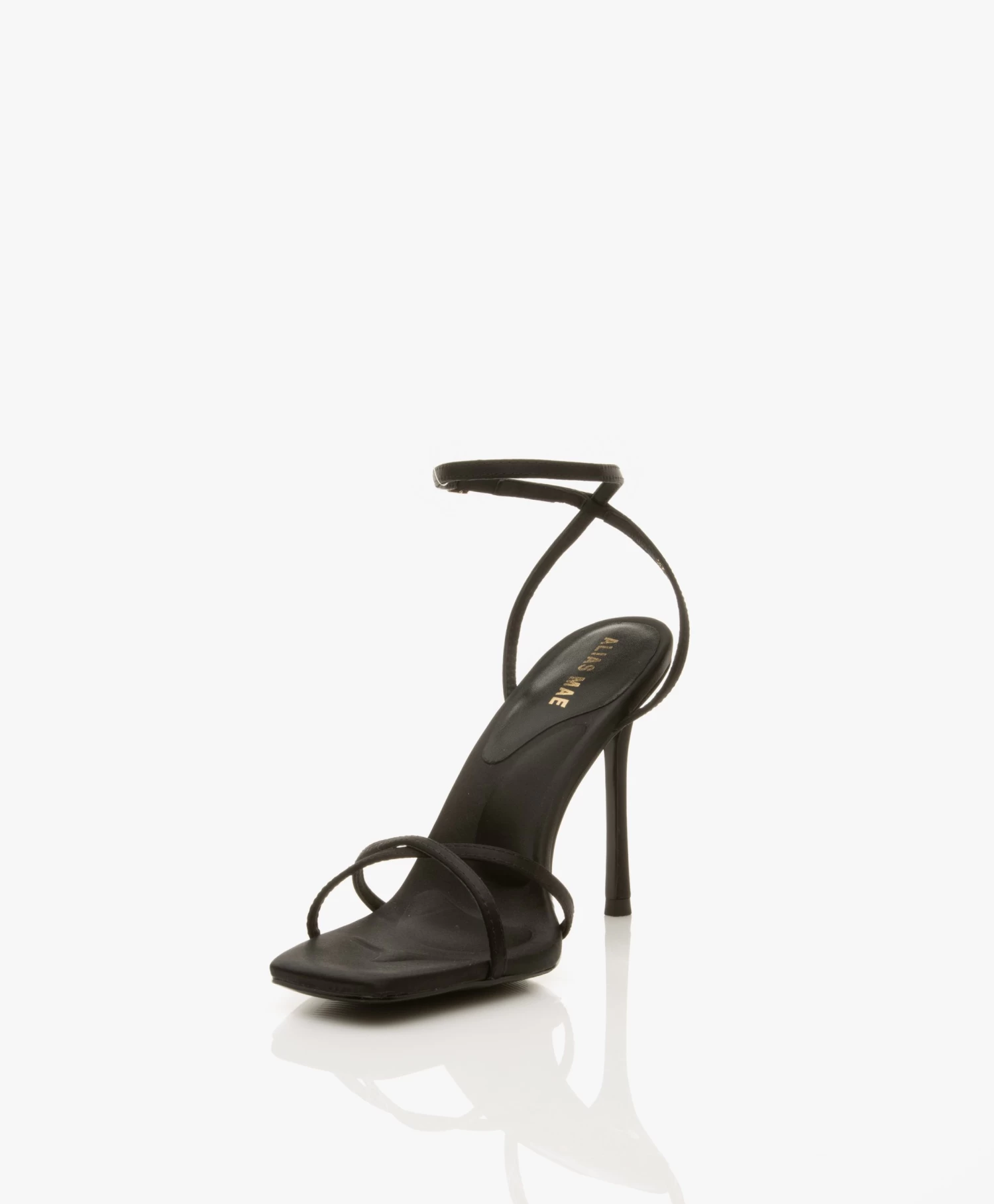 Strappy sandalen met een verfijnde hak maken elke outfit elegant. De zwarte Mia sandalen van Alias Mae zijn ontworpen met extra smalle bandjes van matglanzend satijn, elegant kruisend op de voorvoet. De vierkante neus oogt minimalistisch en modern. Fijn: de gepolsterde kussentjes in de zool die de voetboog en tenen ondersteunen.