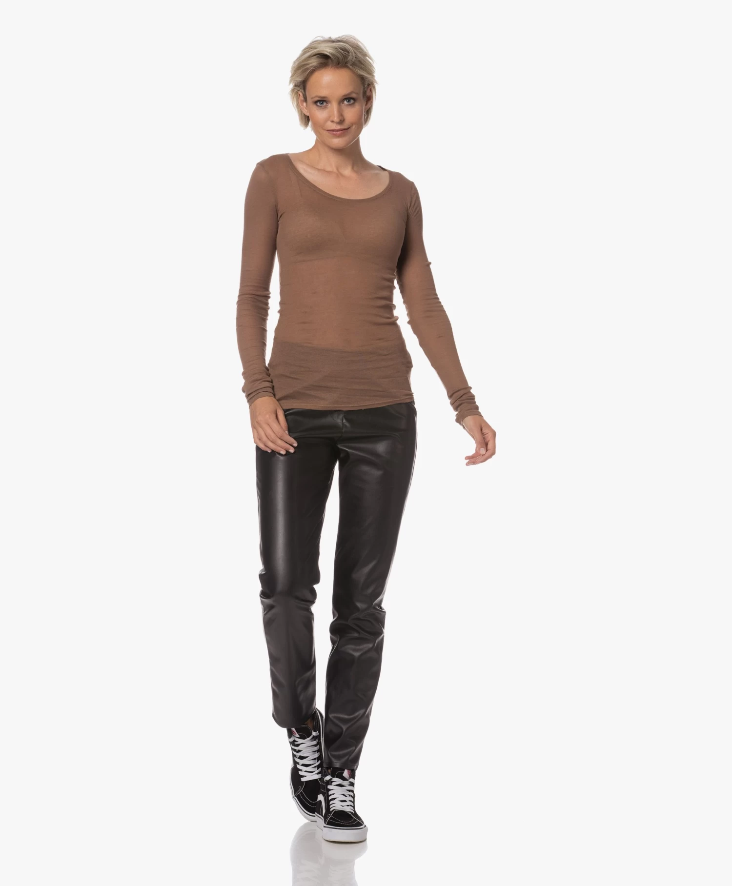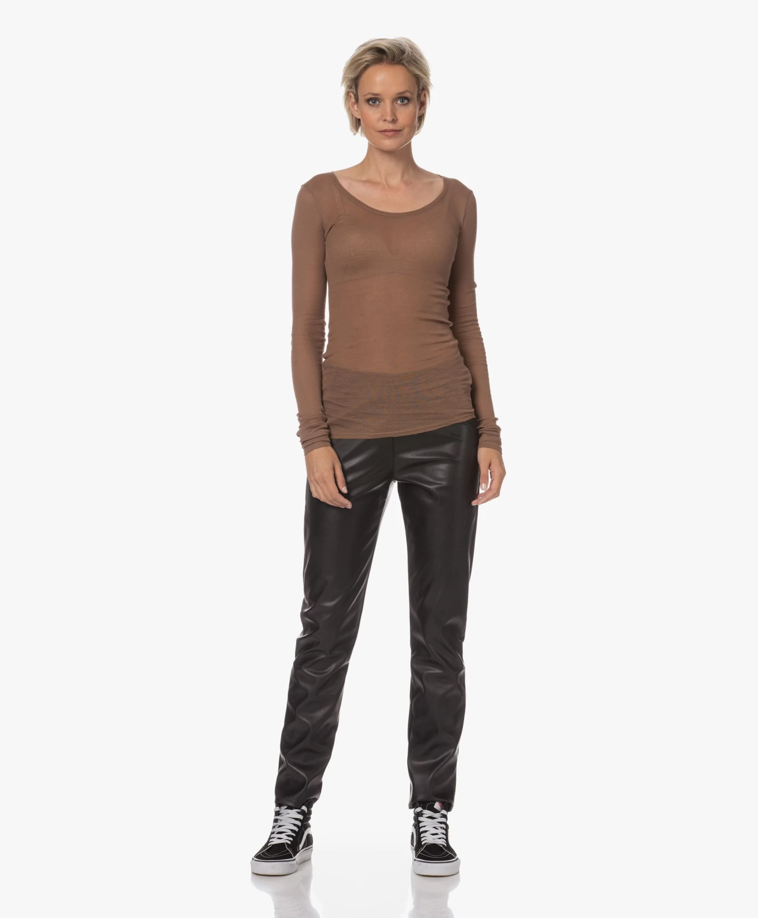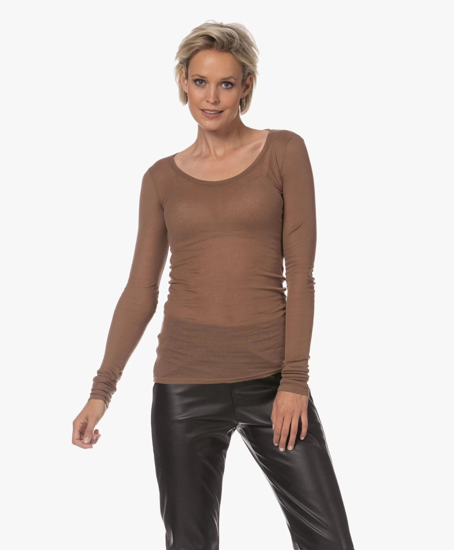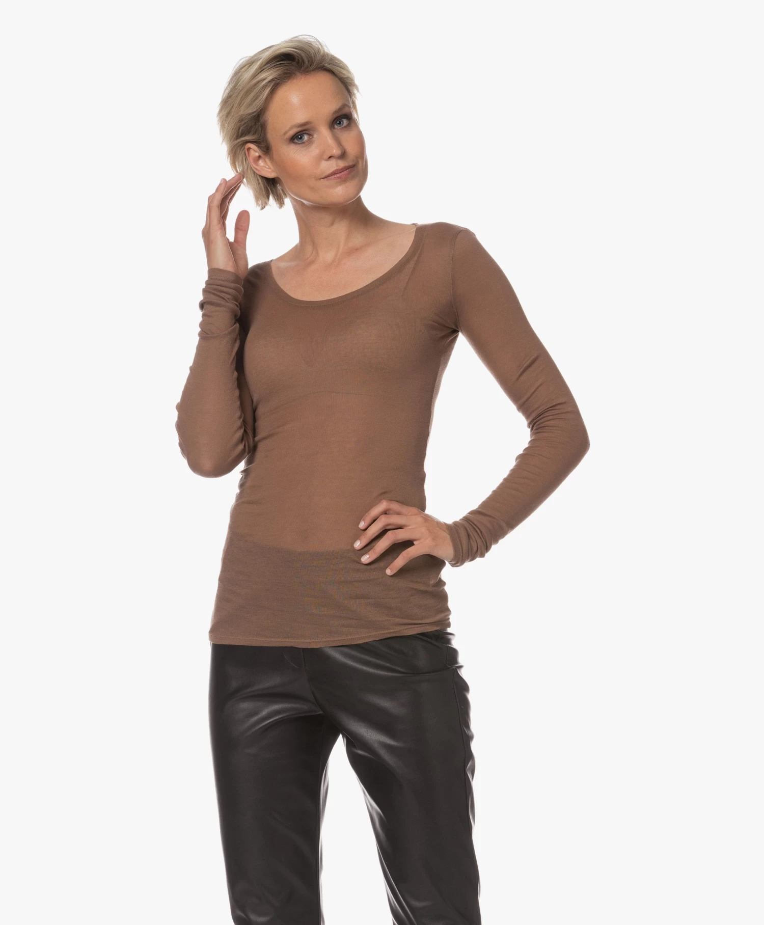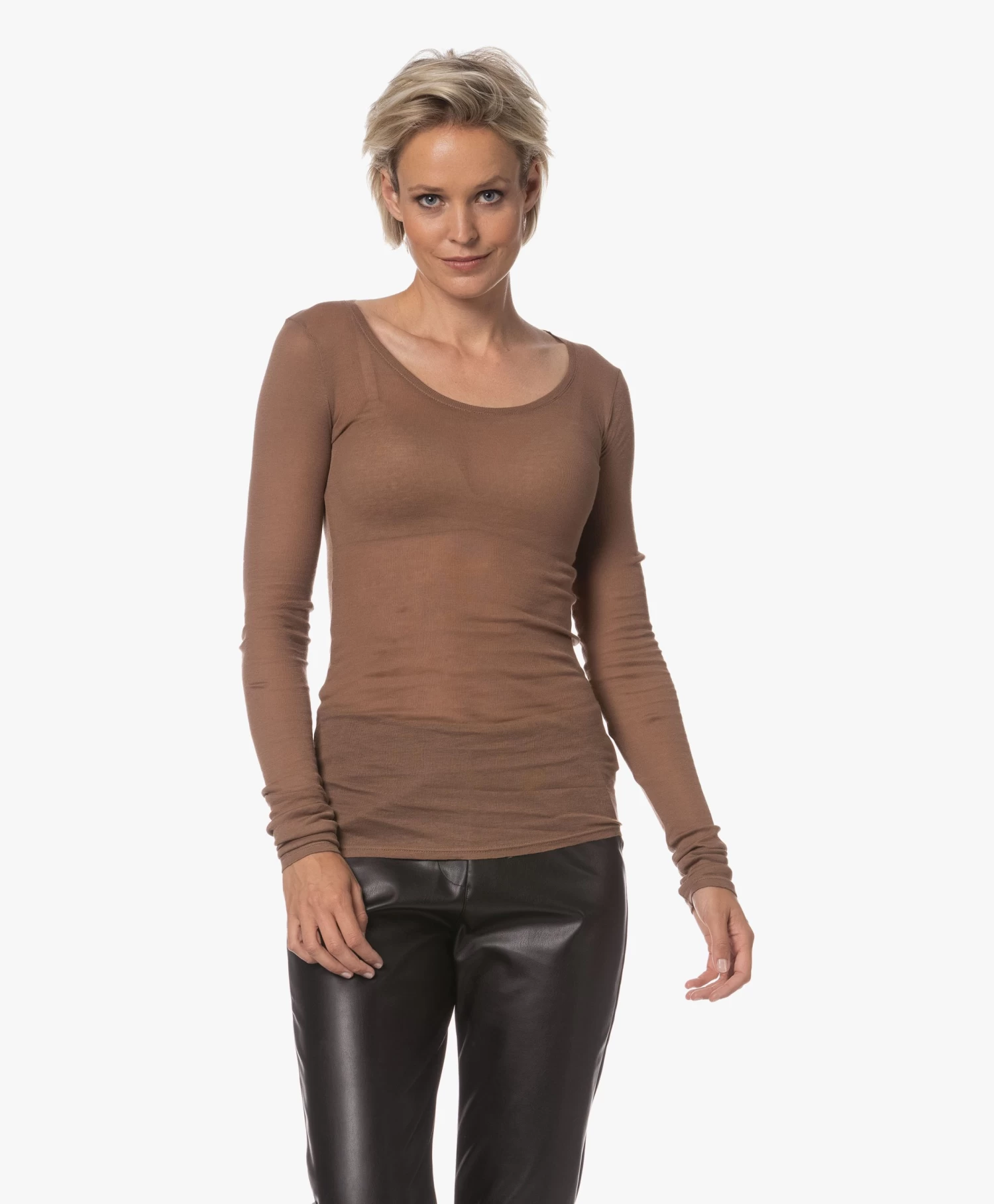 Second skin Massachusetts longsleeve met ronde hals in bruin van American Vintage in Supima katoen. Deze katoensoort wordt vaak “Het cashmere katoen” genoemd, omdat het andere katoen kwaliteiten overtreft in zachtheid, sterkte en kleurkwaliteit. Het merk staat bekend om luxe en tijdloze basics met een rauw randje – deze lichtgewicht en iets transparante rib jersey stijl is daar geen uitzondering op.Â