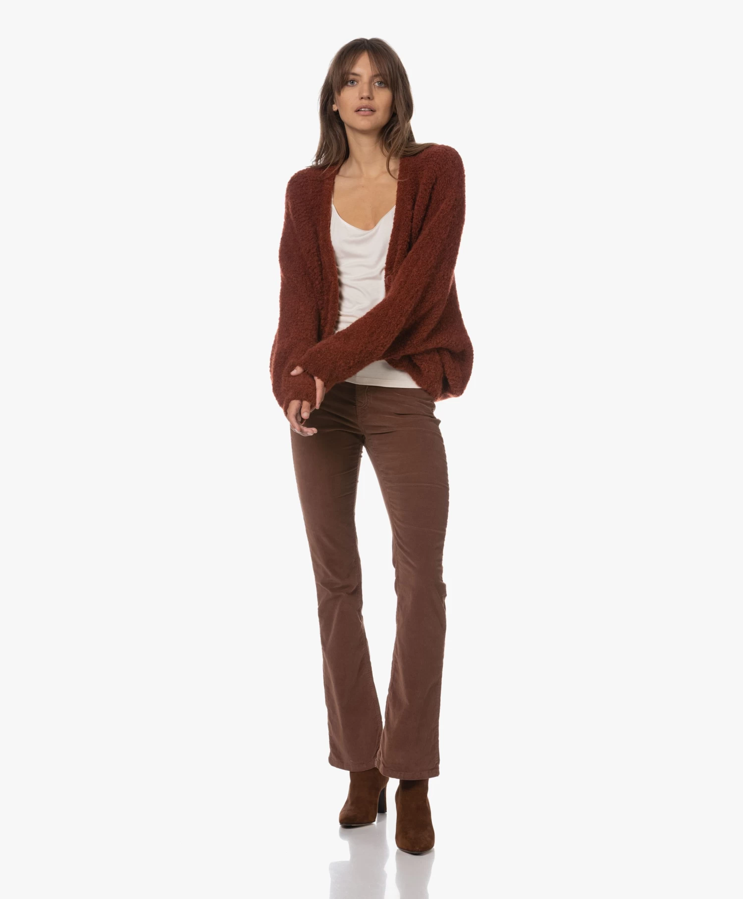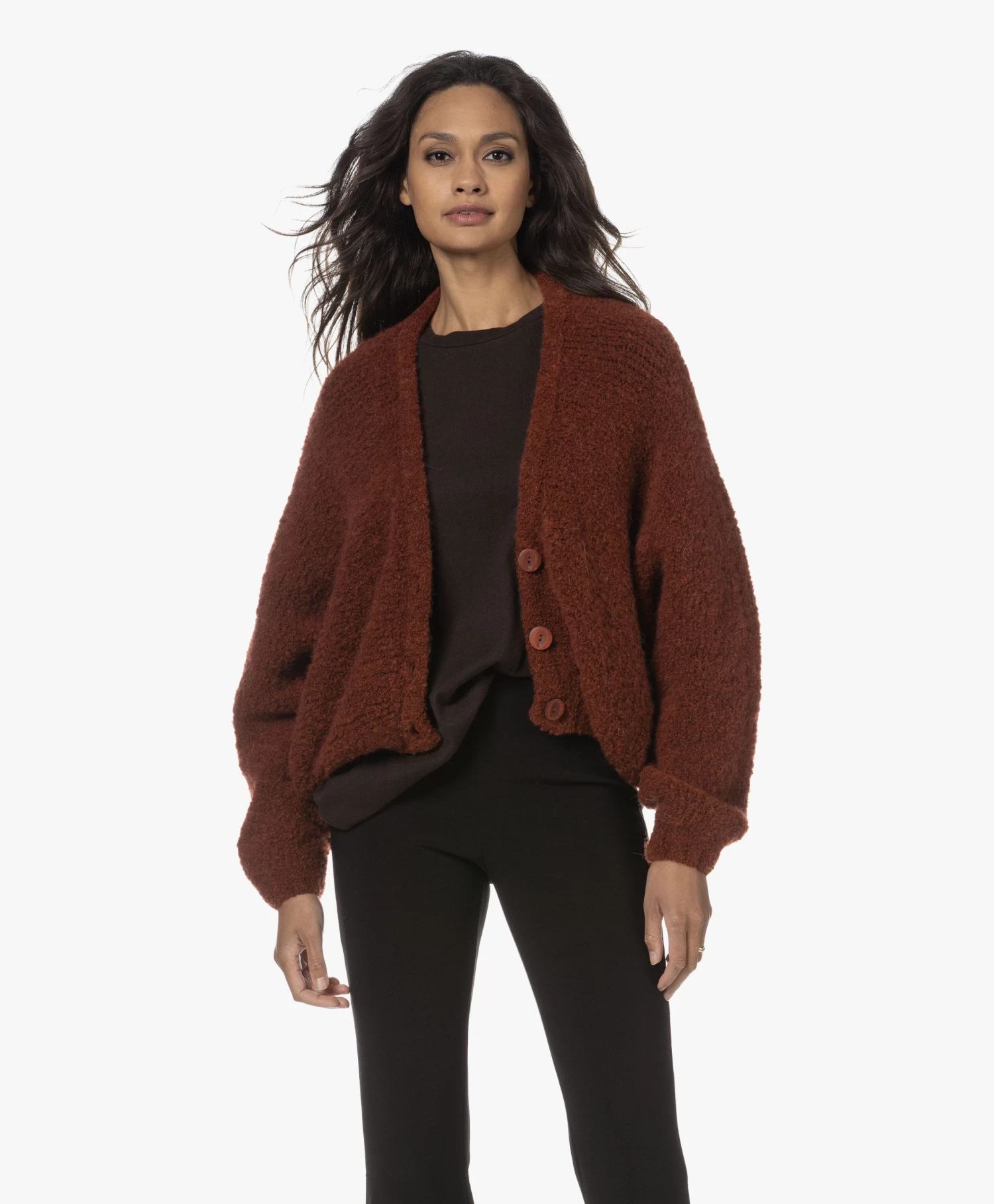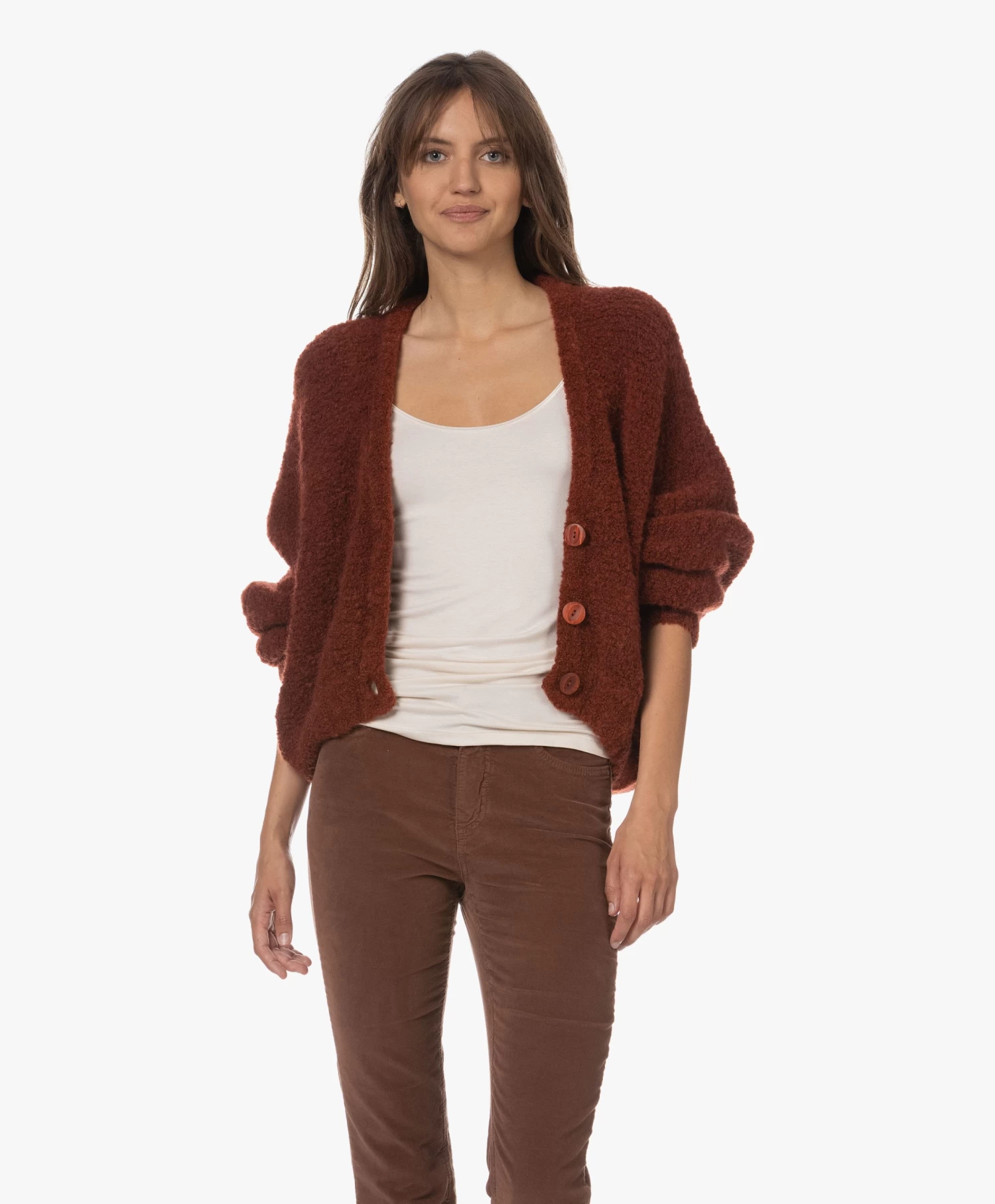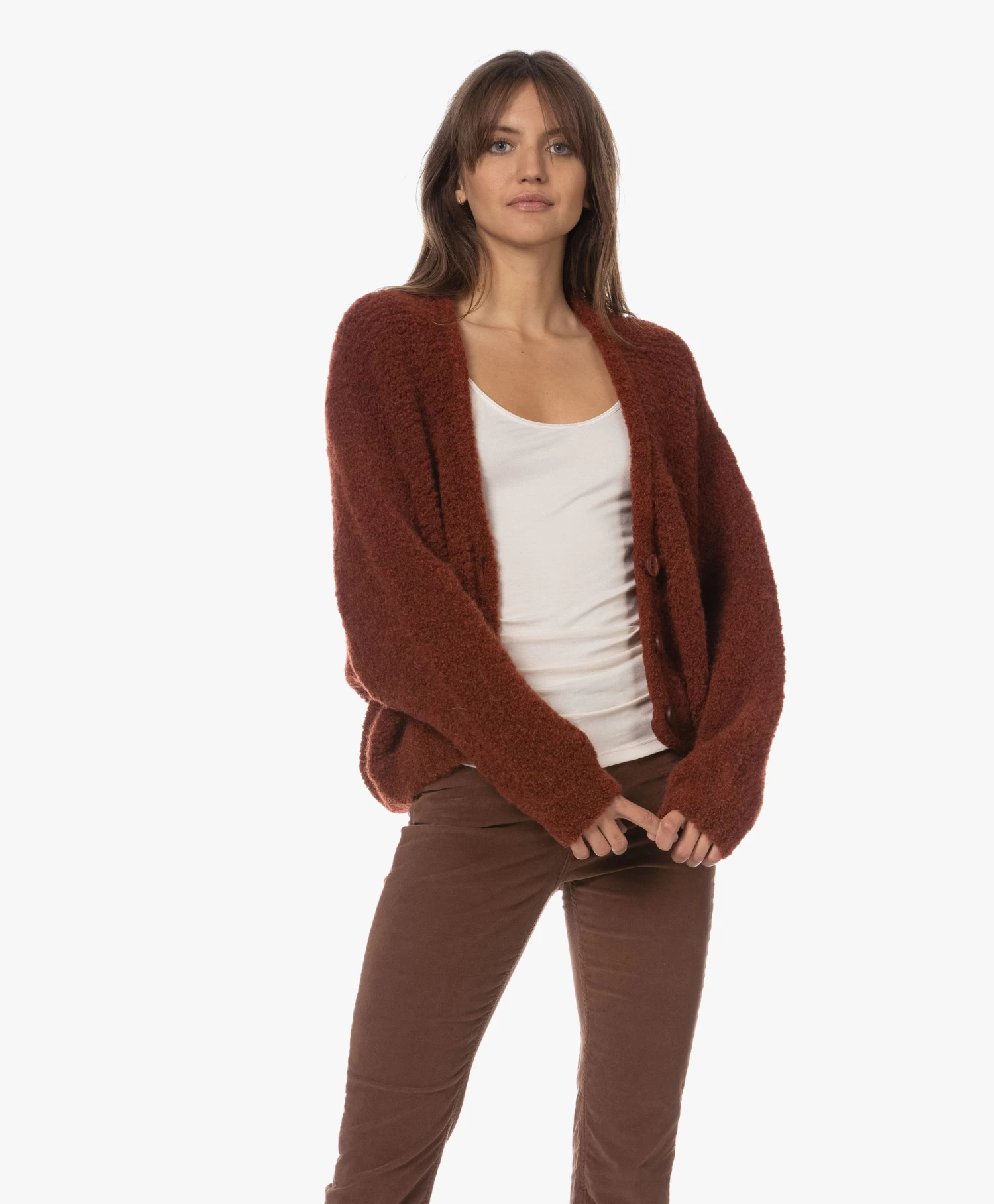 Met authentieke knitwear als uitgangspunt weet American Vintage steeds weer te vernieuwen. Want waar het silhouet van stijl Zolly geïnspireerd is op dat van het klassieke V-hals doorknoopvest, geeft de oversized pasvorm met extra-lange vleermuismouwen en een iets cropped lengte het geheel een eigentijdse vibe. Gemaakt van een mediumgrof wolmix breisel van bouclé garens: een textuur die iedere look een extra dimensie geeft.