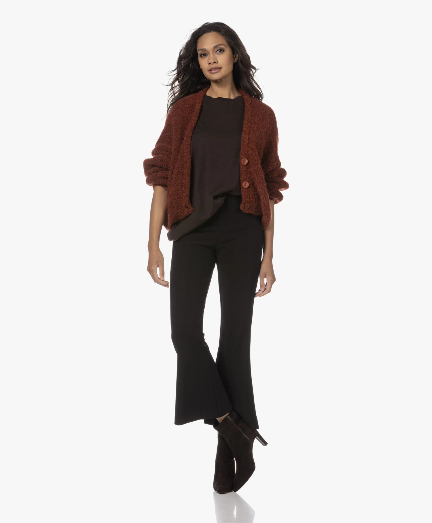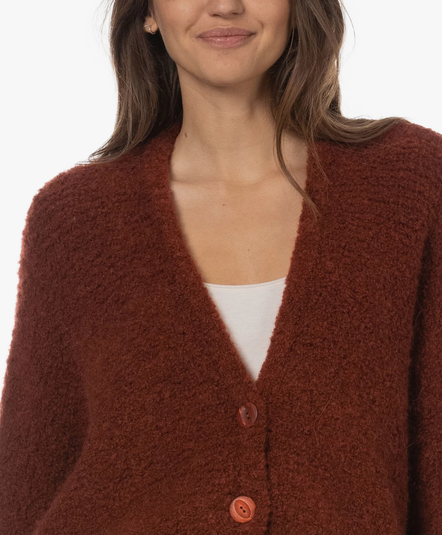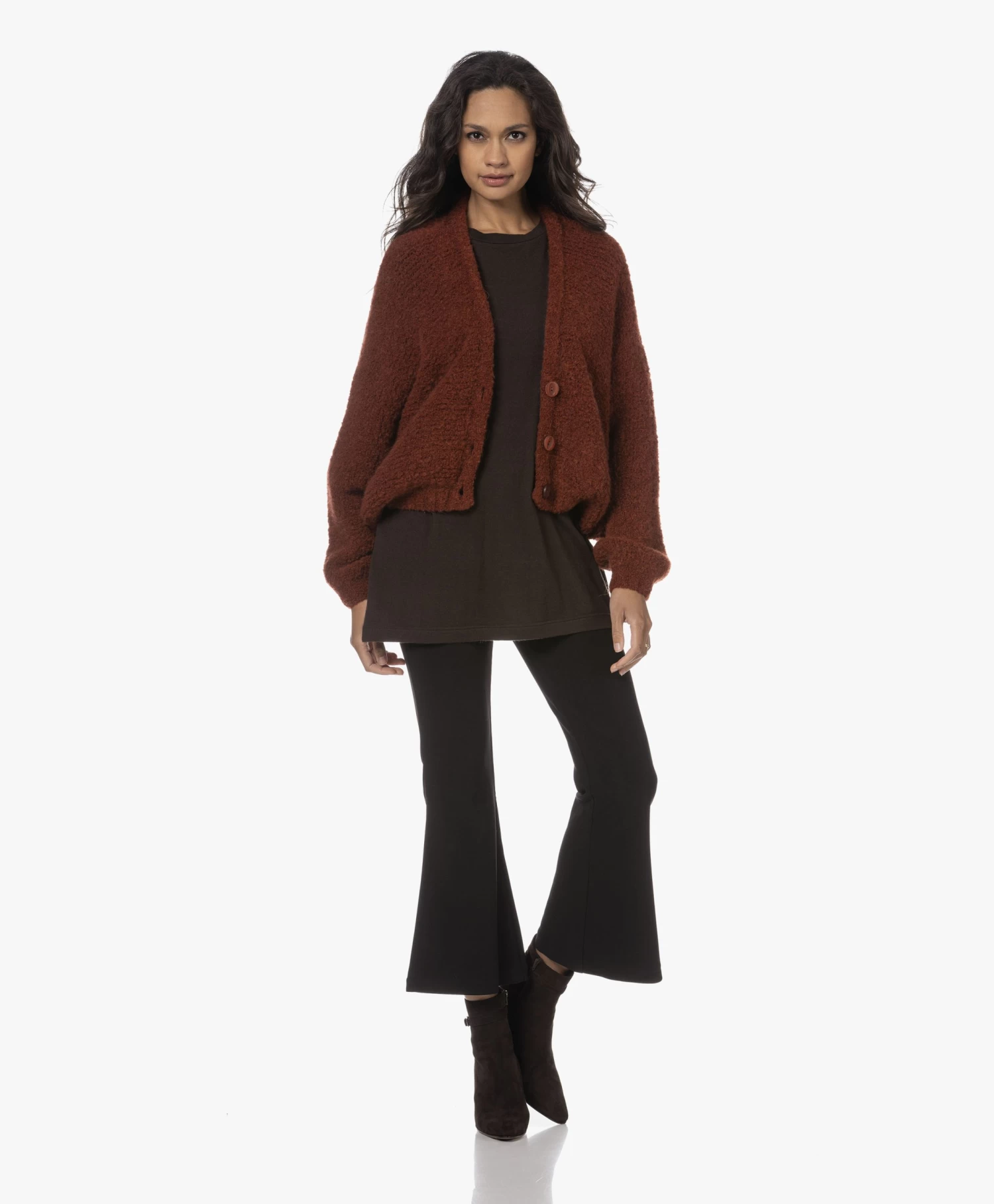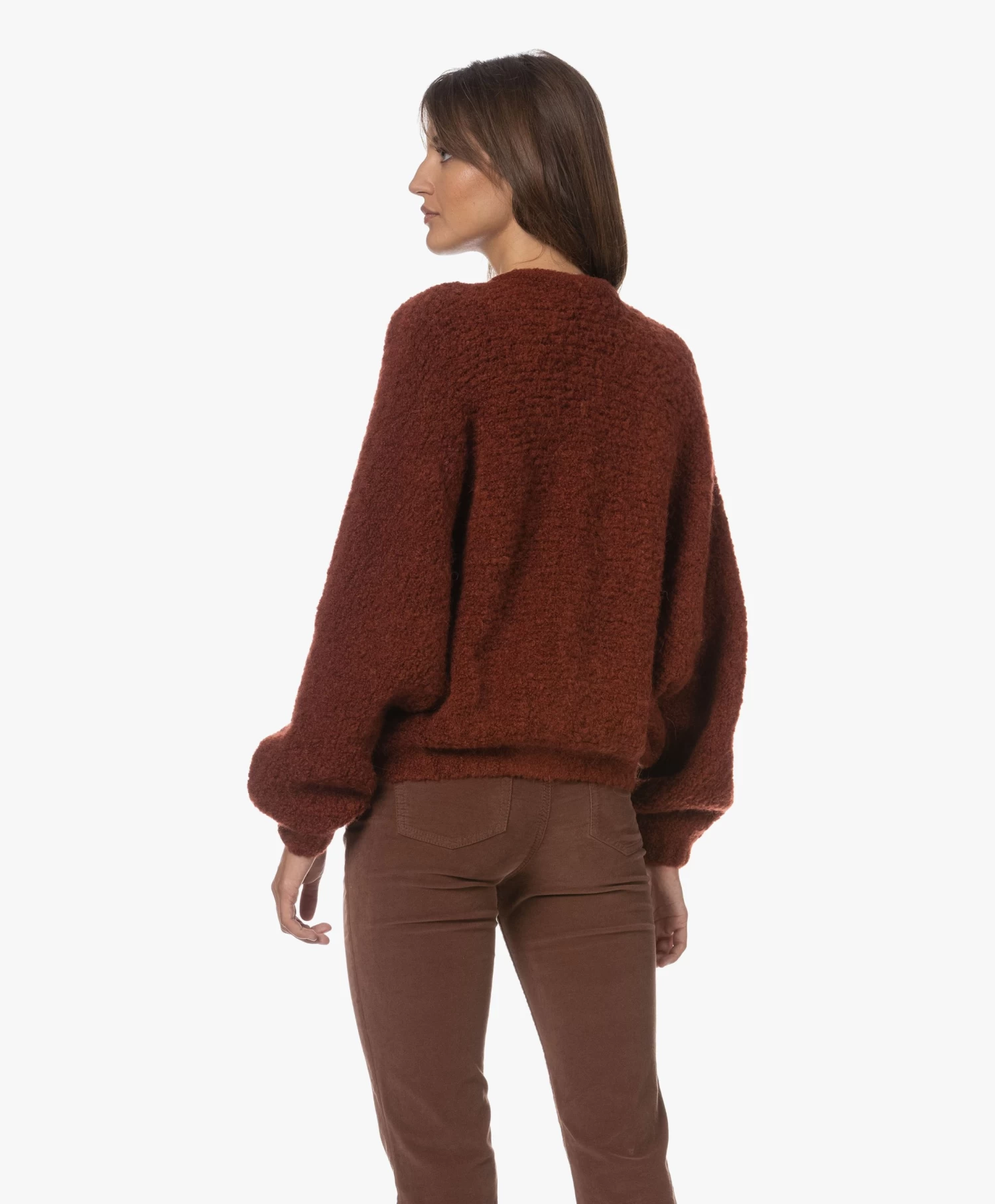 Met authentieke knitwear als uitgangspunt weet American Vintage steeds weer te vernieuwen. Want waar het silhouet van stijl Zolly geïnspireerd is op dat van het klassieke V-hals doorknoopvest, geeft de oversized pasvorm met extra-lange vleermuismouwen en een iets cropped lengte het geheel een eigentijdse vibe. Gemaakt van een mediumgrof wolmix breisel van bouclé garens: een textuur die iedere look een extra dimensie geeft.
