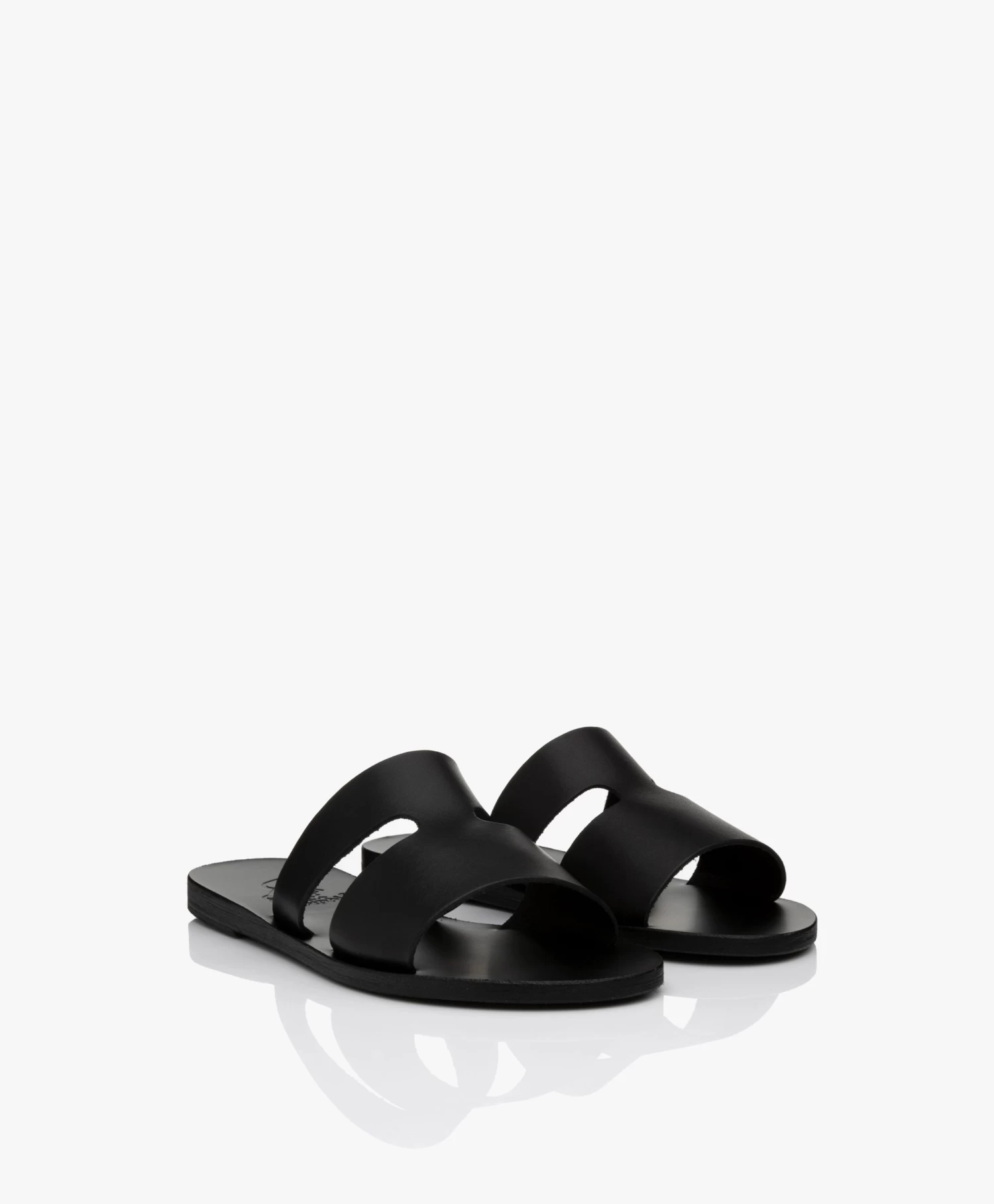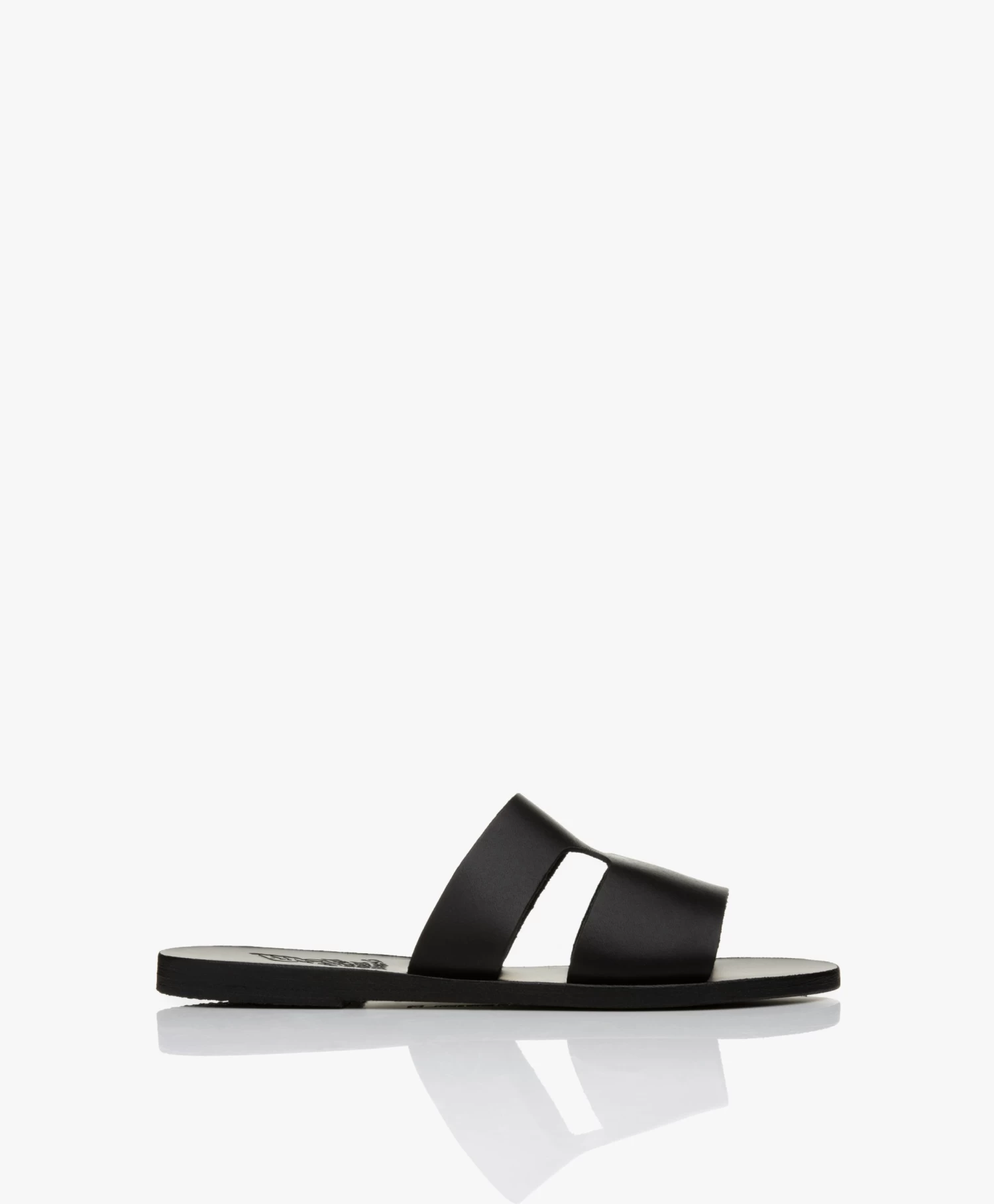 Ancient Greek Sandals’ zwarte Apteros slippers vallen op door het stijlvolle ontwerp met brede cut-out wreefband. Een slipper met een comfortabele platte zool, gemaakt van stevig leer: de ideale, neutrale en toch subtiel opvallende aanwinst voor je collectie zomerschoenen. De gelaagde leren buitenzool is voorzien van antisliprubber onder de hiel.