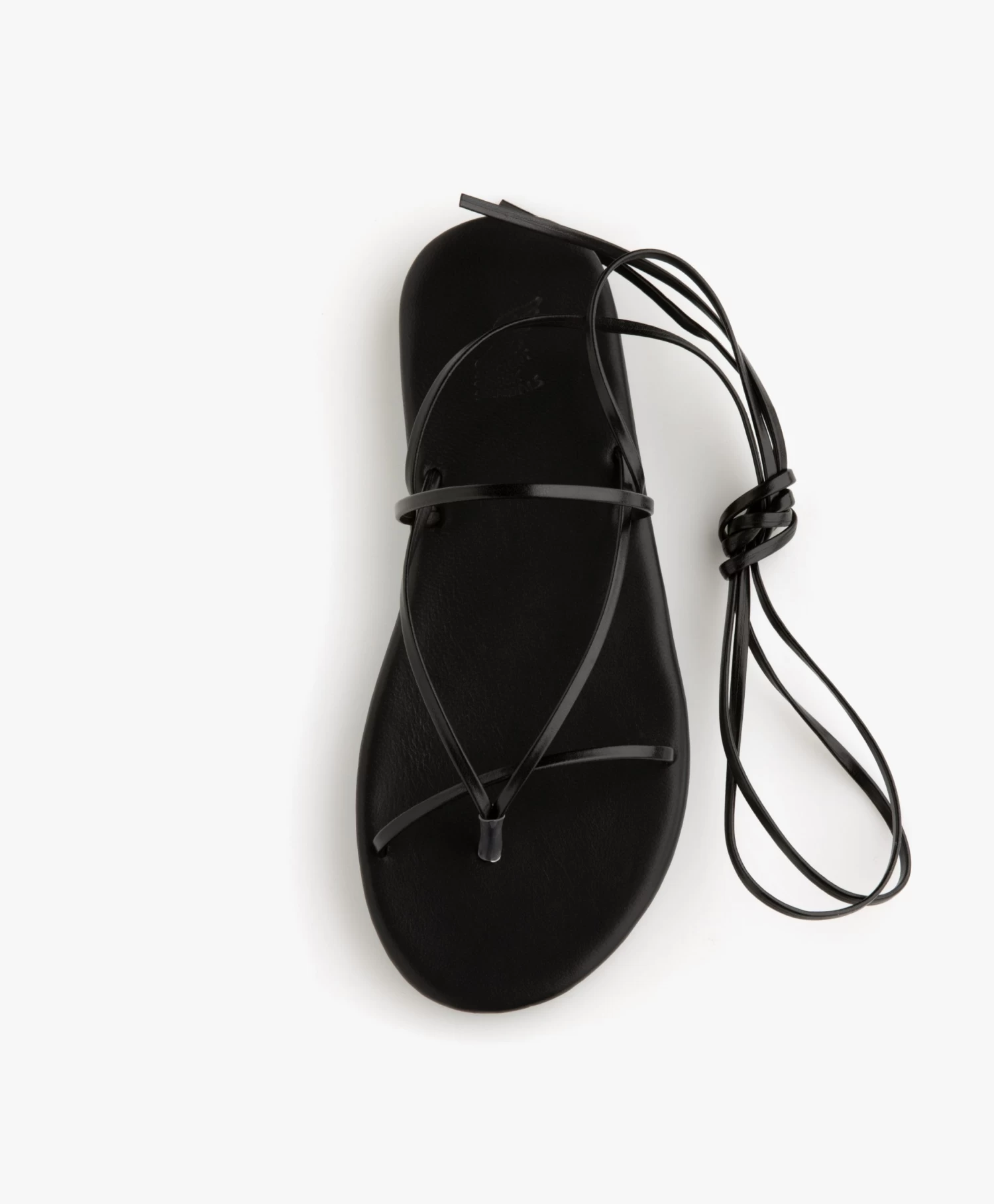 Deze handgemaakte String Flip Flop teensandalen van Ancient Greek Sandals zijn ontworpen met elegante, extra-smalle bandjes die gekruist over de wreef lopen en die je om de enkels strikt. De sandalen zijn gemaakt van zwart soepel en zacht leer en hebben een comfortabel, gewatteerd en flexibel voetbed dat optimaal support biedt.Â