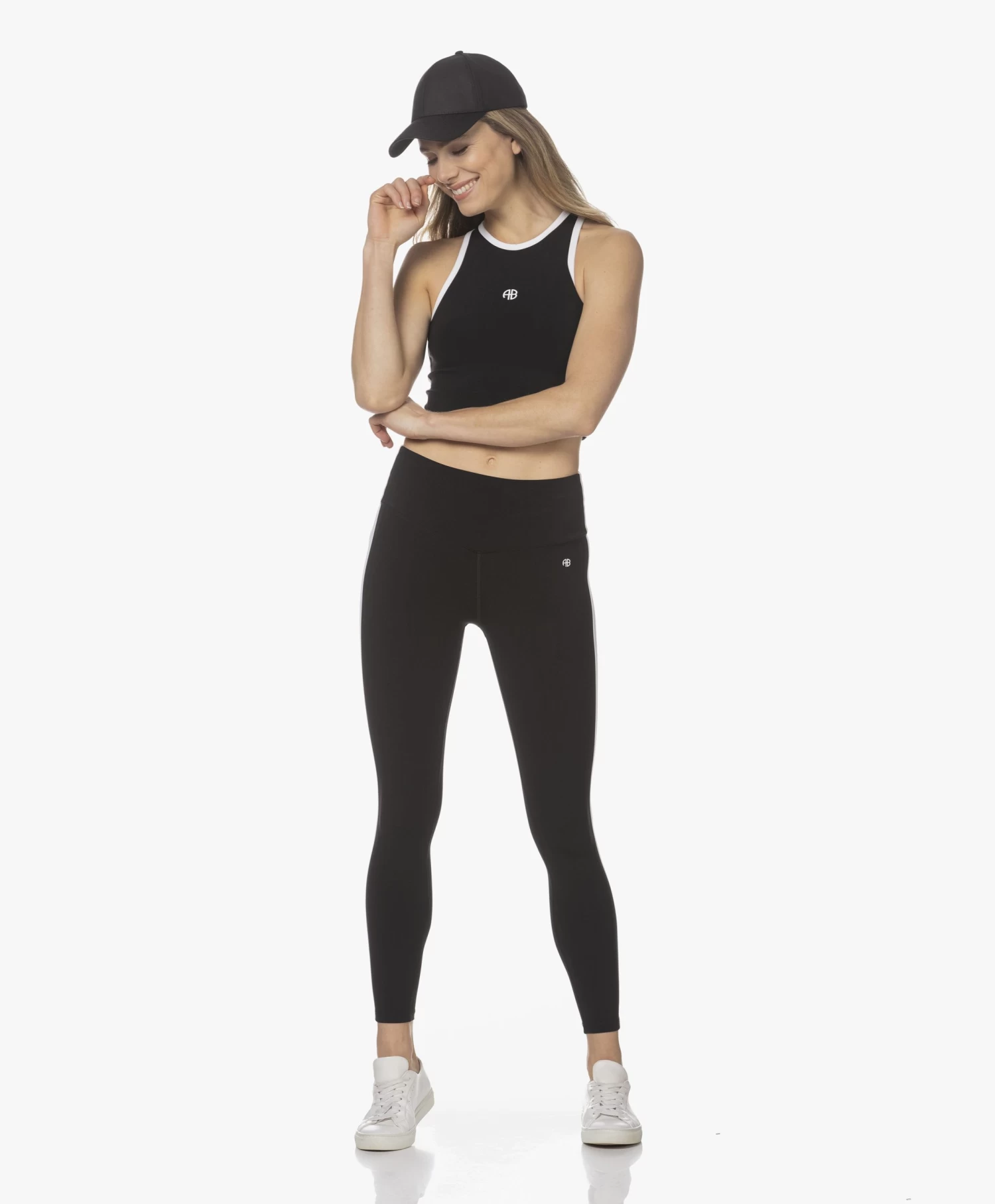 ANINE BING komt met een stijlvolle sportcollectie die bestaat uit veelzijdige athleisure wear en waar top Brett onderdeel vanuit maakt. De zwarte top heeft een elegante cropped lengte en is ontworpen met witte biezen langs de zijkanten voor een extra sportieve touch. De top is gemaakt van een stevige doch stretchy tech kwaliteit met compressie eigenschappen en afgewerkt met het merksymbool aan de voorkant en het ANINE BING sport logo aan de achterkant. Ideaal voor zowel low- als high-impact workouts.Â