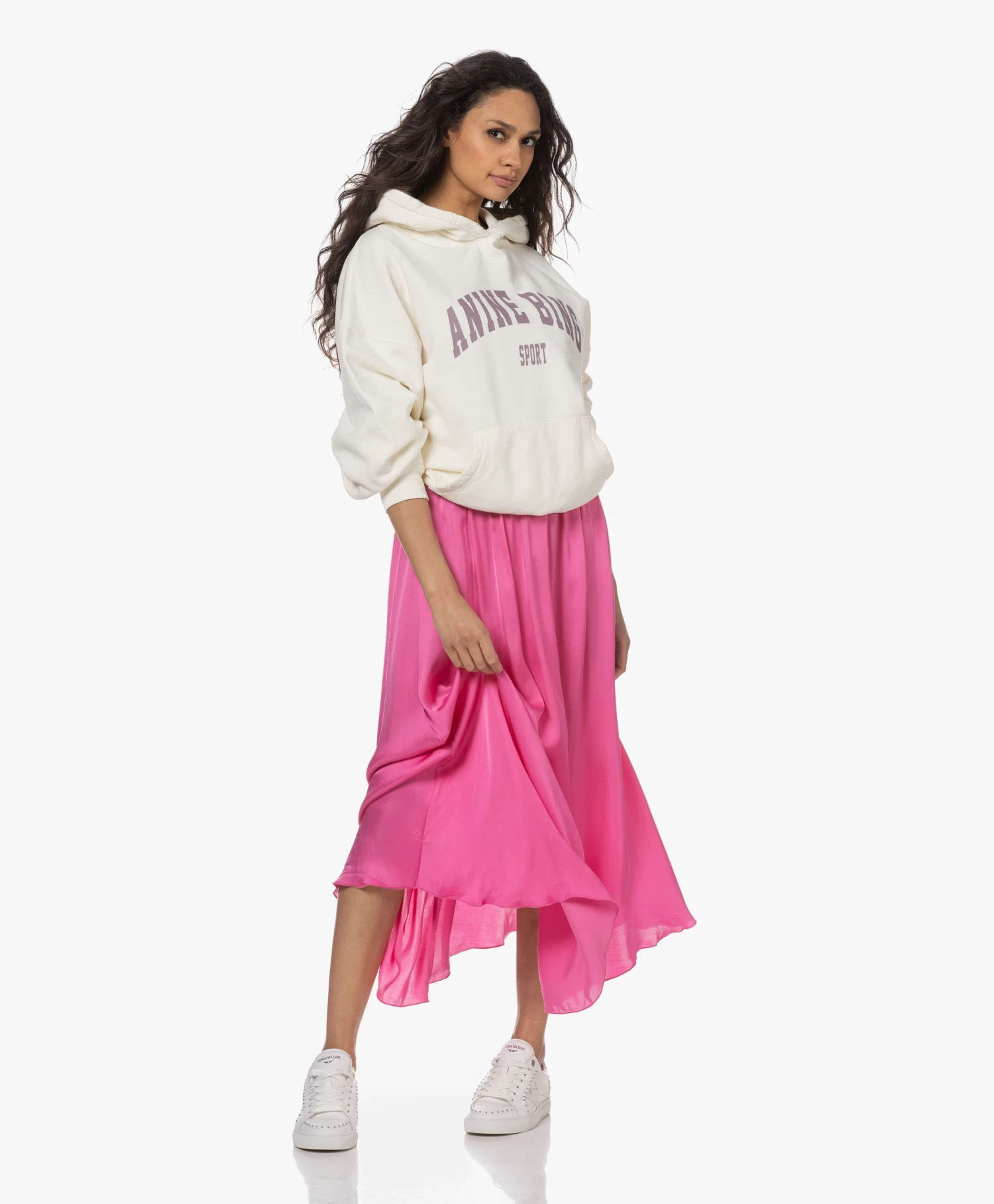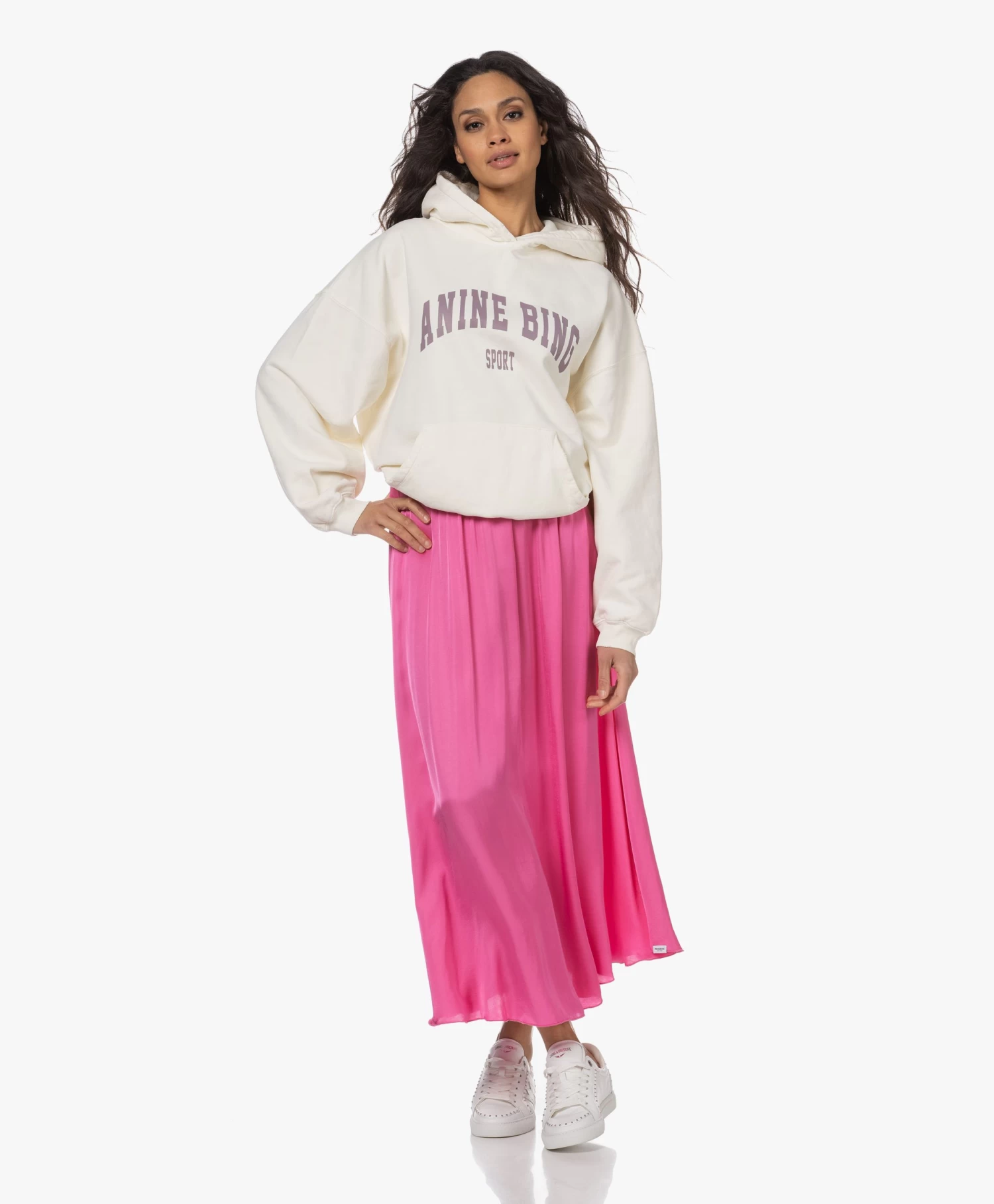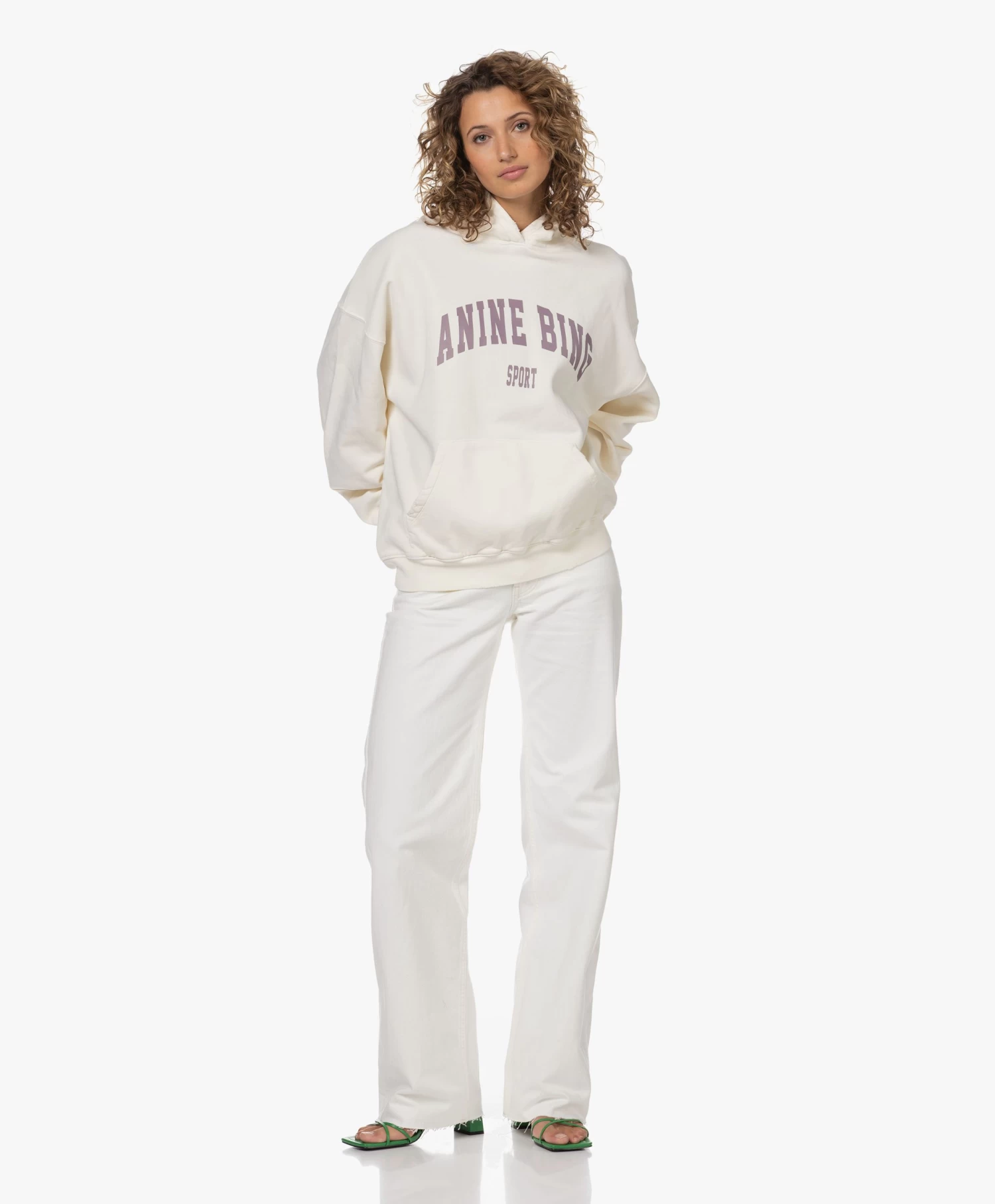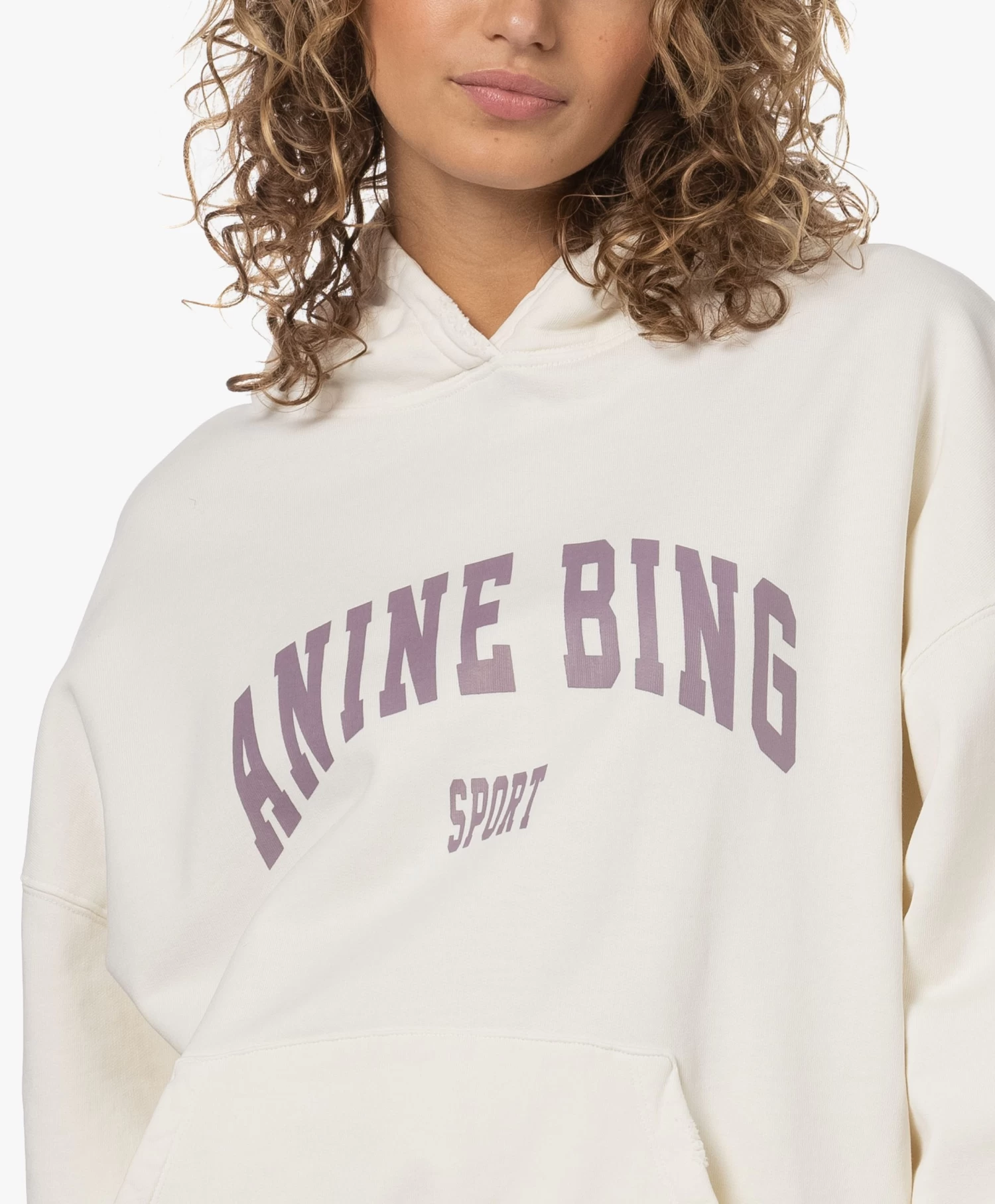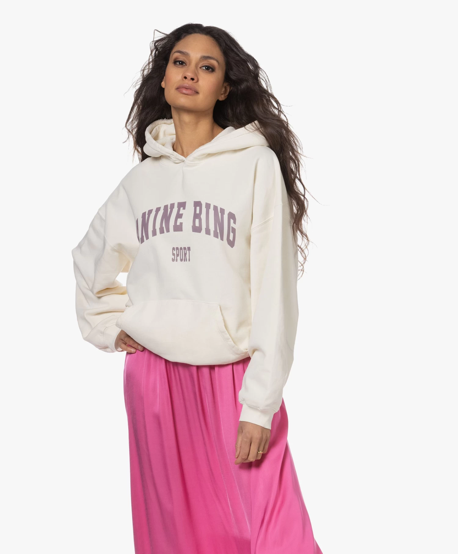 ANINE BING’s off-white Harvey sweatshirt heeft wat ons betreft de ideale pasvorm: gecontroleerd oversized met boorden die precies voldoende aansluiten. Gemaakt van middelzware fleeceback jersey van biologisch katoen, casual gewassen en afgewerkt met verfijnde slijtagedetails. Voorzien van een gevoerde capuchon, een casual buidelzak en een vergrijsd lila graphic op de borst.