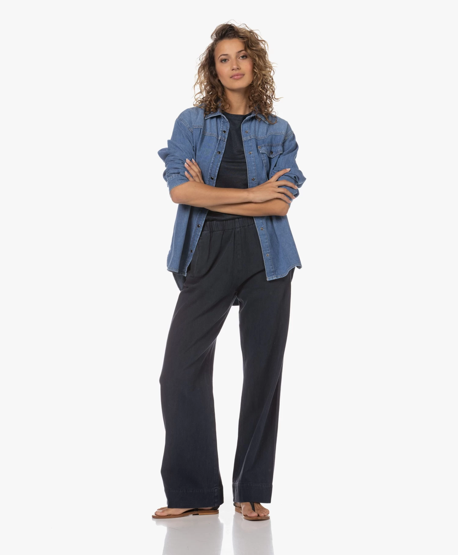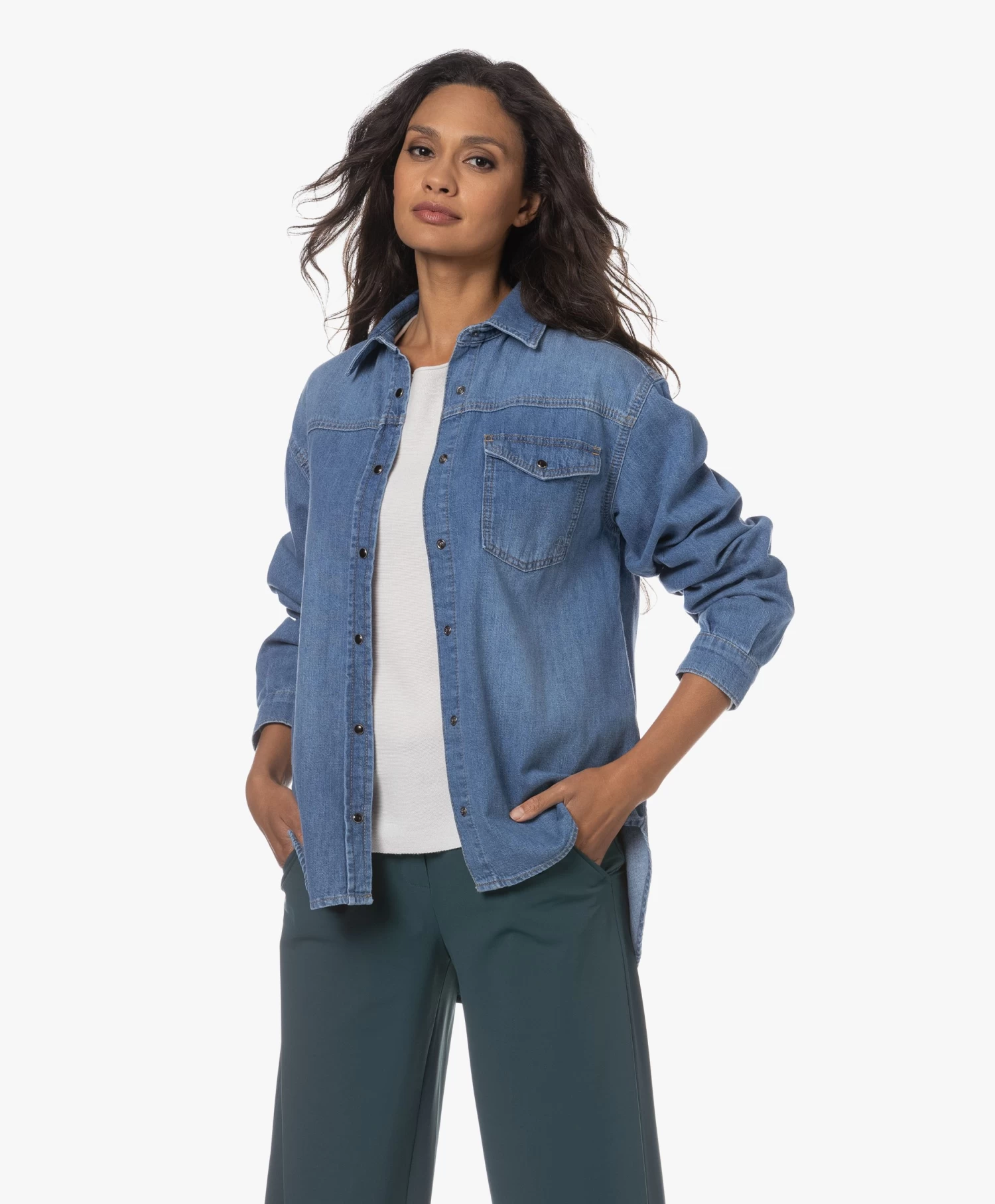 ANINE BING’s middenblauwe denim Sloan shacket heeft een authentieke, no-nonsense uitstraling, waarbij de semi-oversized pasvorm een moderne twist toevoegt. Zacht gewassen, voorzien van ton-sur-ton stiksels en een sluiting met bolvormige drukknopen is dit een musthave voor de fans van relaxte denim looks.