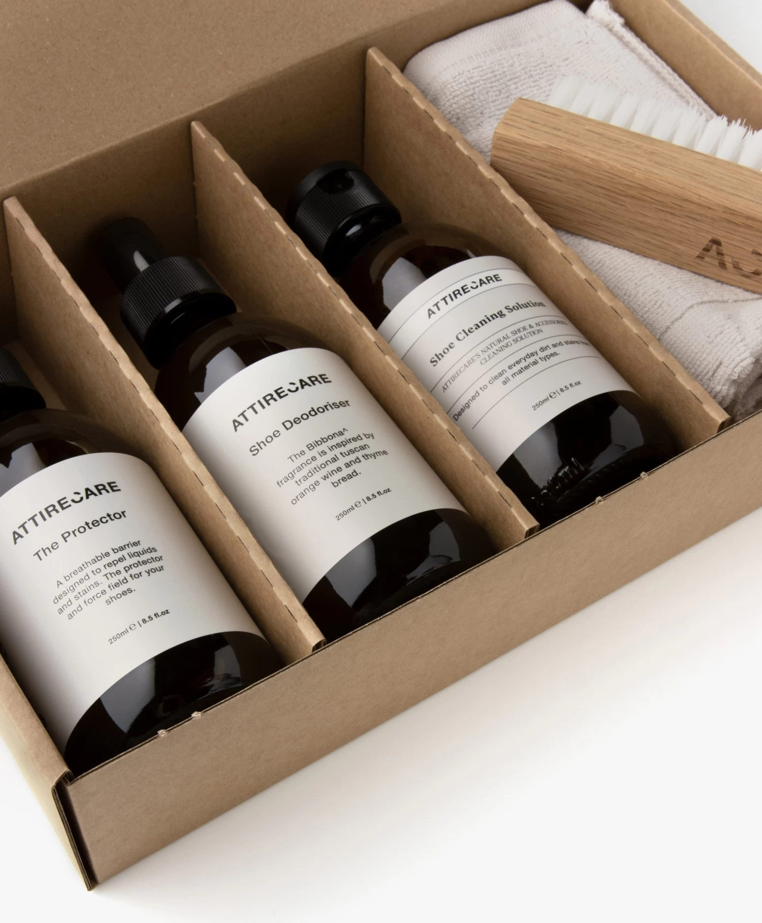 Deze complete schoenverzorgingsset van Attirecare bevat alles om in elke situatie een oplossing te bieden; van bescherming, tot reiniging en ontgeuren van je schoenen – met bijbehorende tools. Deze selectie uit de luxe schoenverzorgingslijn van het milieuvriendelijke merk zorgt voor een ‘zo goed als nieuw’ resultaat. Â