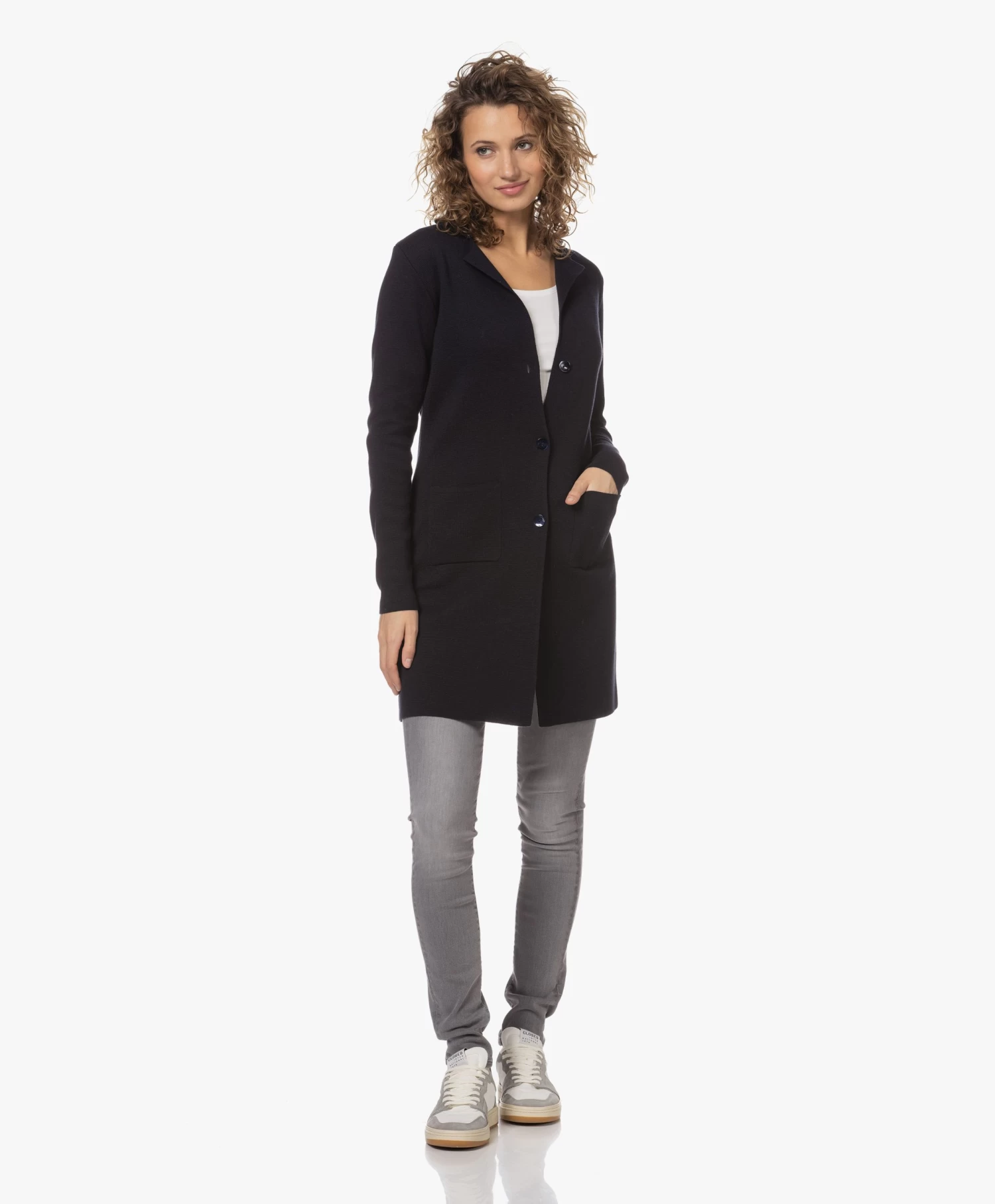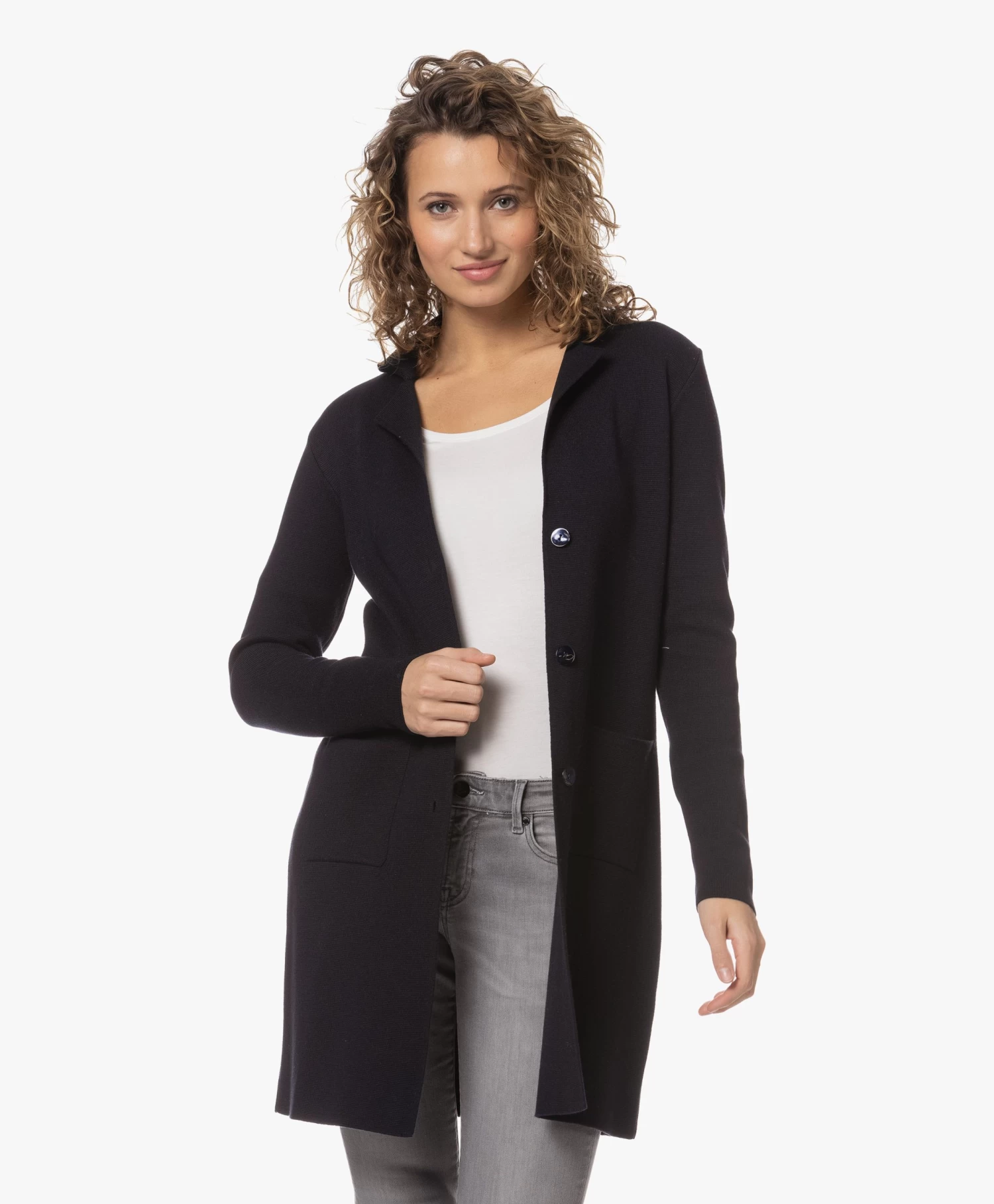 Het comfort van knitwear en de verzorgde uitstraling van een blazer komen stijlvol samen in Belluna’s Clipper blazervest. Het zachte en tegelijkertijd stevige katoenen dubbelbreisel is licht getailleerd voor een vrouwelijk silhouet dat tot royaal onder de heup reikt. De donkerblauwe kleur krijgt een chic accent met glanzende parelmoerknopen.