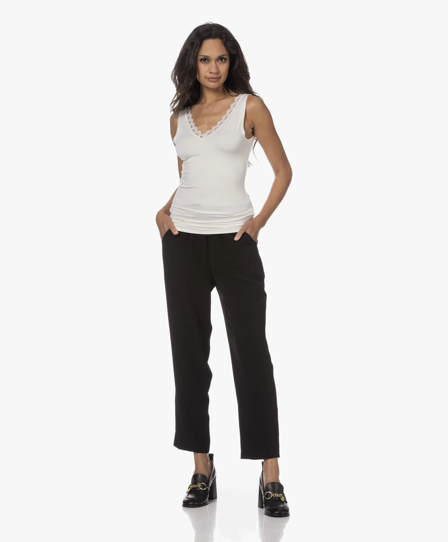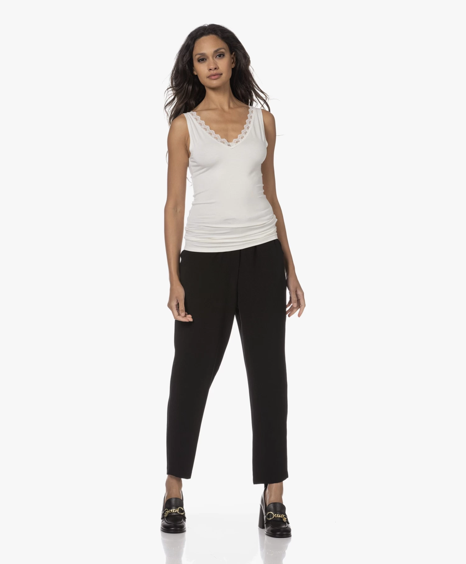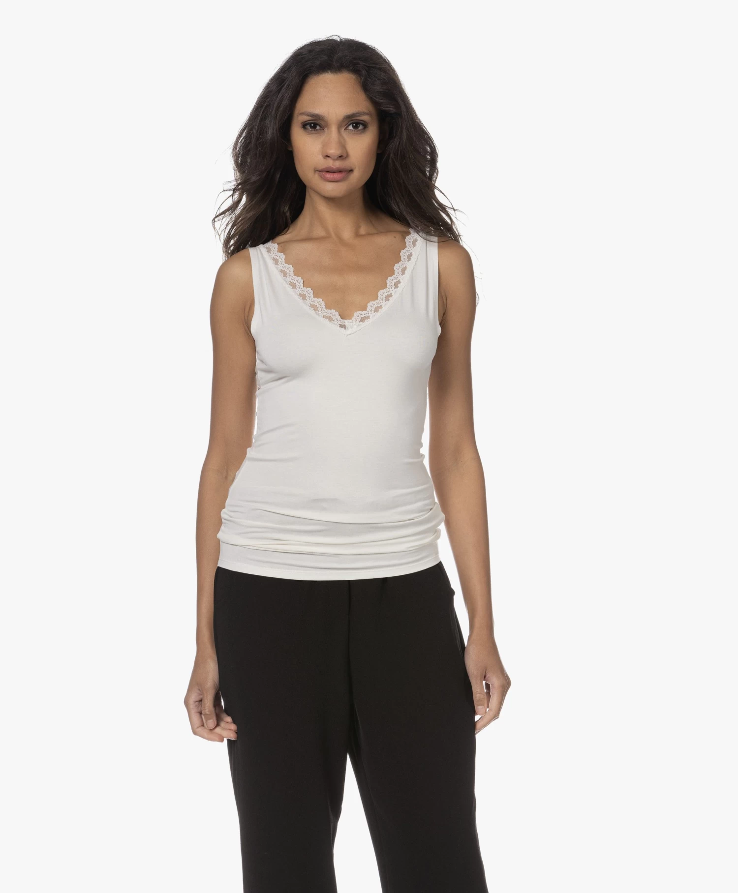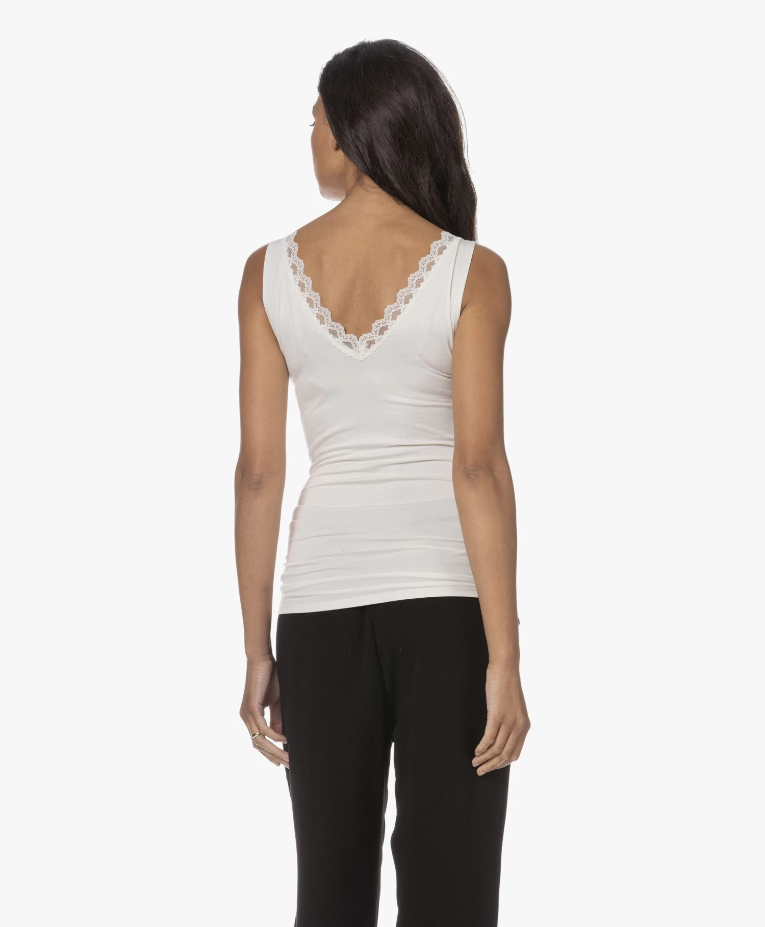 by-bar brengt de meest zachte én stijlvolle basis voor iedere look met deze off-white top. De top heeft een V-hals aan zowel de voor- als achterkant en is afgewerkt met geschulpt kant – gemaakt van een soepele, zacht geborstelde viscose jersey met extra stretch.