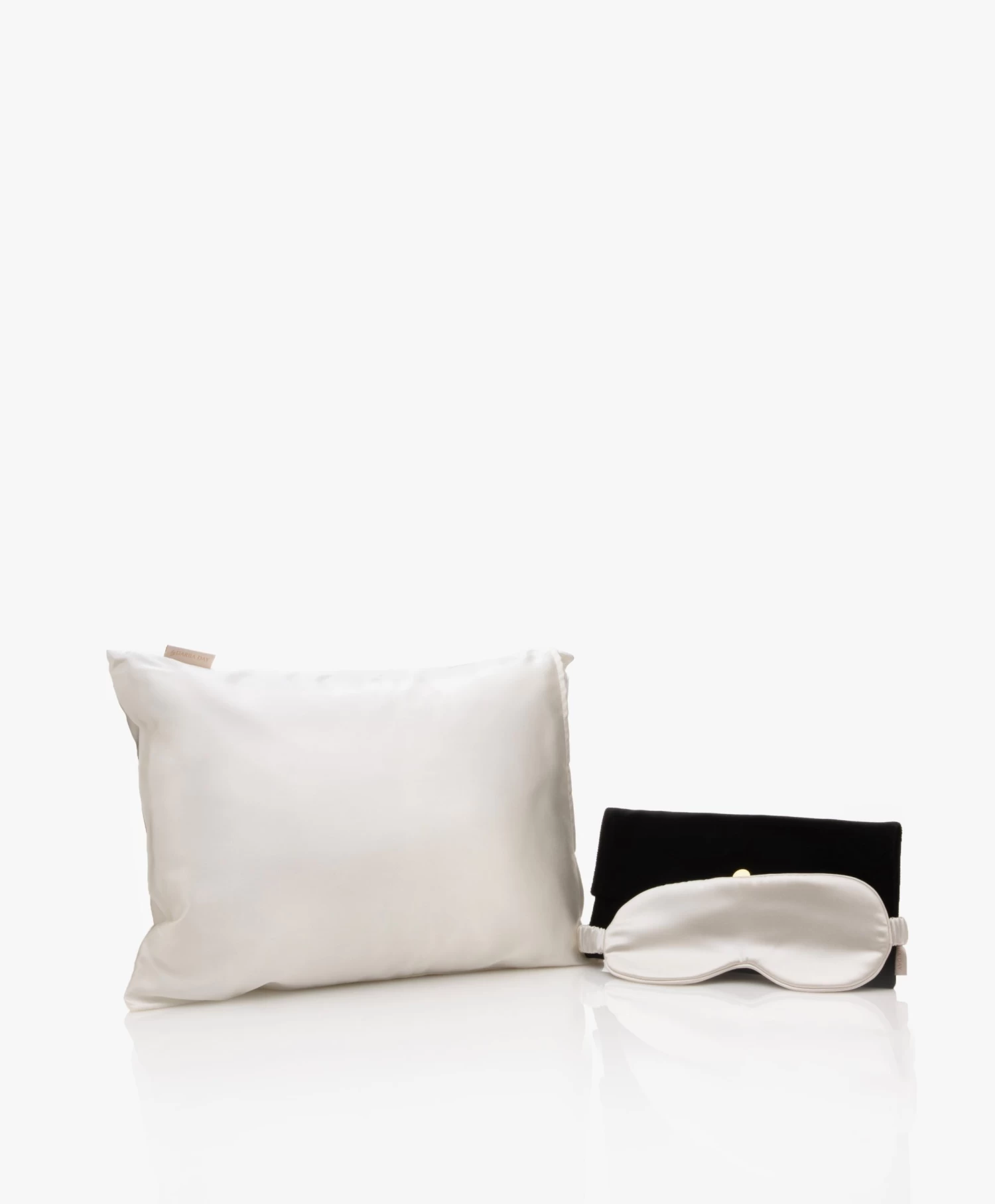 Reis je veel? Dan stellen wij je graag voor aan de meest luxe metgezel voor je huid en haar. Deze travel set in off-white van By Dariia Day bevat een zijden kussensloop met bijpassend slaapmasker én een compact-formaat kussen met duurzame Luxfill vulling. Gemaakt van de hoogste kwaliteit Mulberry zijde met de perfecte zachtheid, dikte en glans om de meest gevoelige huid- en haartypes te beschermen tegen (slaap)rimpels, out-of-bed haar, gespleten haarpunten, én te zorgen voor een uitgerust gevoel – ook op reis!