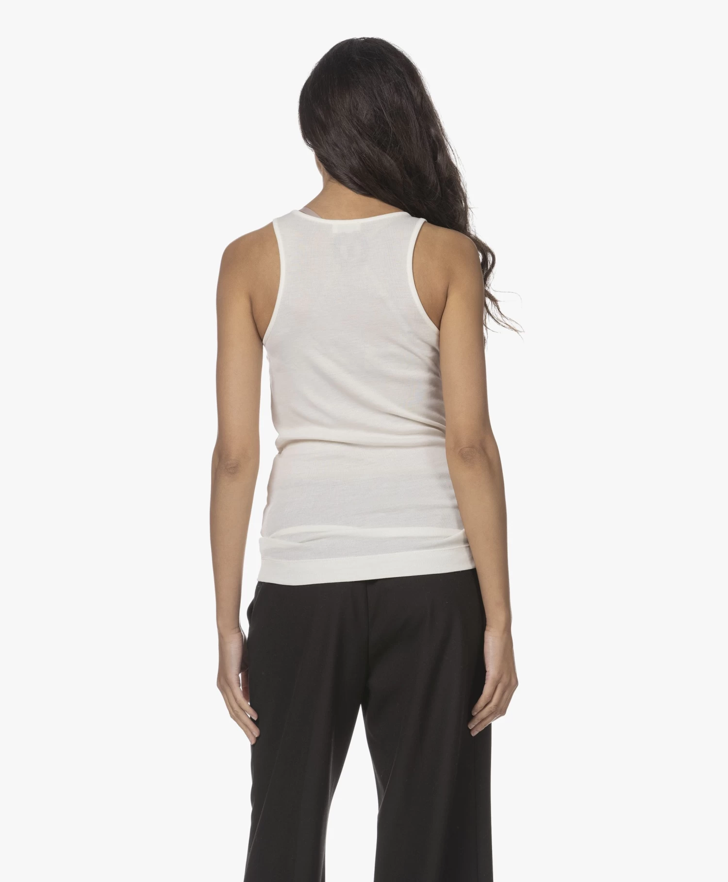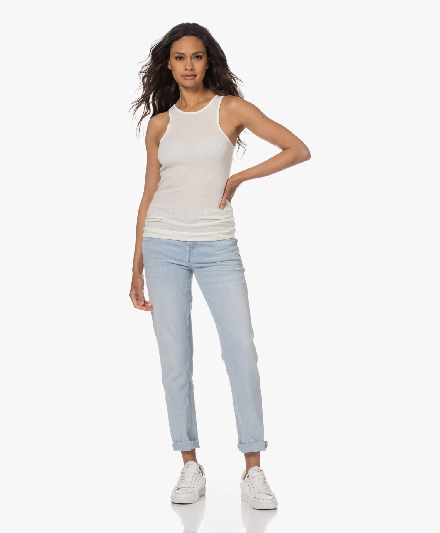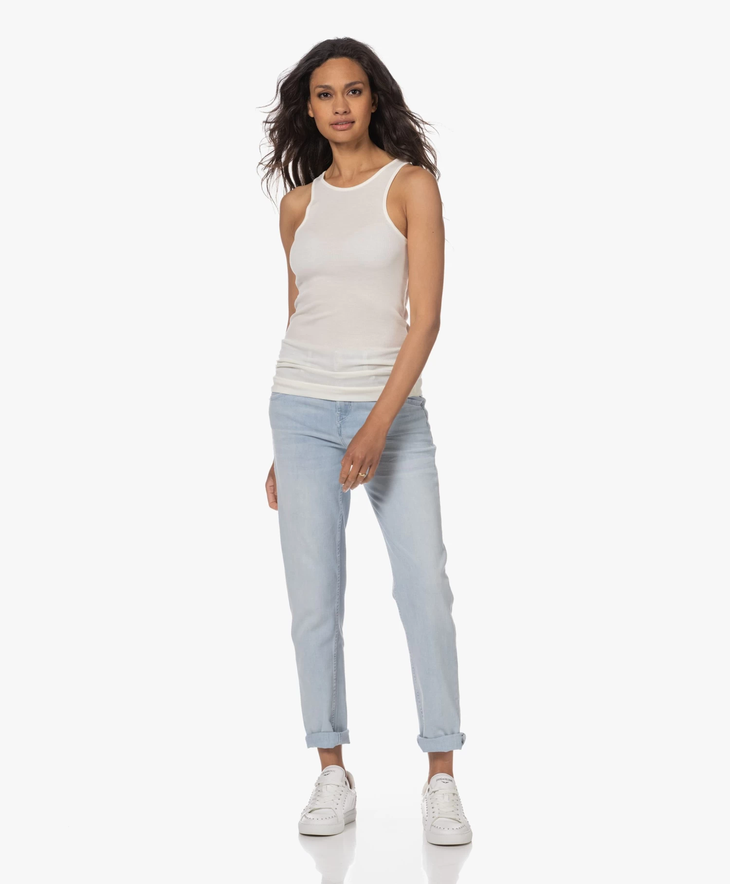 By Malene Birger’s Amieeh top is een essential met karakter en handige eigenschappen. De hogere ronde hals aan de voor- en achterzijde en de smalle schouderbandjes leggen het accent op je schouders. Deze vorm is ook reuze handig als je een diepe V-hals iets minder ‘bloot’ wilt dragen! De slim-fit top is gemaakt van duurzame Lyocell ribjersey met een natuurlijke stretch, in veelzijdig off-white.