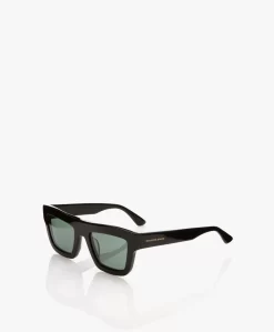 Vooruitstrevende monturen domineren het zonnebrillenseizoen, waarbij By Malene Birger’s Mayshi de minimalistisch-luxe stijl van het Deense merk vertegenwoordigt. Deze zwarte zonnebril heeft een trapeziummontuur met afgeronde hoeken en donkergroen getint glas. De pootjes zijn voorzien van een goudkleurig designerlogo.