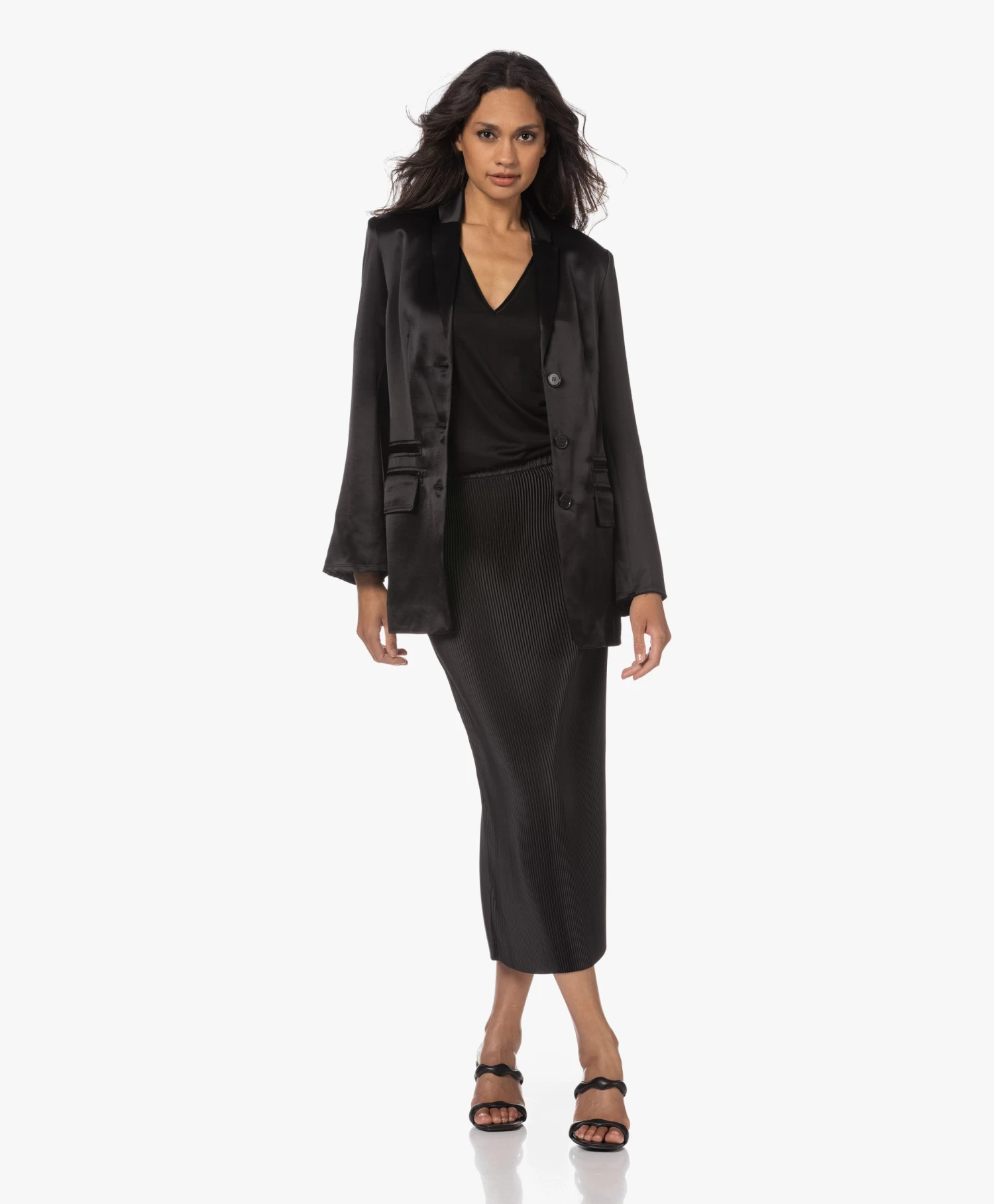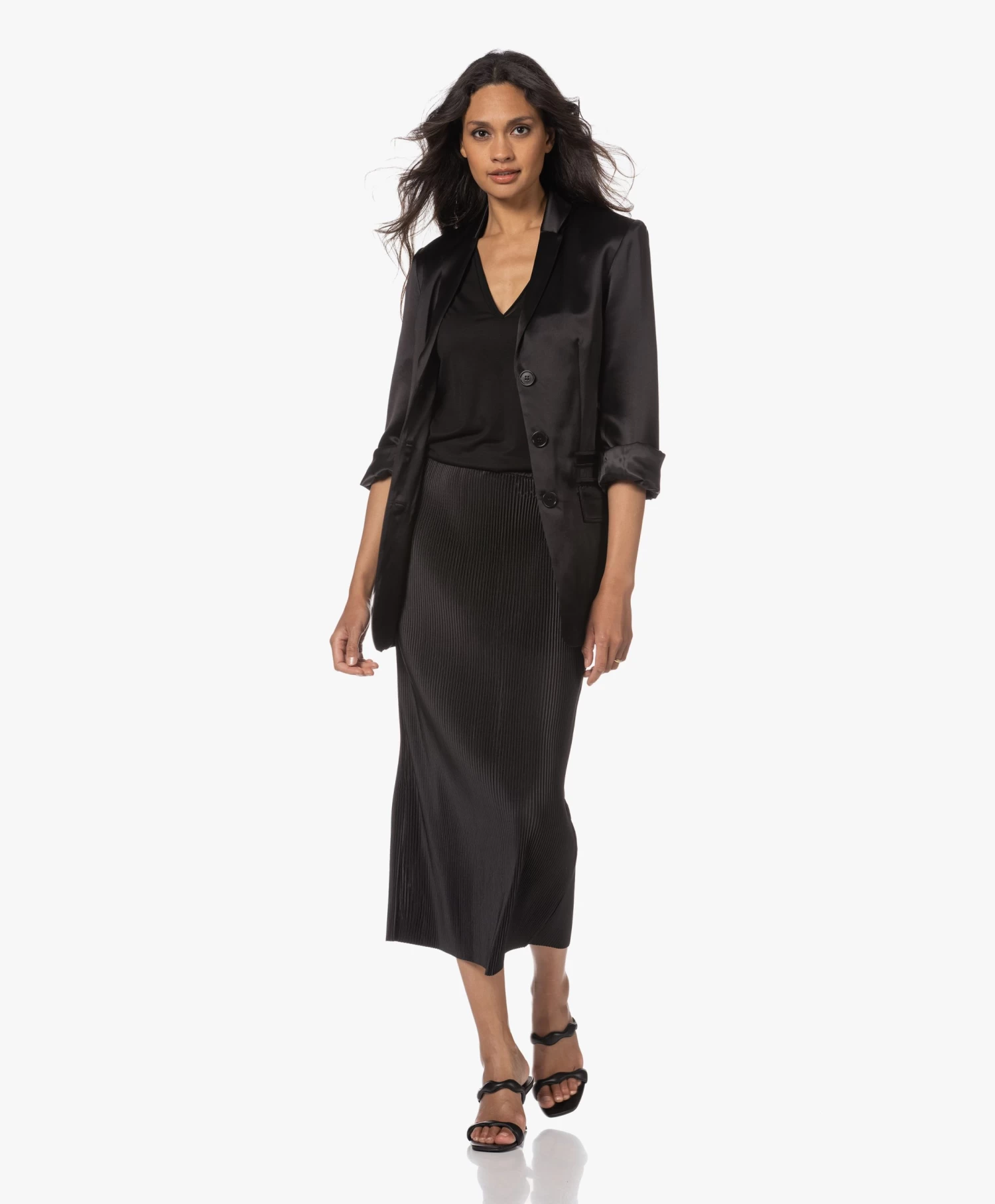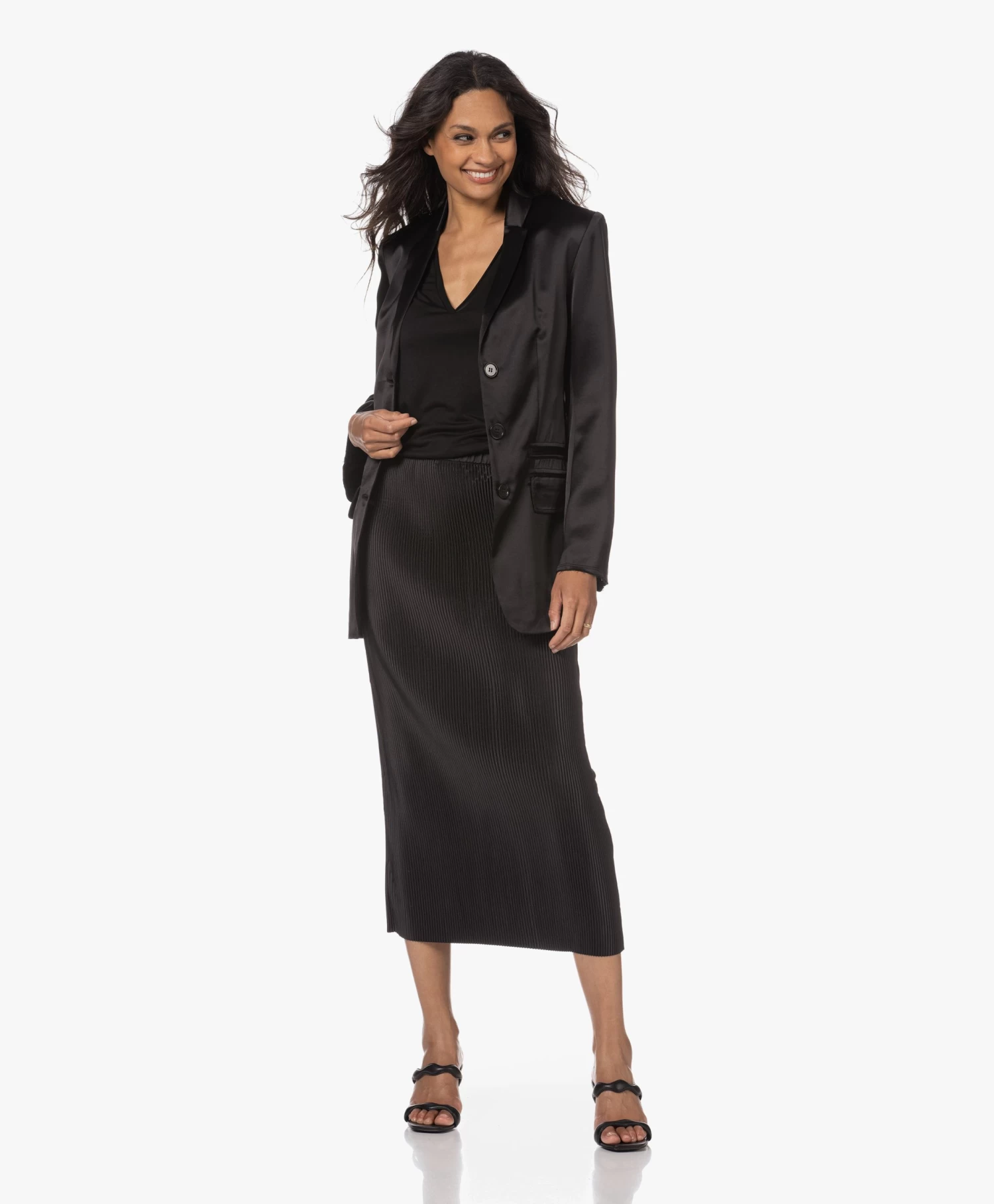 Repeterende structuren, vloeiende vormen: de natuur is een grote bron van inpiratie voor By Malene Birger. De fijne plisséplooien van de zwarte Velmas midi-rok creëren een kaarsrecht silhouet met voldoende ruimte voor beweging. Ondanks de goede rekbaarheid van de glanzende plisséstof raden we je aan de maat niet te klein te nemen: als je de rok ‘opvult’ worden de plooien gladgestreken en dat gaat ten koste van de stijl.