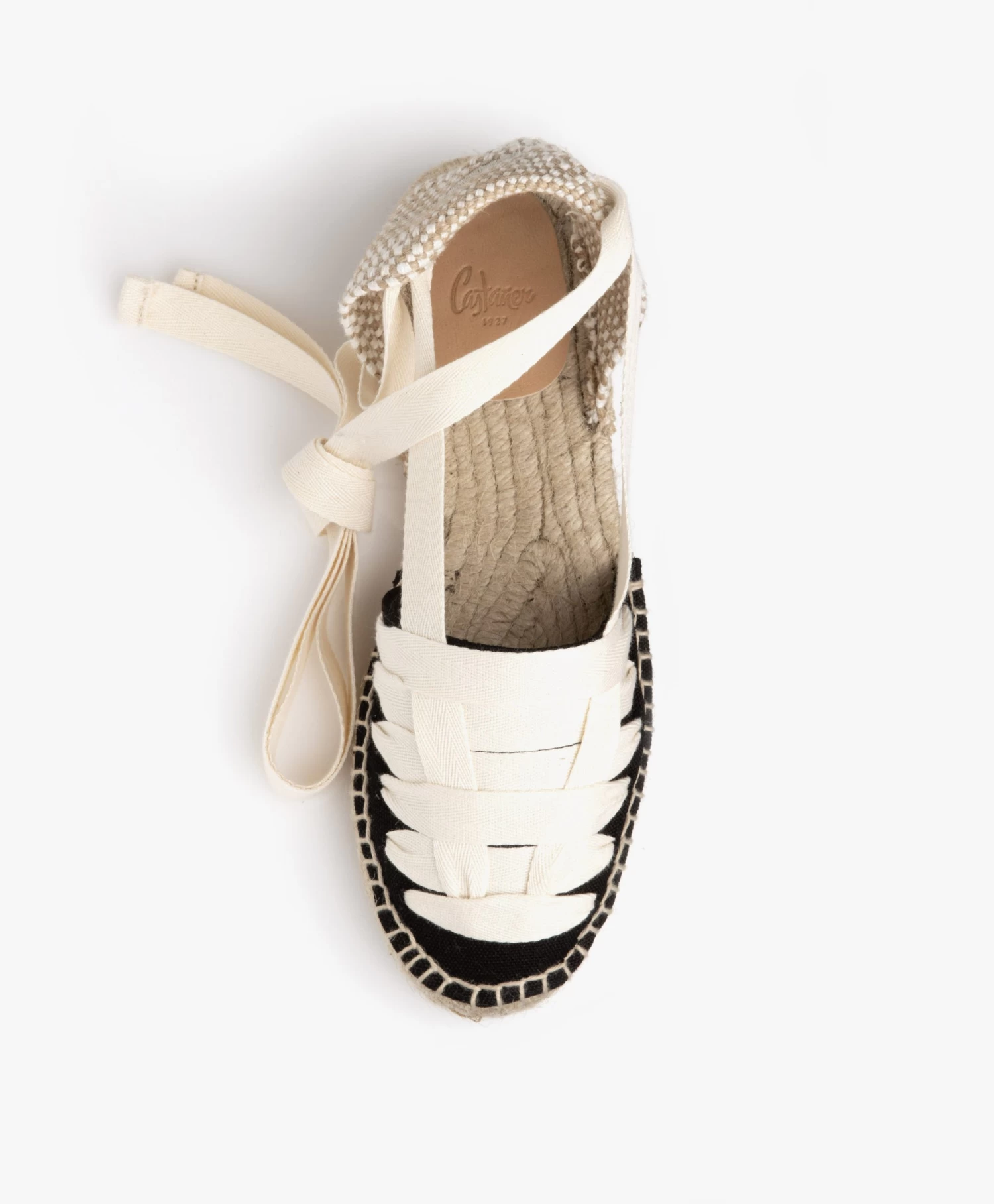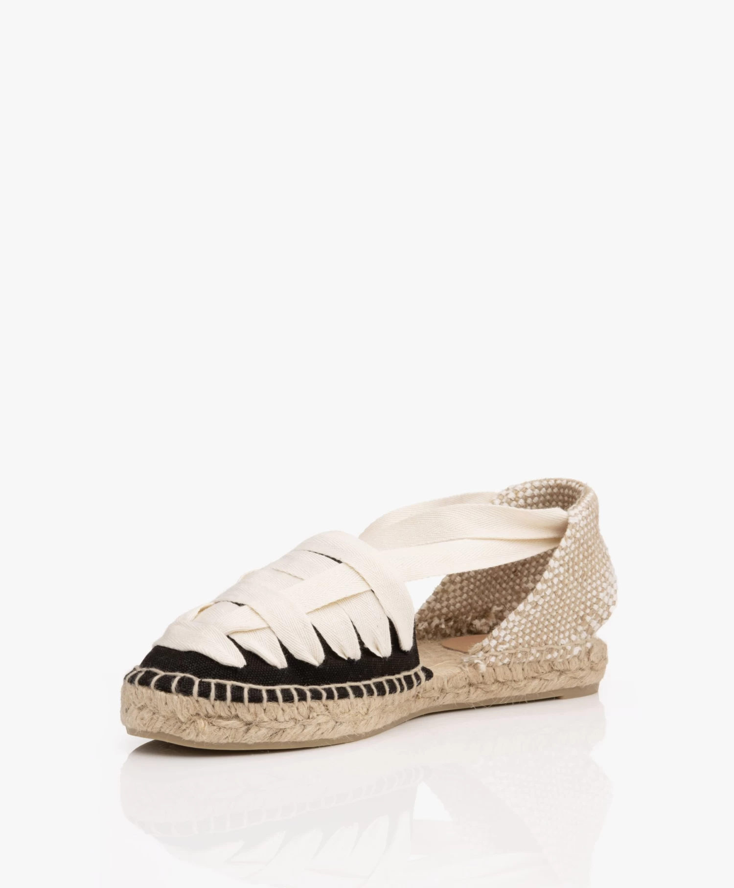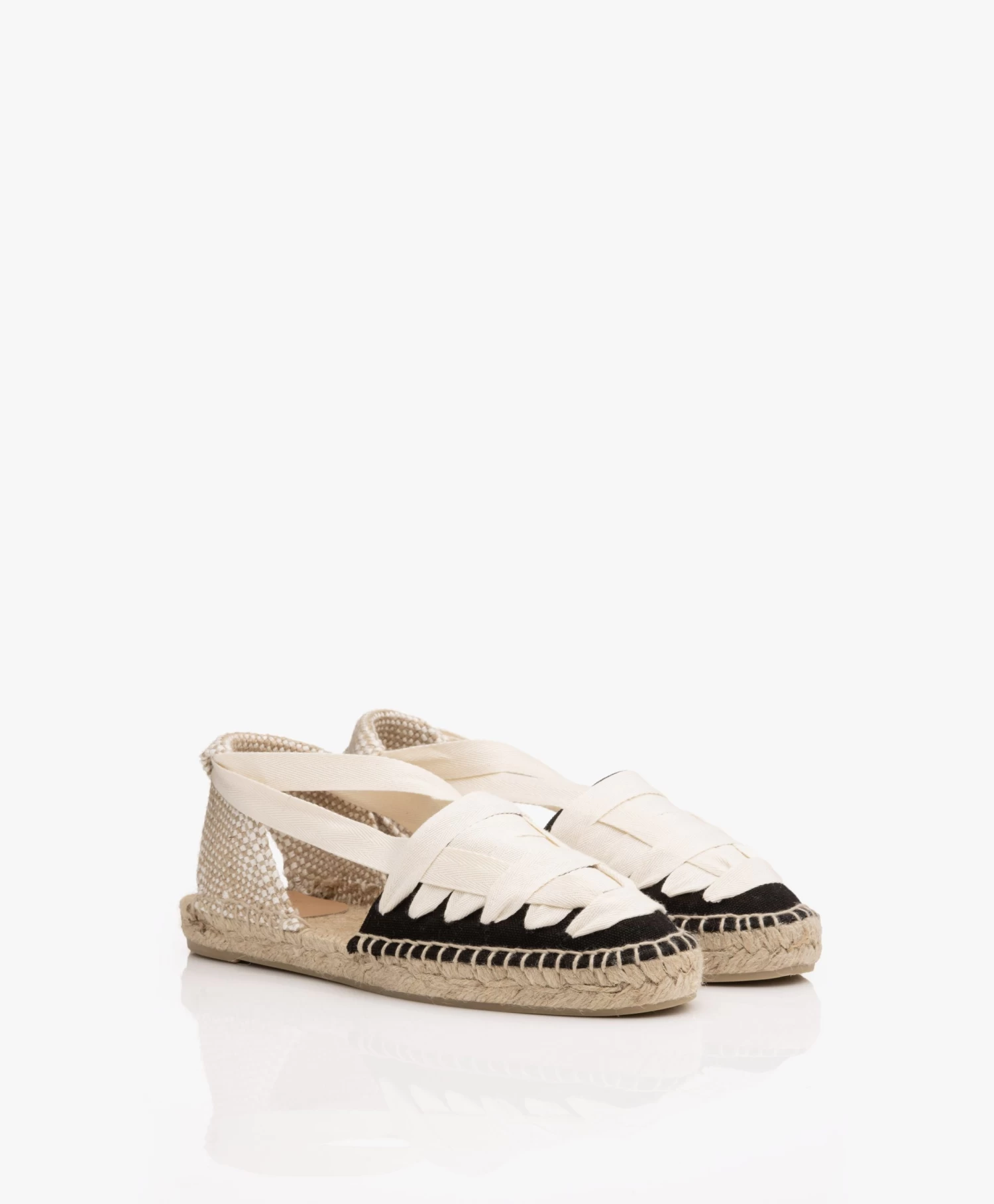 Deze Jean espadrille sandalen van Castañer springen in het oog door de off-white grosgrain linten met visgraatmotief die de zwarte canvas neus sieren. Een uniek ontwerp waarin dezelfde linten als striksluiting dienen om de enkels voor een elegante uitstraling. De two-tone geweven hiel in off-white en beige geeft extra loopcomfort net als de stevige jute zool. Strikken maar en je bent good to go!