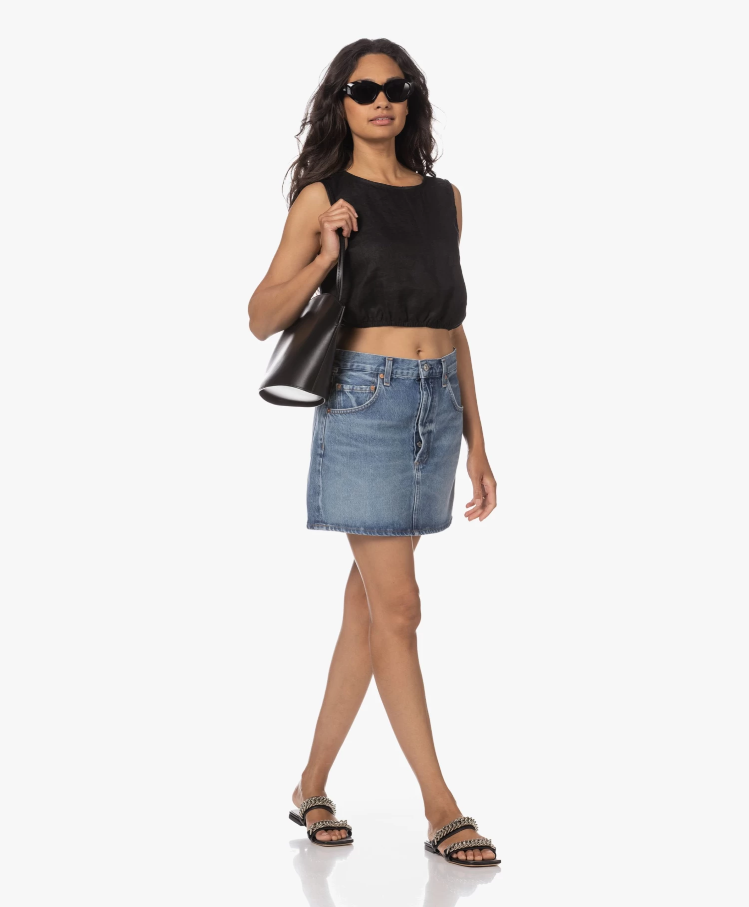 Als onvervalst denim-merk kan Citizens of Humanity uiteraard niet om de klassieke 5-pocket minirok heen. Toch drukt het merk er een uniek eigen stempel op: de middenblauwe Eden mini rok is ontworpen in een uiterst subtiele A-lijn en valt daardoor net even iets relaxter bij de zoom. De geschakeerde wassing is geïnspireerd op 90s denim.