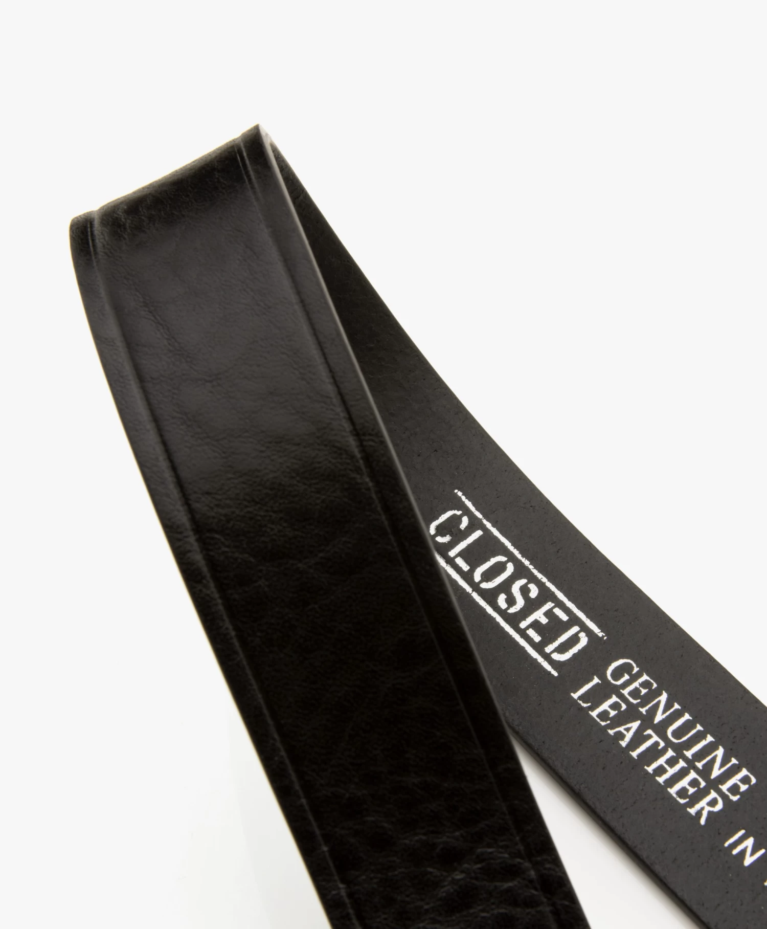 Deze zwarte riem van Closed heeft zilverkleurige hardware waardoor een chique uitstraling ontstaat. De luxe leerkwaliteit heeft een subtiele nerf en een debossed omlijning voor een klassieke feel. Zes gaatjes maken het mogelijk de riem op verschillende wijdtes te dragen.