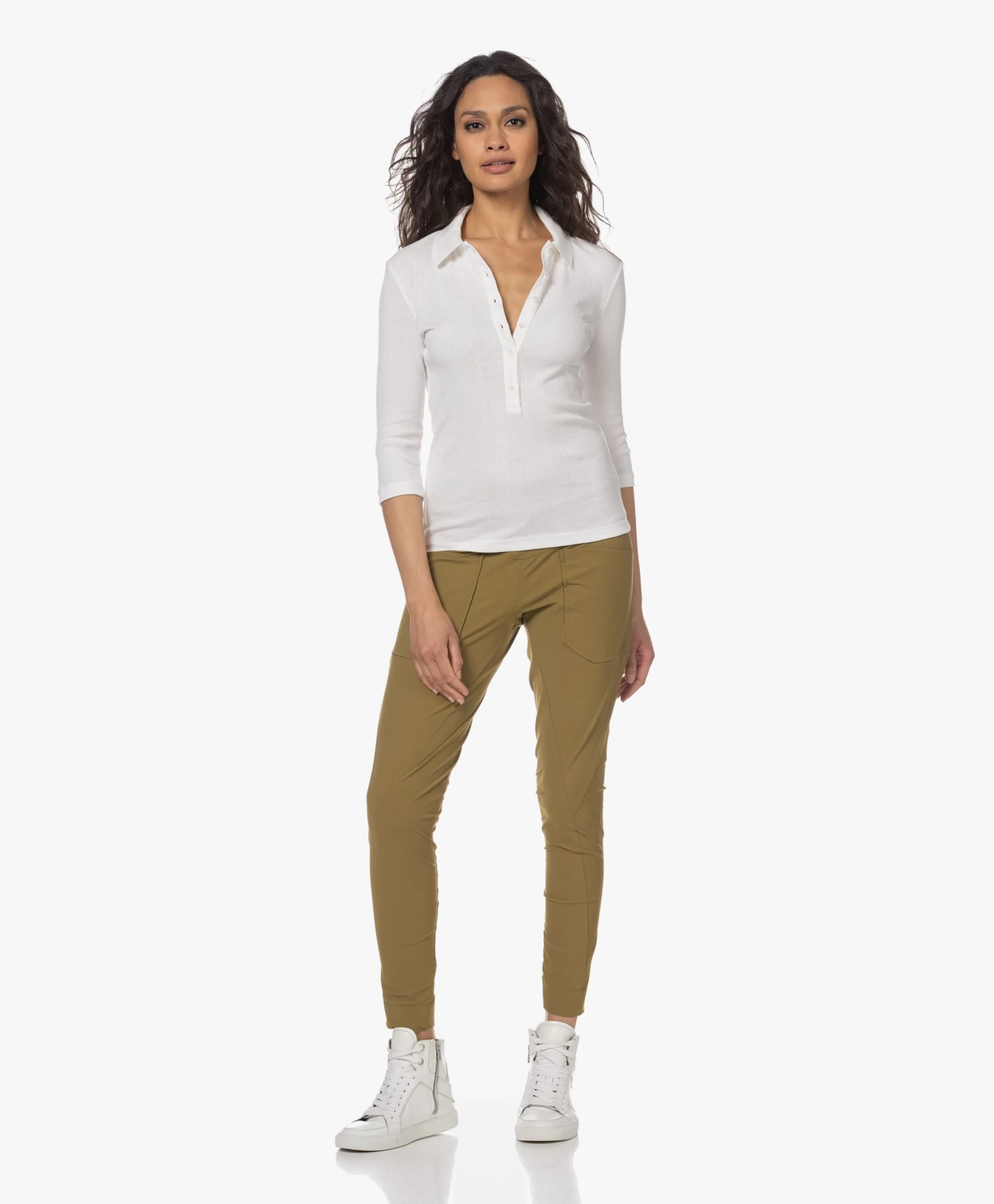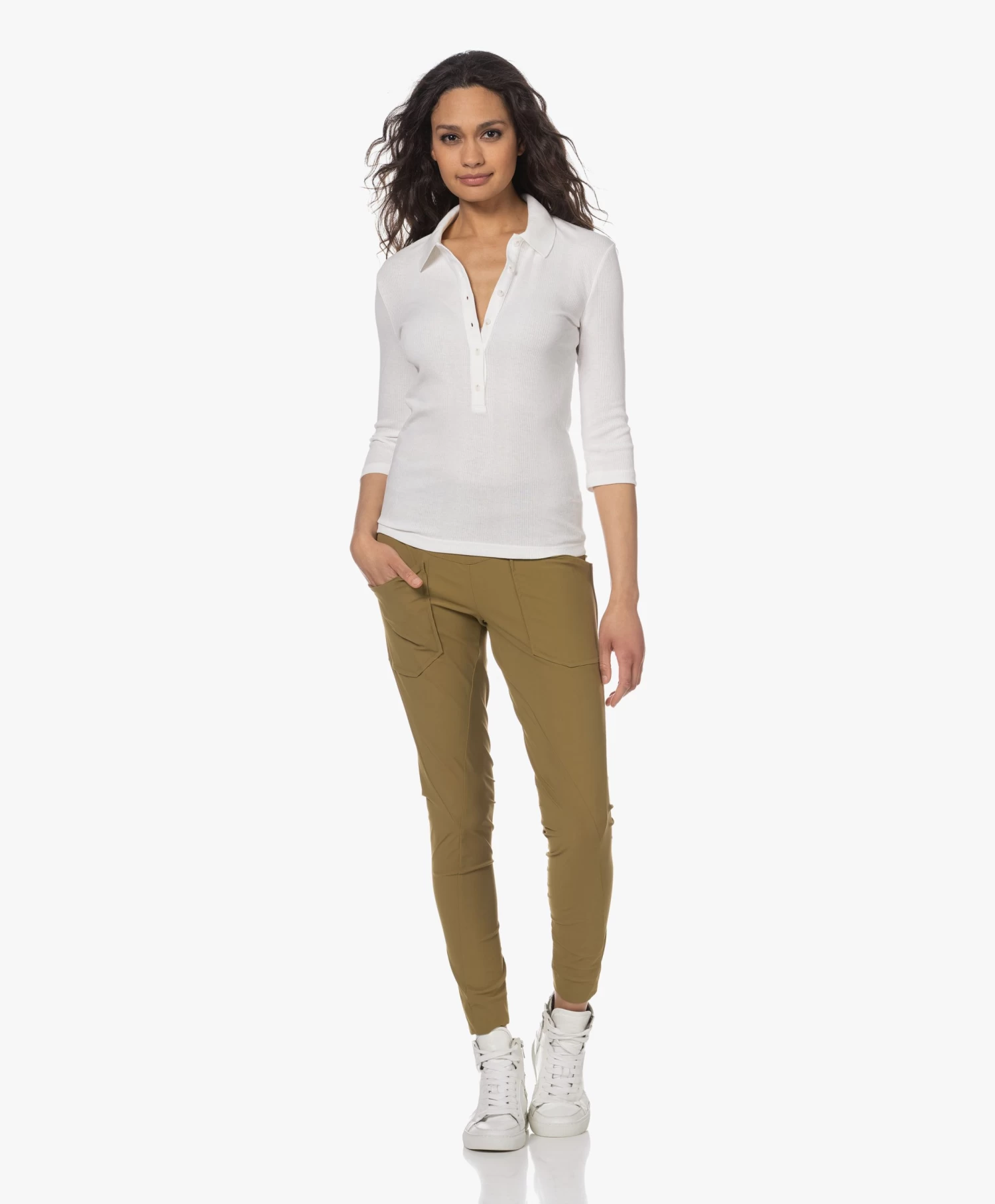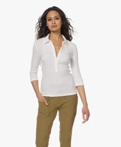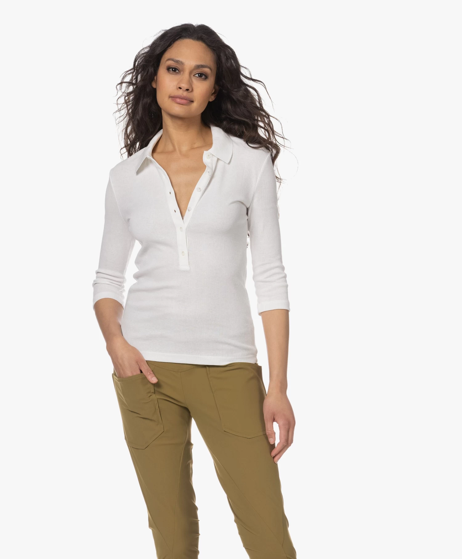 Alle ogen zijn dit seizoen gericht op de polo: een klassieker waar Closed wel raad mee weet. Deze off-white polo met slanke driekwartmouwen is gemaakt van katoenmix ‘getrokken naald’ rib-jersey die subtiel knipoogt naar de masculiene oorsprong van het poloshirt.