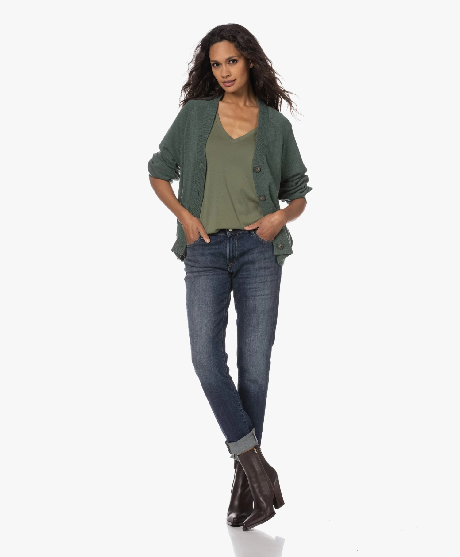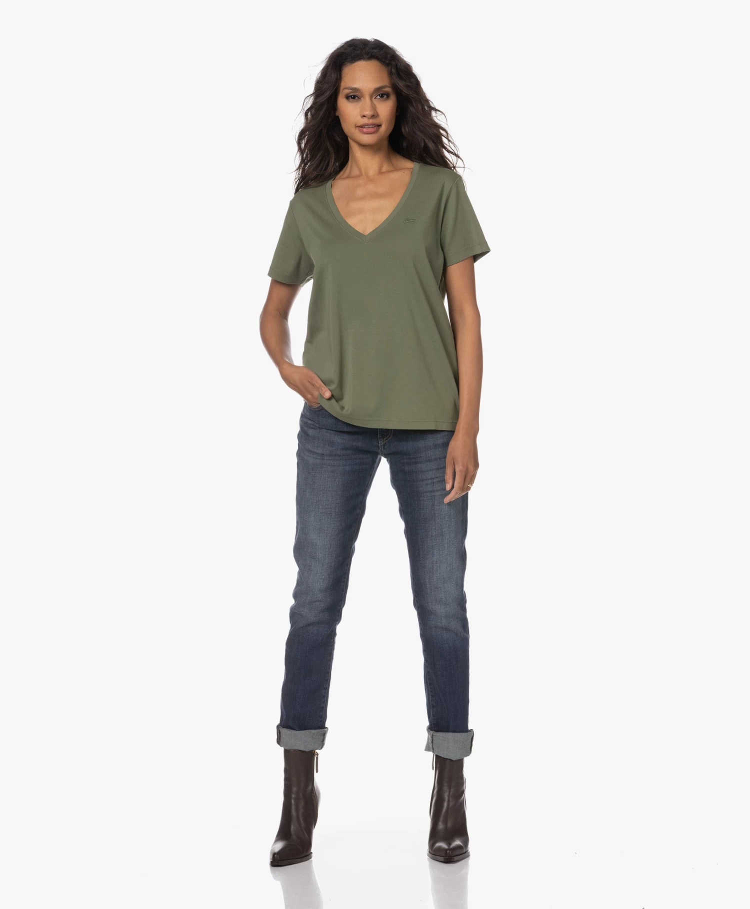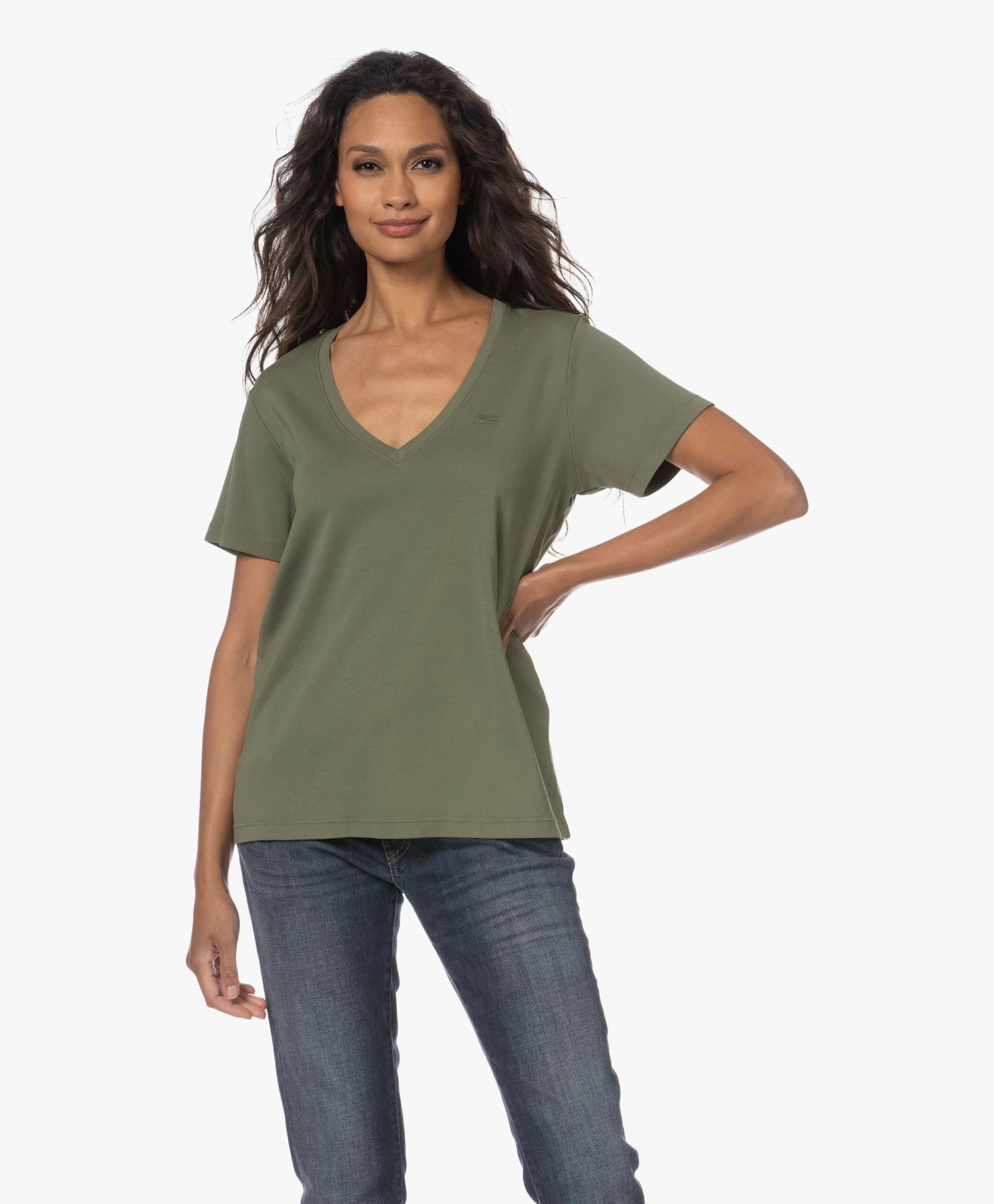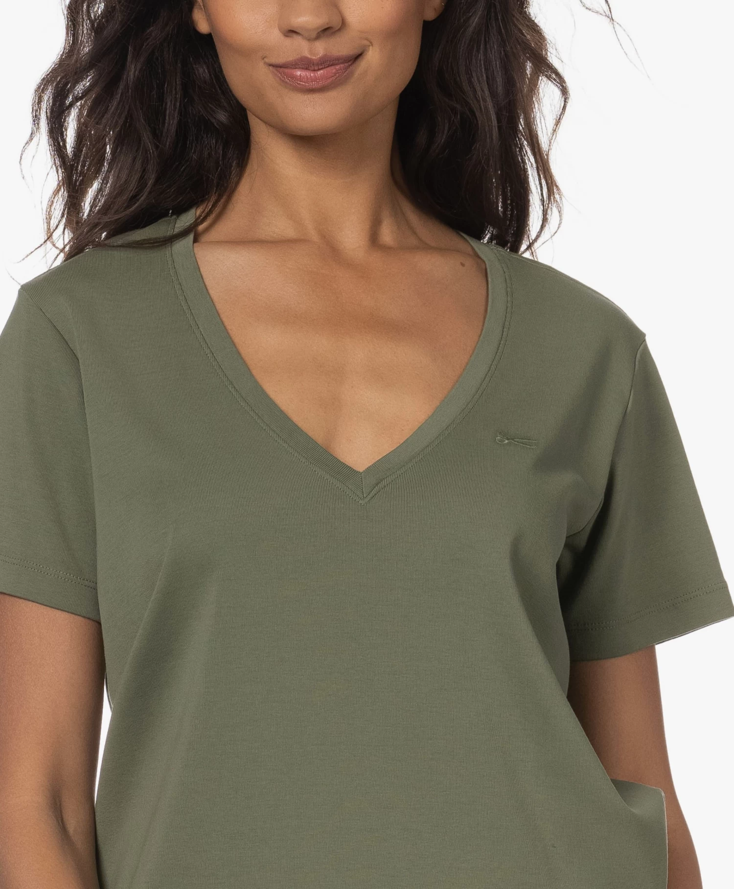 – Wijde, diepe V-hals, dubbellaagse afwerking
