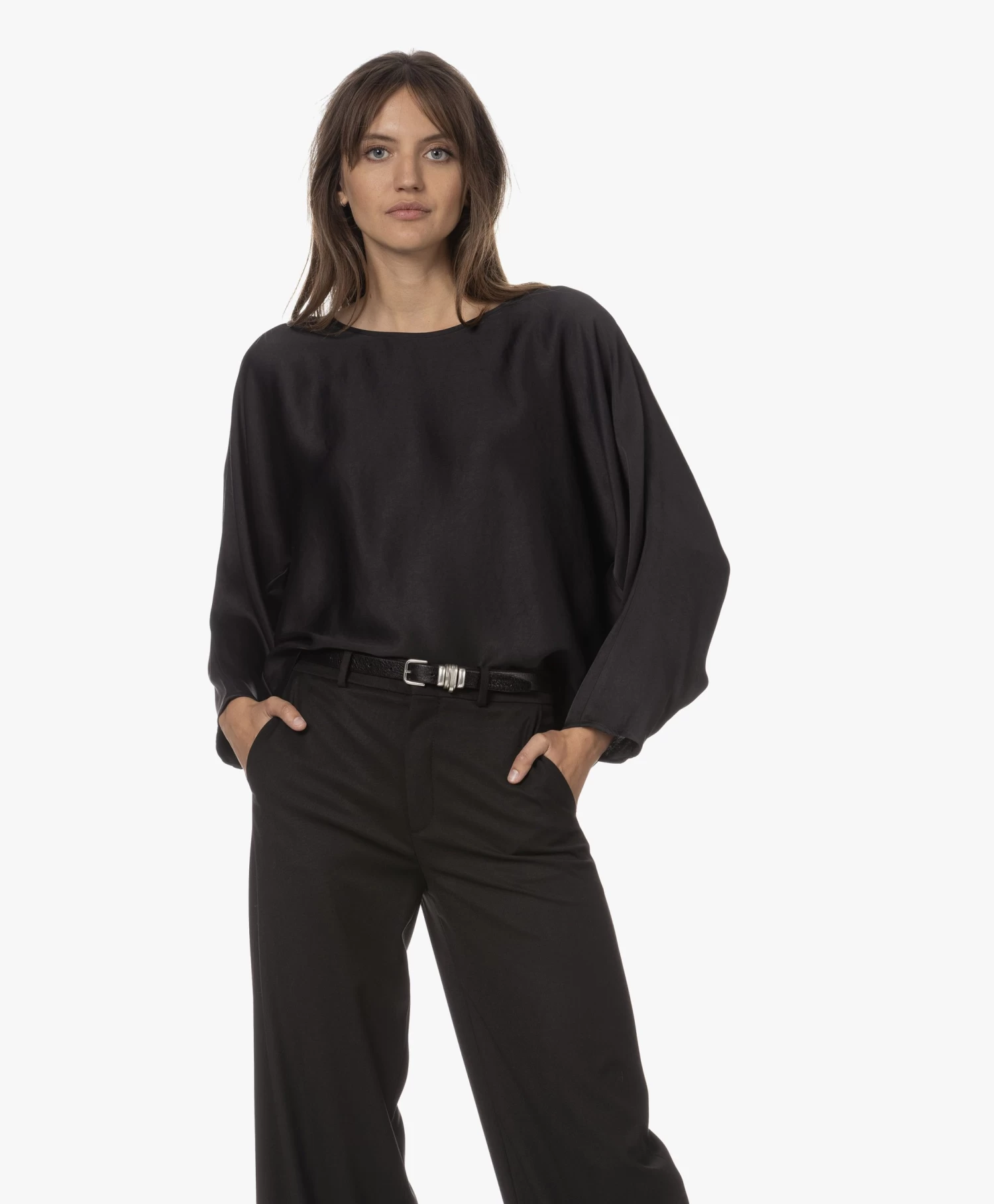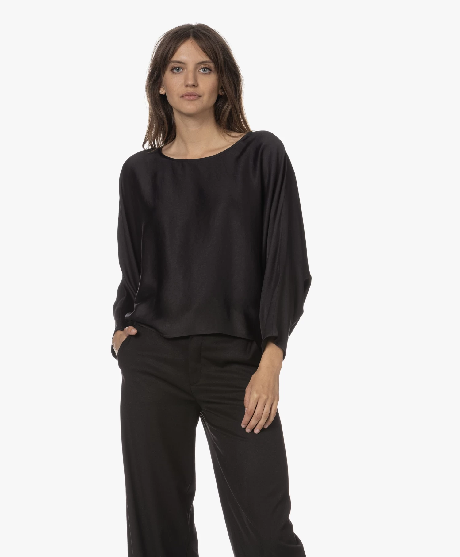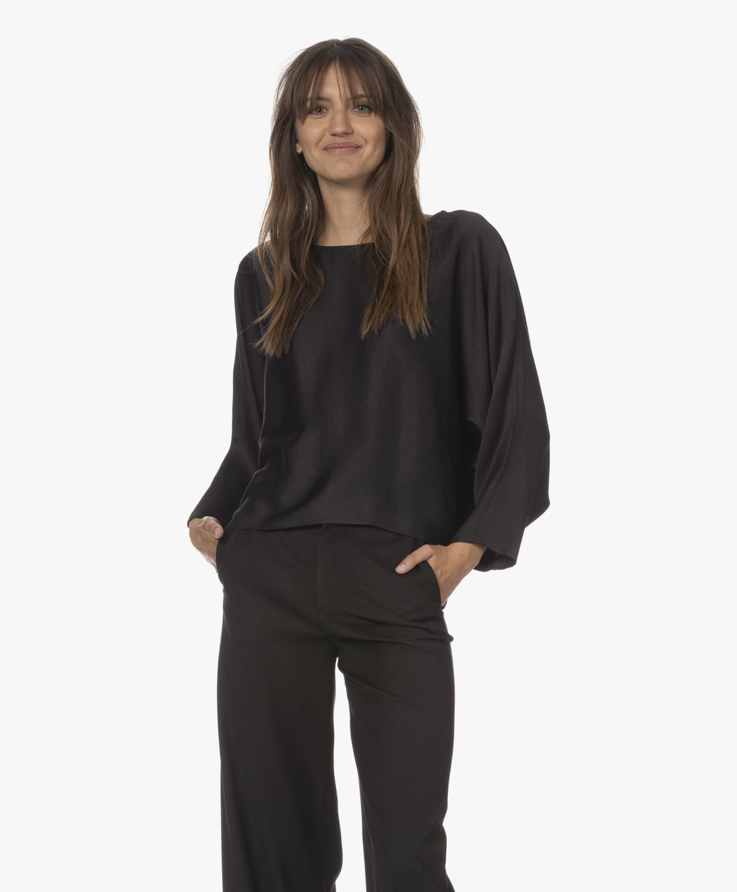 Simplistisch, doch verfijnd omschrijft blouse Nialini van Drykorn tot in detail. Met de zwarte kleur en de elegante vleermuismouwen zet het merk de minimalistische, luxe feel door die benadrukt wordt door de fijngeweven materialenmix met viscose. Het iets kortere voorpand oogt speels en eigentijds.