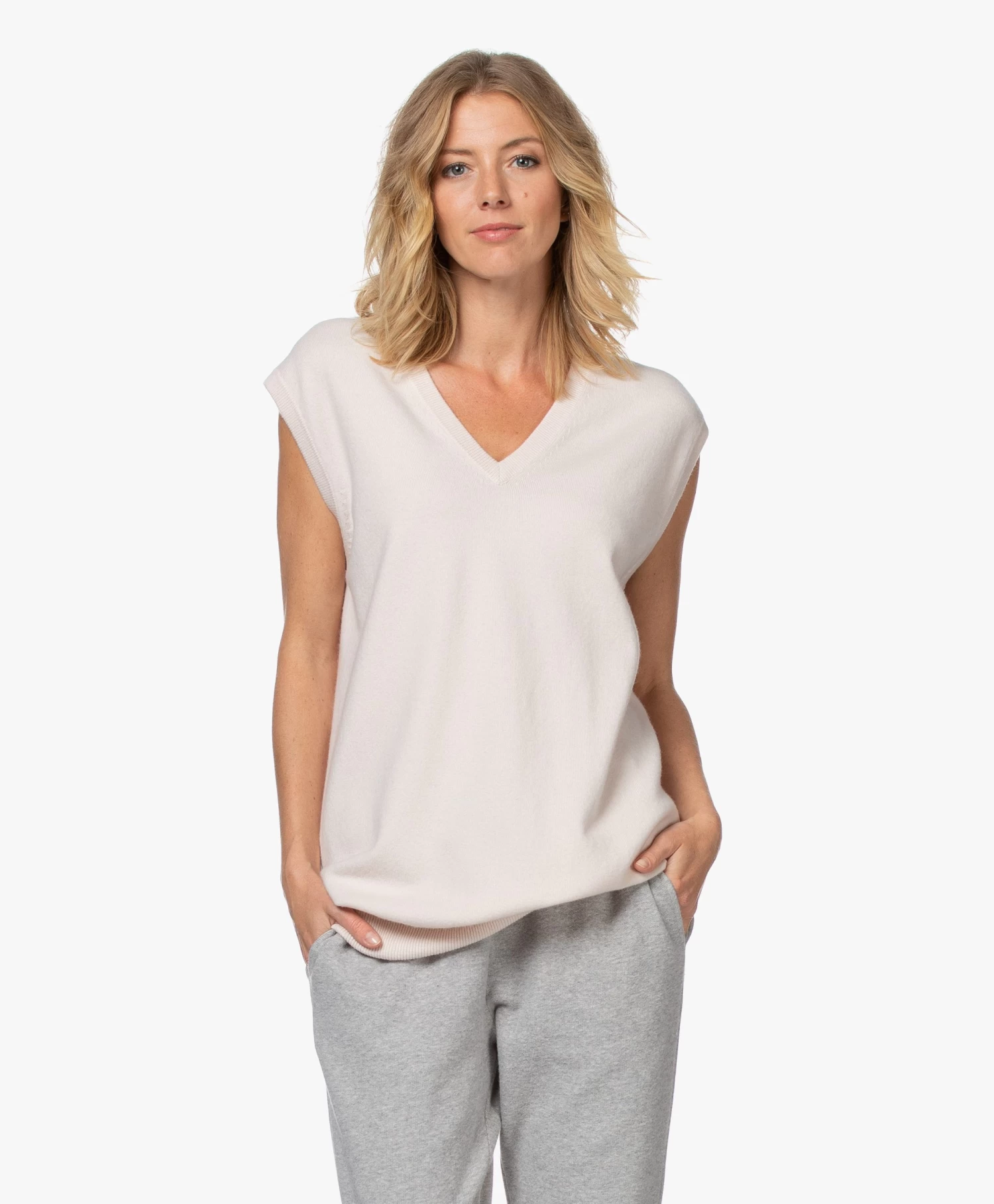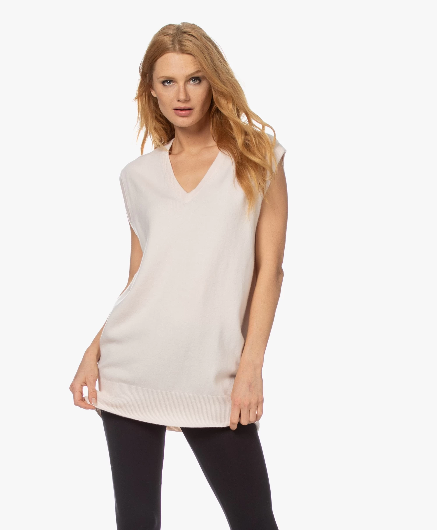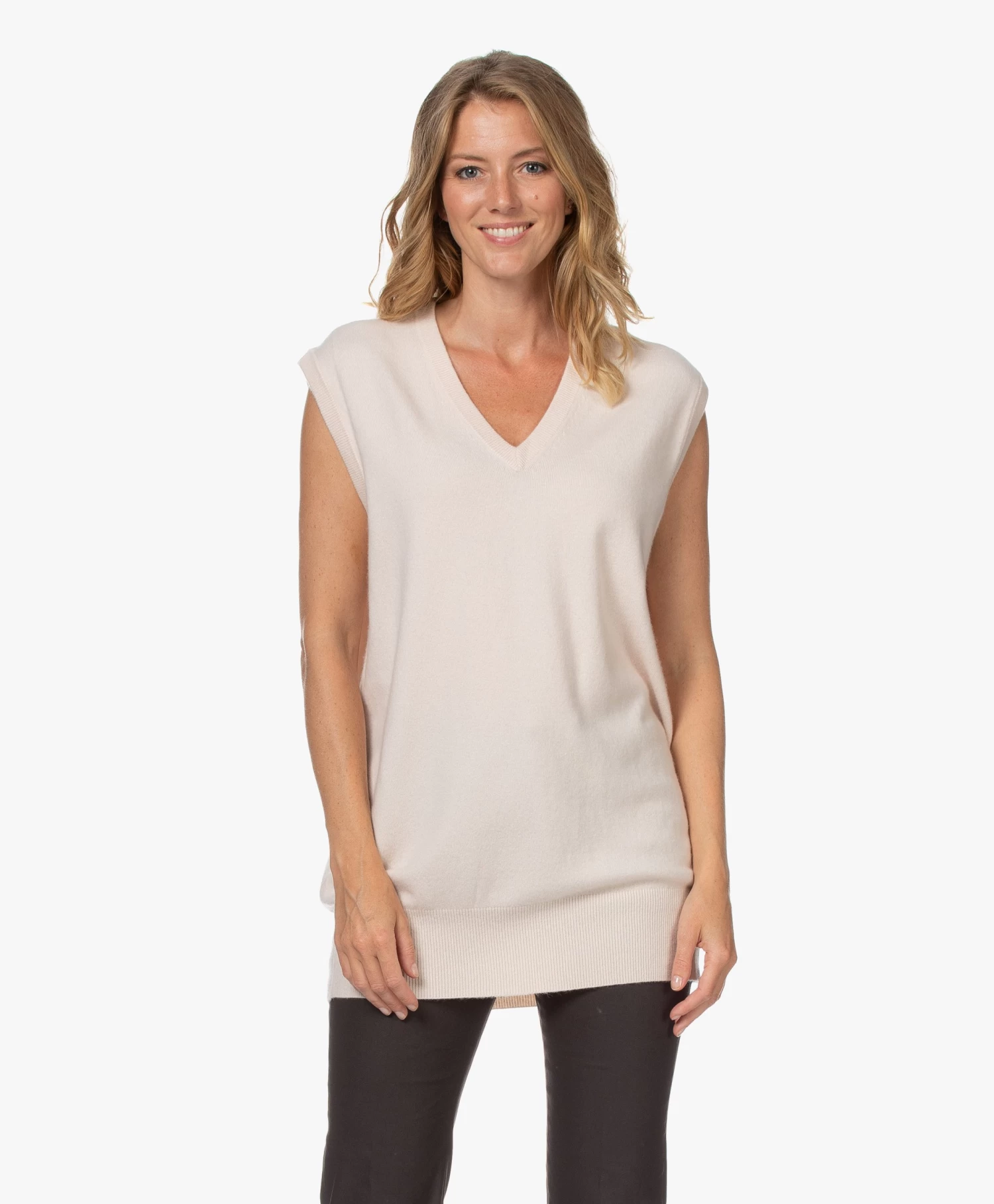 extreme cashmere gaat voor vernieuwde klassiekers en werd voor deze N°144 Clic top geïnspireerd door een klassieke spencer, maar voegt vrouwelijke elementen toe die worden gekenmerkt door de zachte kleurtint, het langere silhouet en het luxueuze cashmere breisel. Deze mouwloze trui komt in een vrouwelijke lichtroze tint die moeiteloos samensmelt met de exceptioneel zachte kwaliteit.
