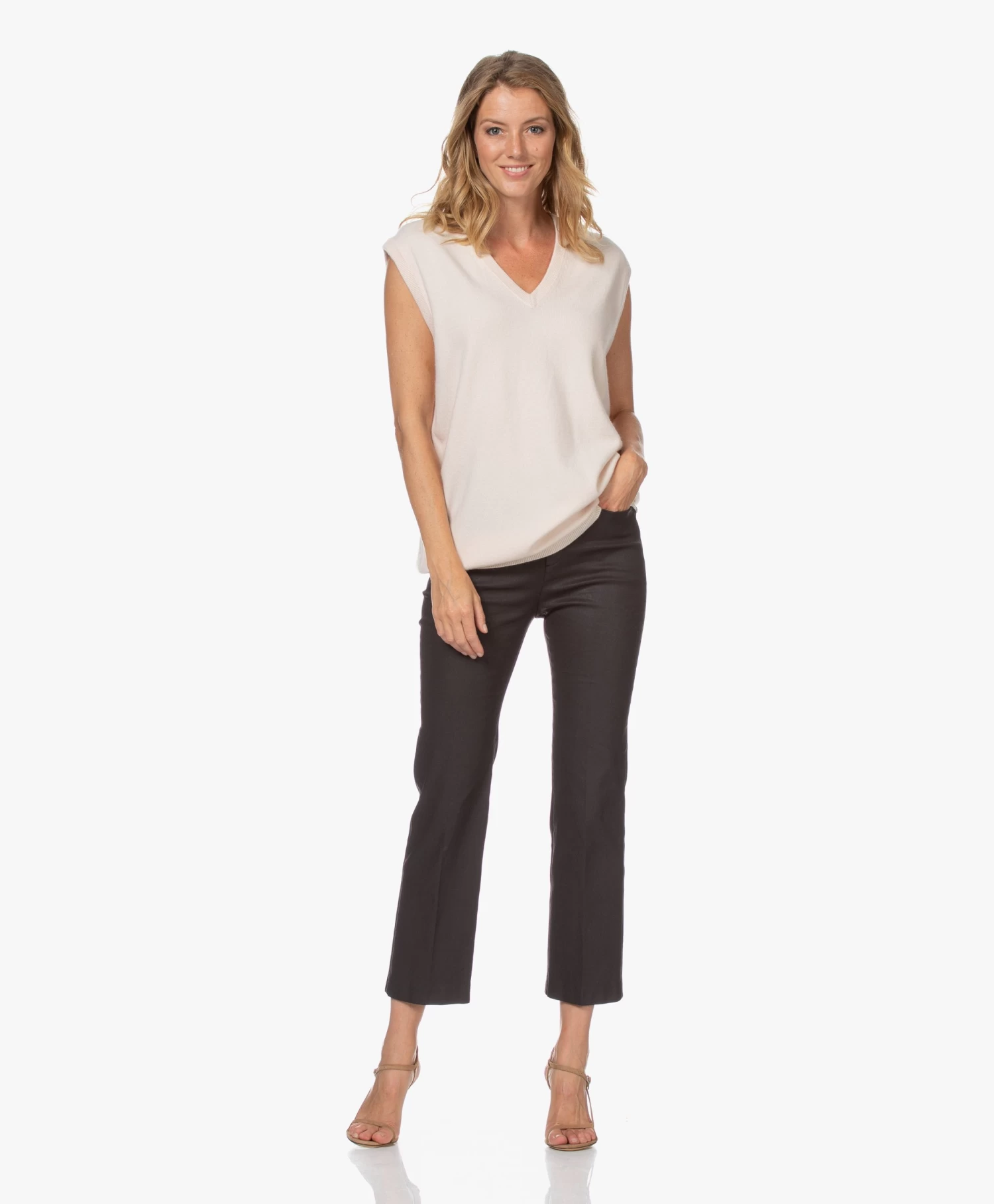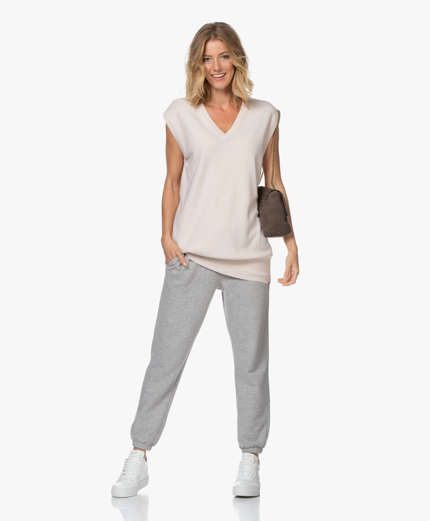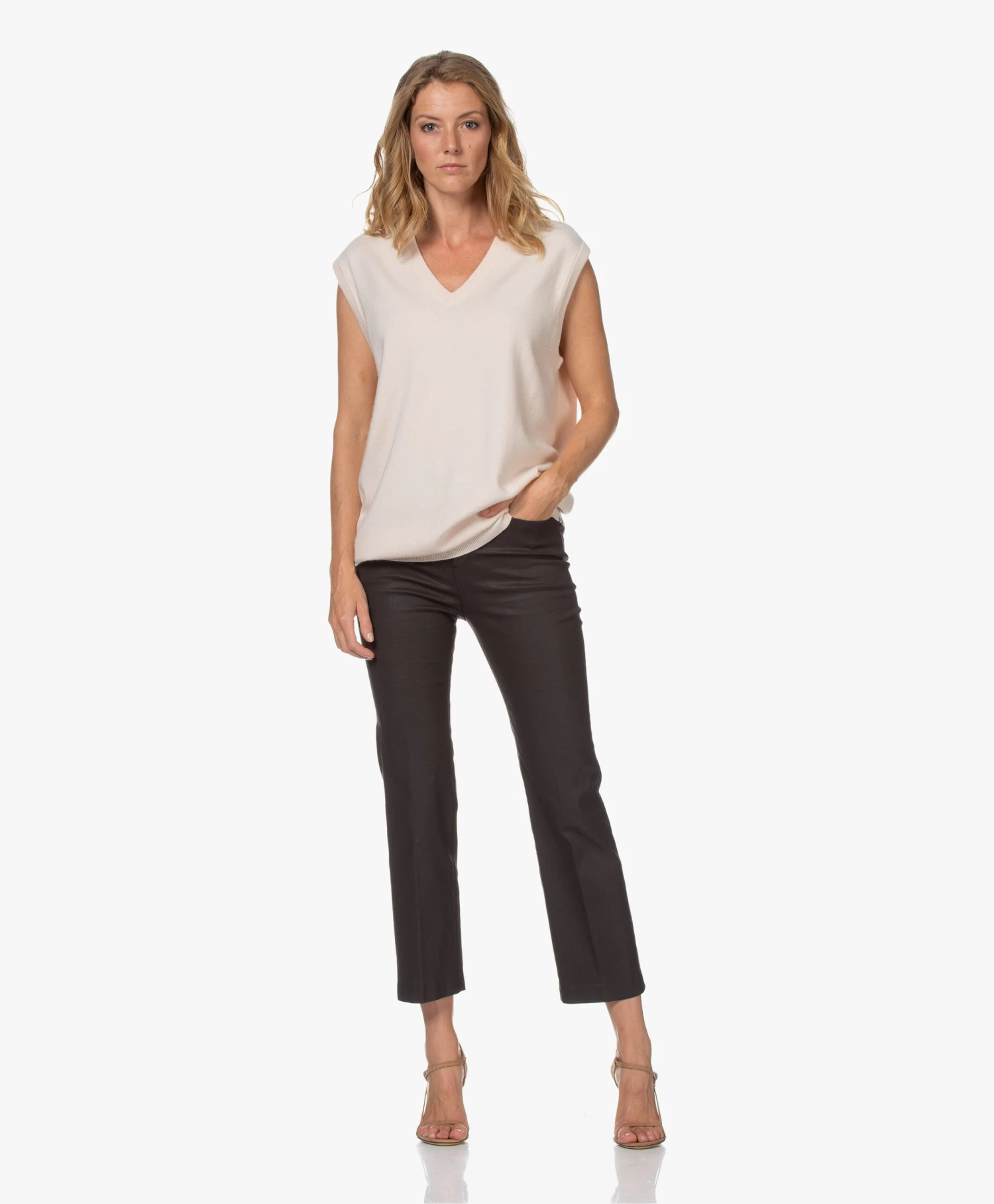 extreme cashmere gaat voor vernieuwde klassiekers en werd voor deze N°144 Clic top geïnspireerd door een klassieke spencer, maar voegt vrouwelijke elementen toe die worden gekenmerkt door de zachte kleurtint, het langere silhouet en het luxueuze cashmere breisel. Deze mouwloze trui komt in een vrouwelijke lichtroze tint die moeiteloos samensmelt met de exceptioneel zachte kwaliteit.
