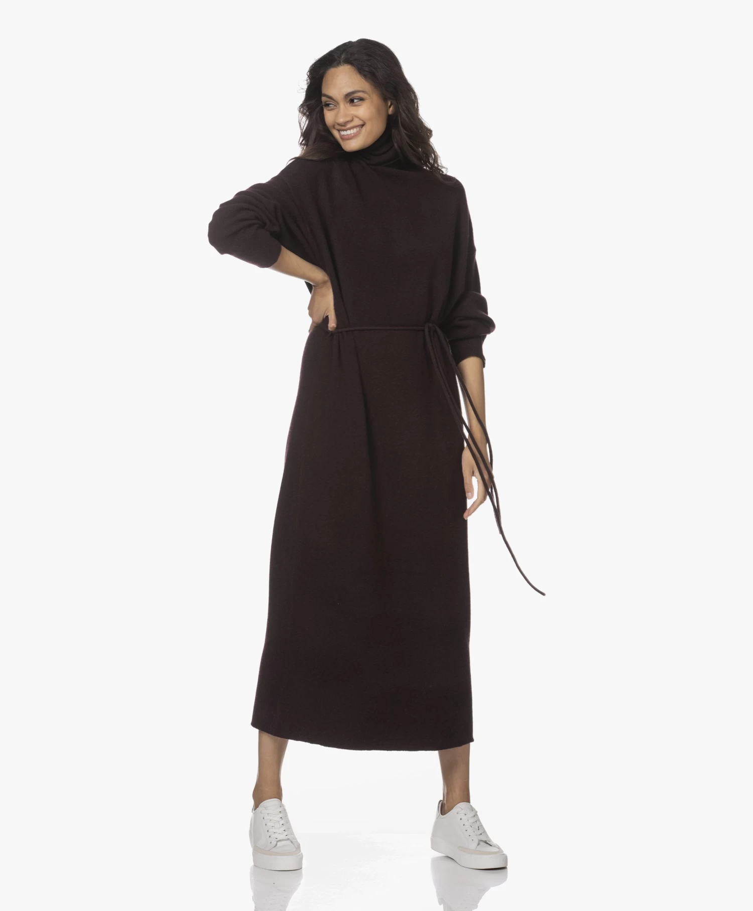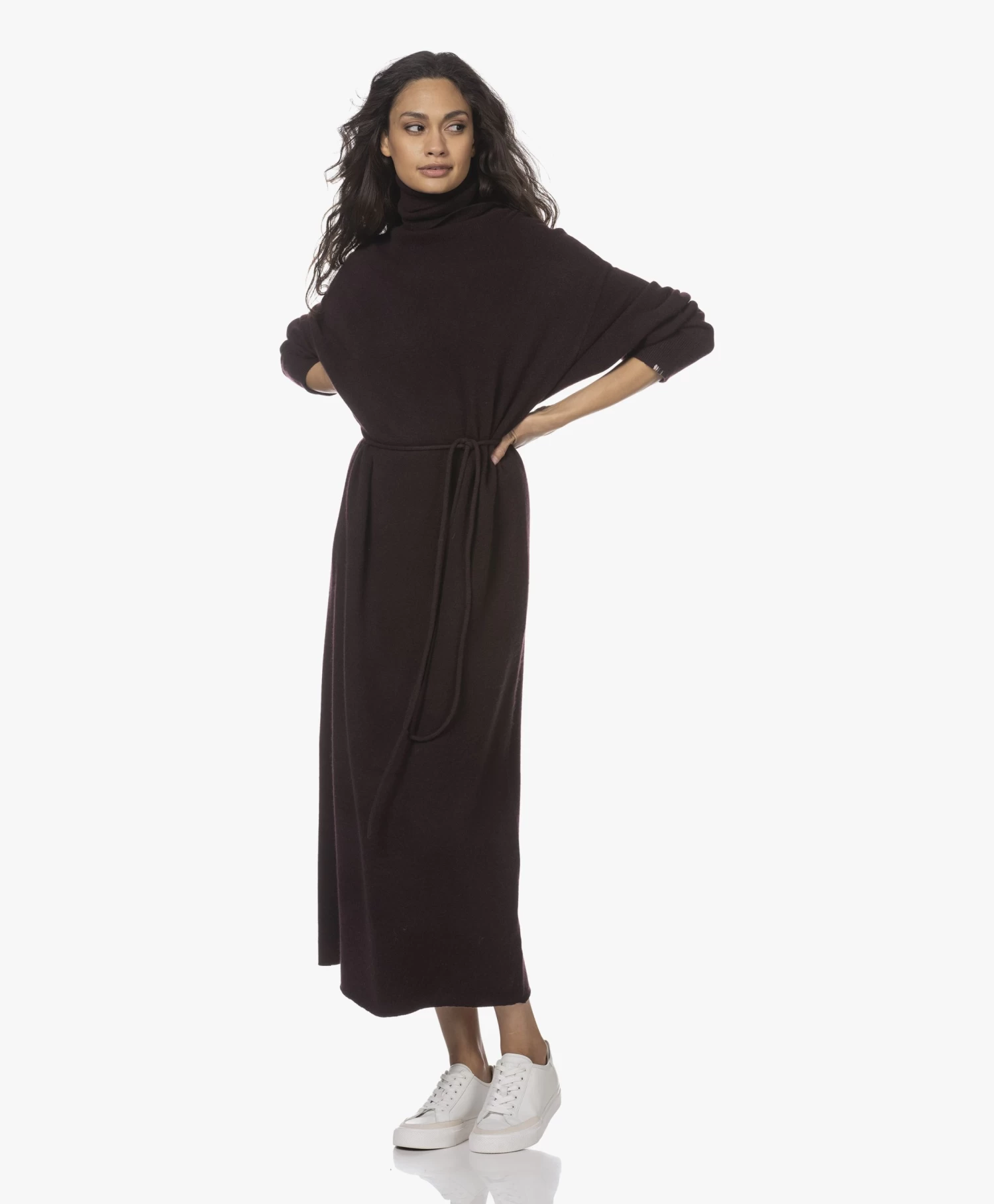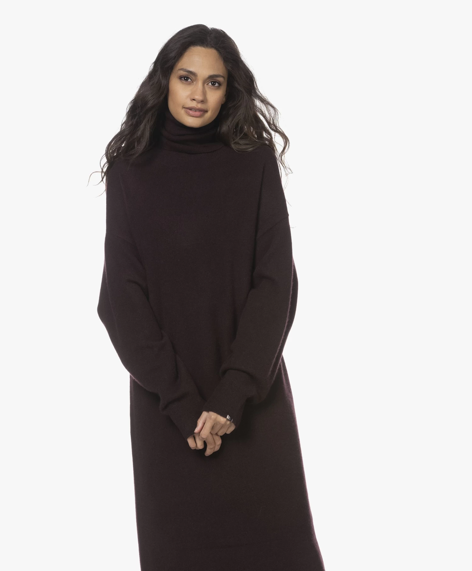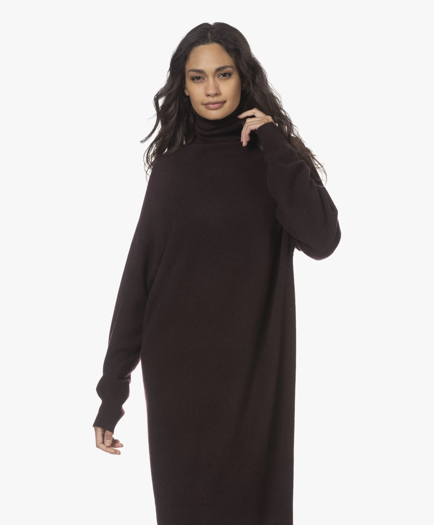 Met deze N°209 Attraction coljurk van extreme cashmere in donkerpaarsbruin verwen je jezelf met alle luxe van cashmere en tegelijkertijd met het gemak van een stijlvolle one-piece. De gebreide jurk is ontworpen met een relaxte pasvorm met recht silhouet en een maxi lengte. Maak zelf de keuze om met of zonder bijpassende of zelfgekozen ceintuur te dragen voor steeds weer een andere look. Een extra hoge colkraag en extra lange mouwen zijn eigentijdse details die meteen een cozy gevoel creëren. Gemaakt van een fijn doch iets zwaarder breisel met cashmere.