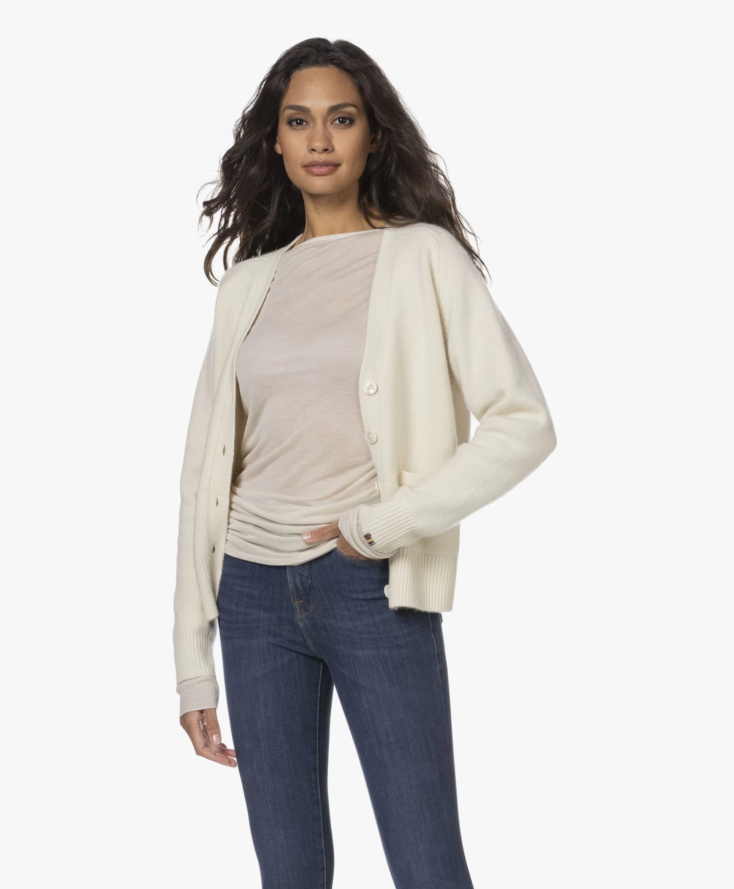 Het warme draagcomfort en de luxe uitstraling van cashmere zijn ongeëvenaard. extreme cashmere’s crèmekleurig vest N°81 Card is middelzwaar gebreid van cashmeremix garen met toegevoegde stretch voor een optimaal vormbehoud. Het heuplange V-hals vest verrijkt je seizoensgarderobe met stijl, comfort en veelzijdigheid!