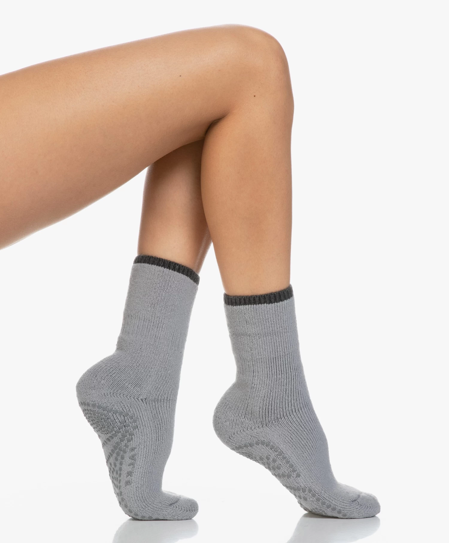 – Fijn gebreide lichtgrijze sok met donkergrijs omslagboord