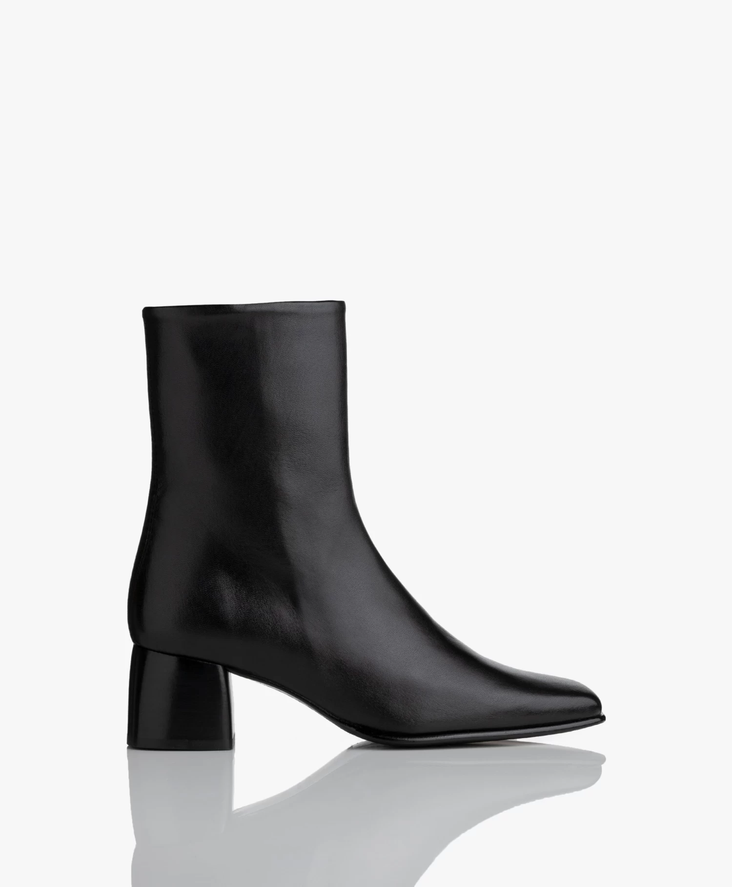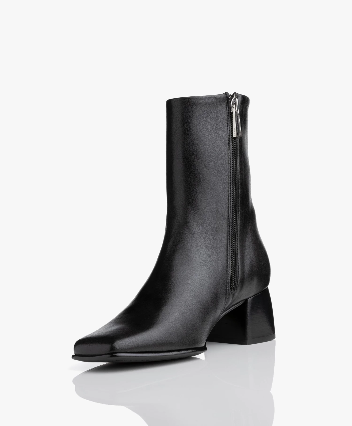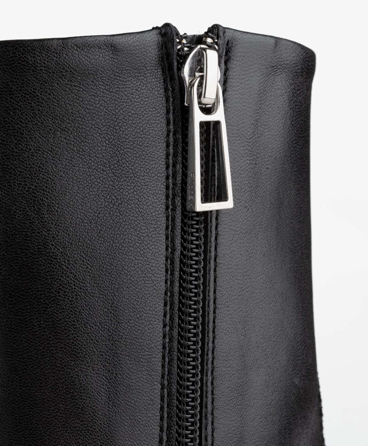 Het raffinement van deze Filippa K Eileen laarzen zit hem in de details. Deze zwarte, slank gesneden enkellaarzen zijn gemaakt van soepel en glad geitenleer, ontworpen met een iets afgeronde, vierkante neus en een dito afgeronde blokhak en gedecoreerd met ton-sur-ton zigzag stiksels middenachter. Omarm tijdloos design voor ieder seizoen.