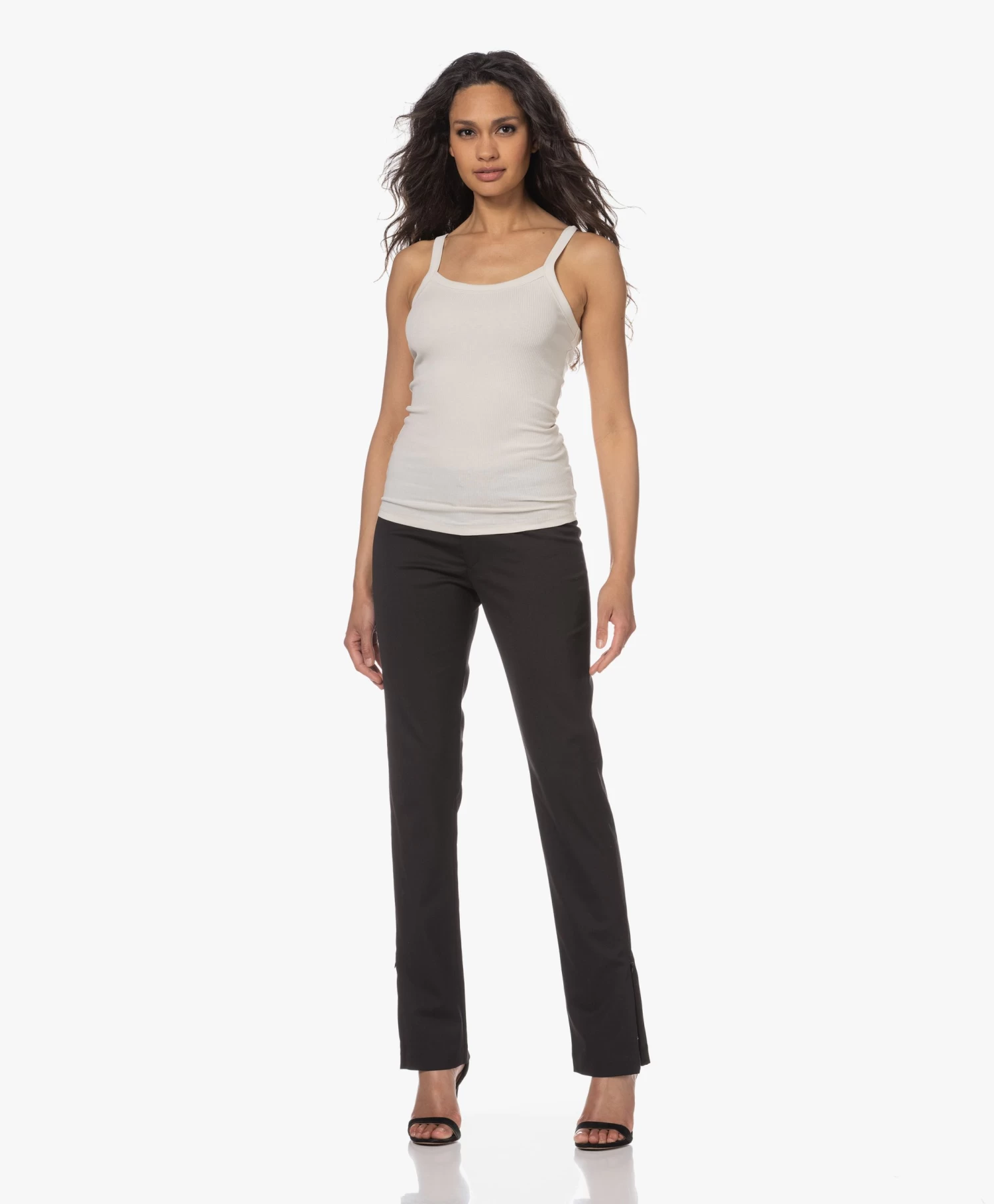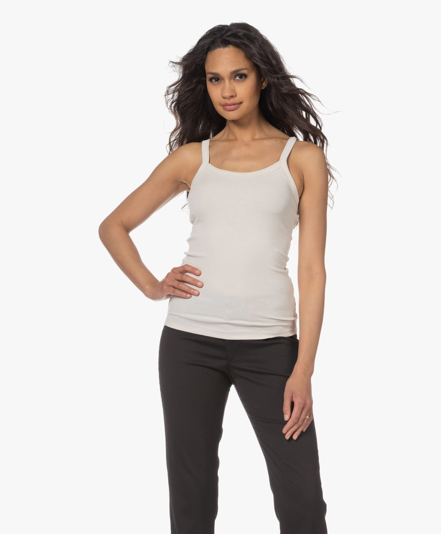 Een fijne basic die je nú aan je garderobe wilt toevoegen; deze ivoorkleurige top van Filippa K met brede schouderbandjes! De top is gemaakt van een zachte ribgebreide katoen kwaliteit met extra stretch en toont een moderne afgeronde halslijn.