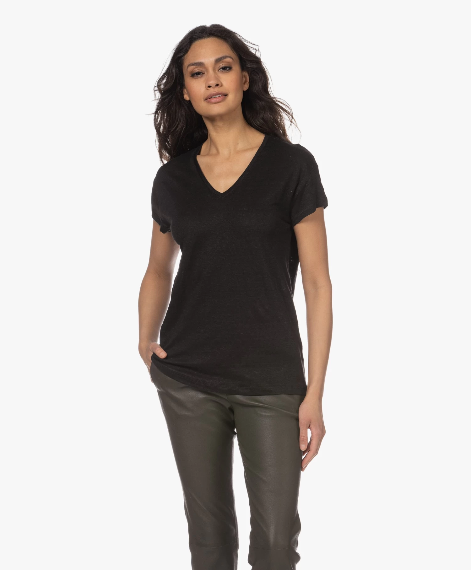 In de warmere maanden gaat er niets boven verkoelend linnen. Met dat in het achterhoofd is GAI+LISVA’s zwarte Simone T-shirt een fijne aanwinst. Dit V-hals T-shirt met verlaagde schouders en relaxte pasvorm is gemaakt van soepele, zachtglanzende linnen jersey met verfijnde slubstructuur.