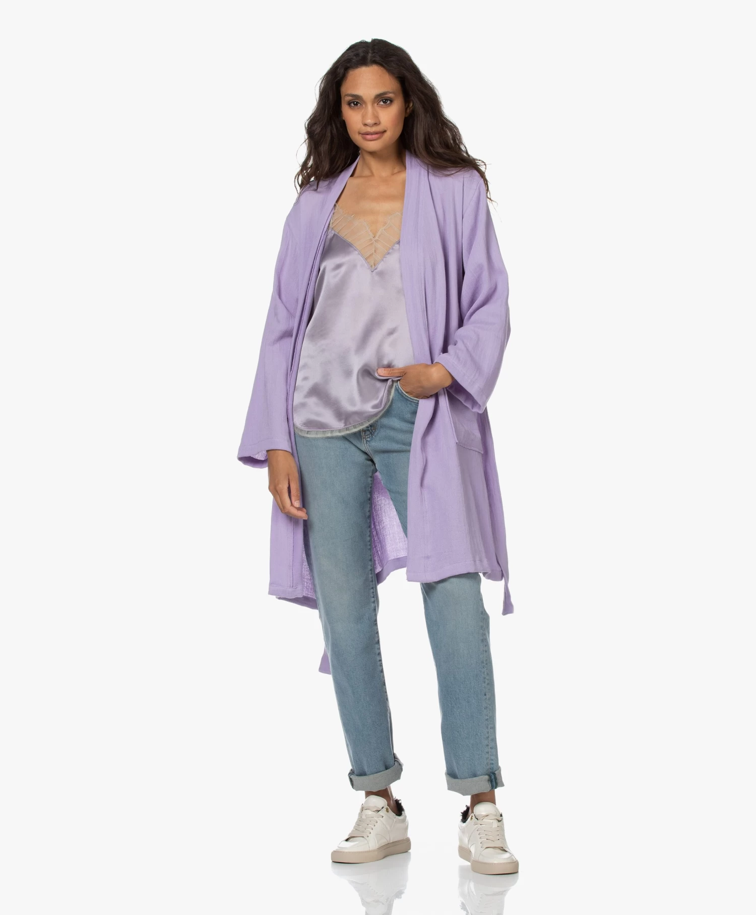 Het stijlvolle borduurwerk van bloemen, in een multi-color ontwerp, siert deze lilakleurige The Flower kimono van HAMMAM34. Een veelzijdig item om op verschillende manieren te dragen – het hele jaar door! Als stijlvolle cover-up op het strand of bij het zwembad, relaxend in huis of zelfs ter vervanging van een blazer of vest. Jij bepaalt!