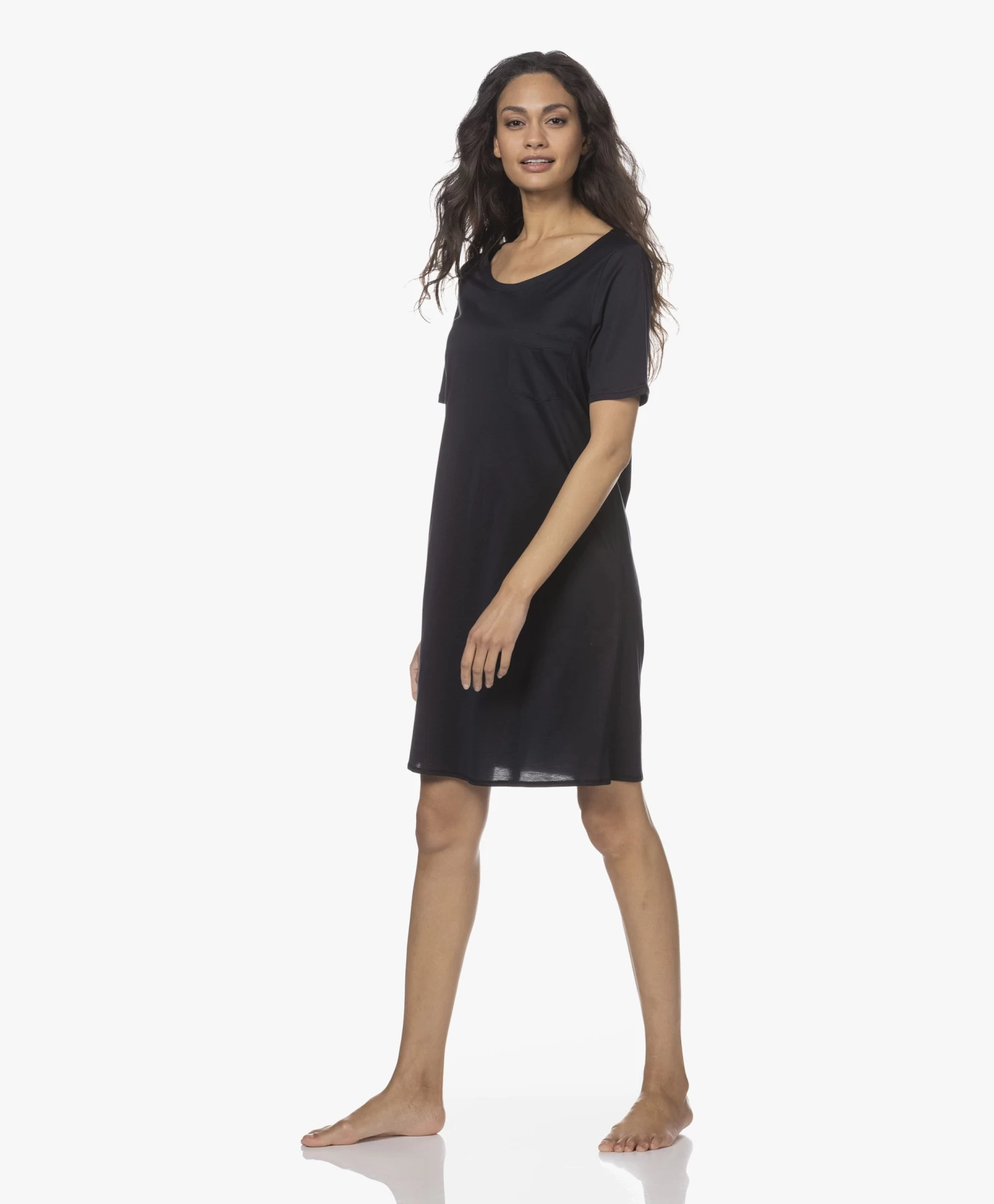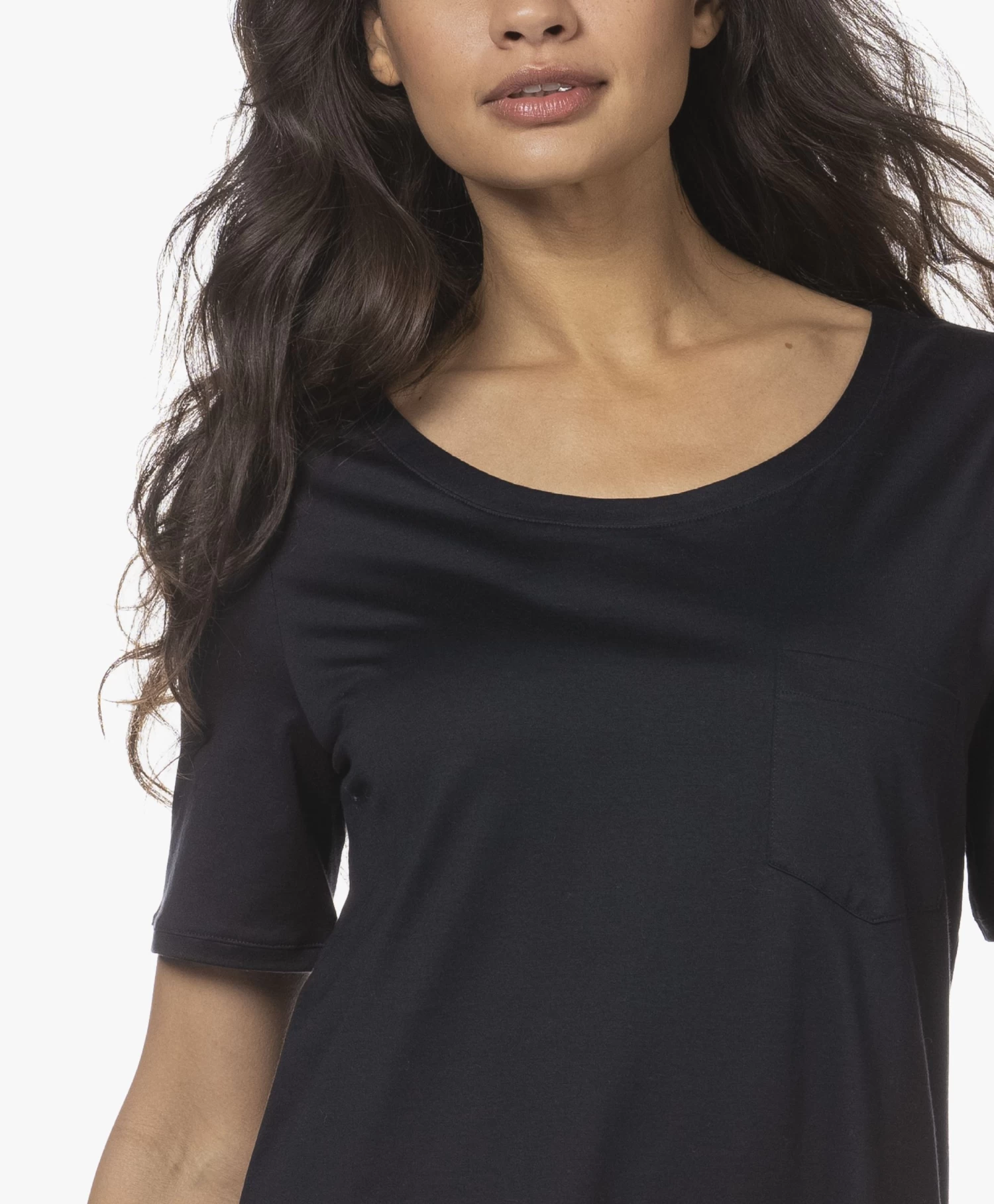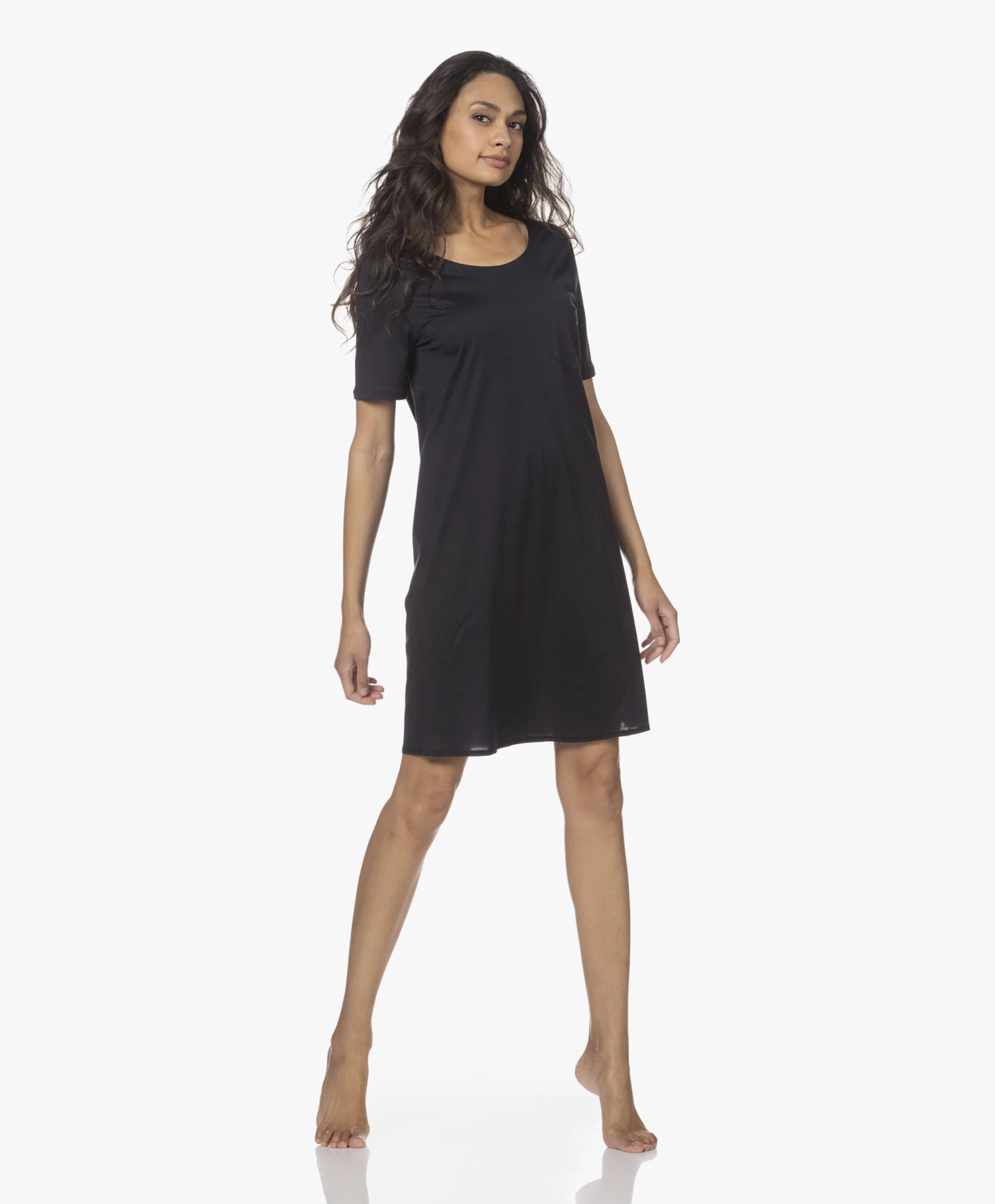 Comfortabel en lichtgewicht jersey nachthemd van de HANRO Cotton Deluxe lijn – dit zwarte nachthemd is gemaakt van een soepel vallende en zachte pure gemerceriseerde Supima katoen kwaliteit met een karakteristiek iets glanzend karakter. Deze recht gesneden stijl is vrouwelijk en super comfy – combineer met de bijpassende pyjamabroek en badjas van het merk. Â
