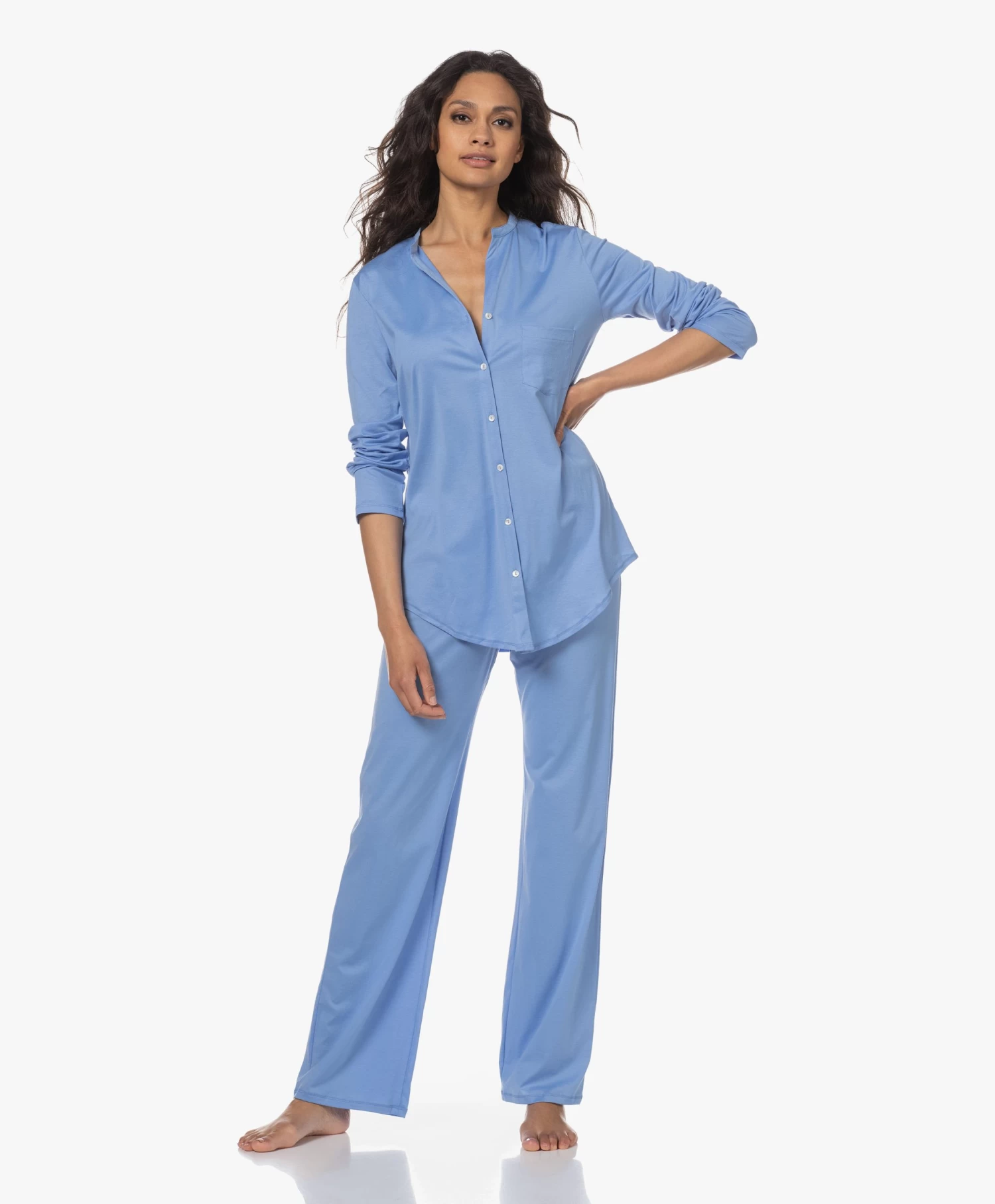 Een pyjama in klassieke stijl, maar dan uitgevoerd in jersey voor nóg meer slaapcomfort. HANRO ontwerpt deze pyjamaset in een hemeslblauwe kleurtint. De pyjamaset met lange mouwen is gemaakt van een soepelvallende, lichtgewicht en comfortabele pure gemerceriseerde Supima katoen kwaliteit met een iets glanzend oppervlak. De parelmoerglanzende knopen onderstrepen het luxe gevoel.