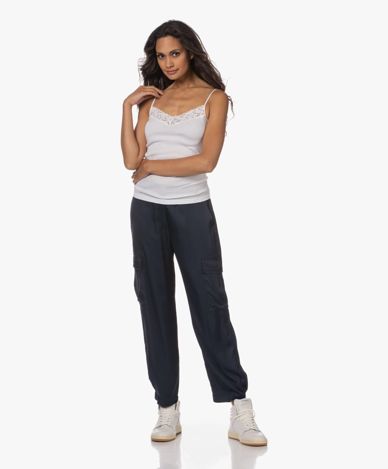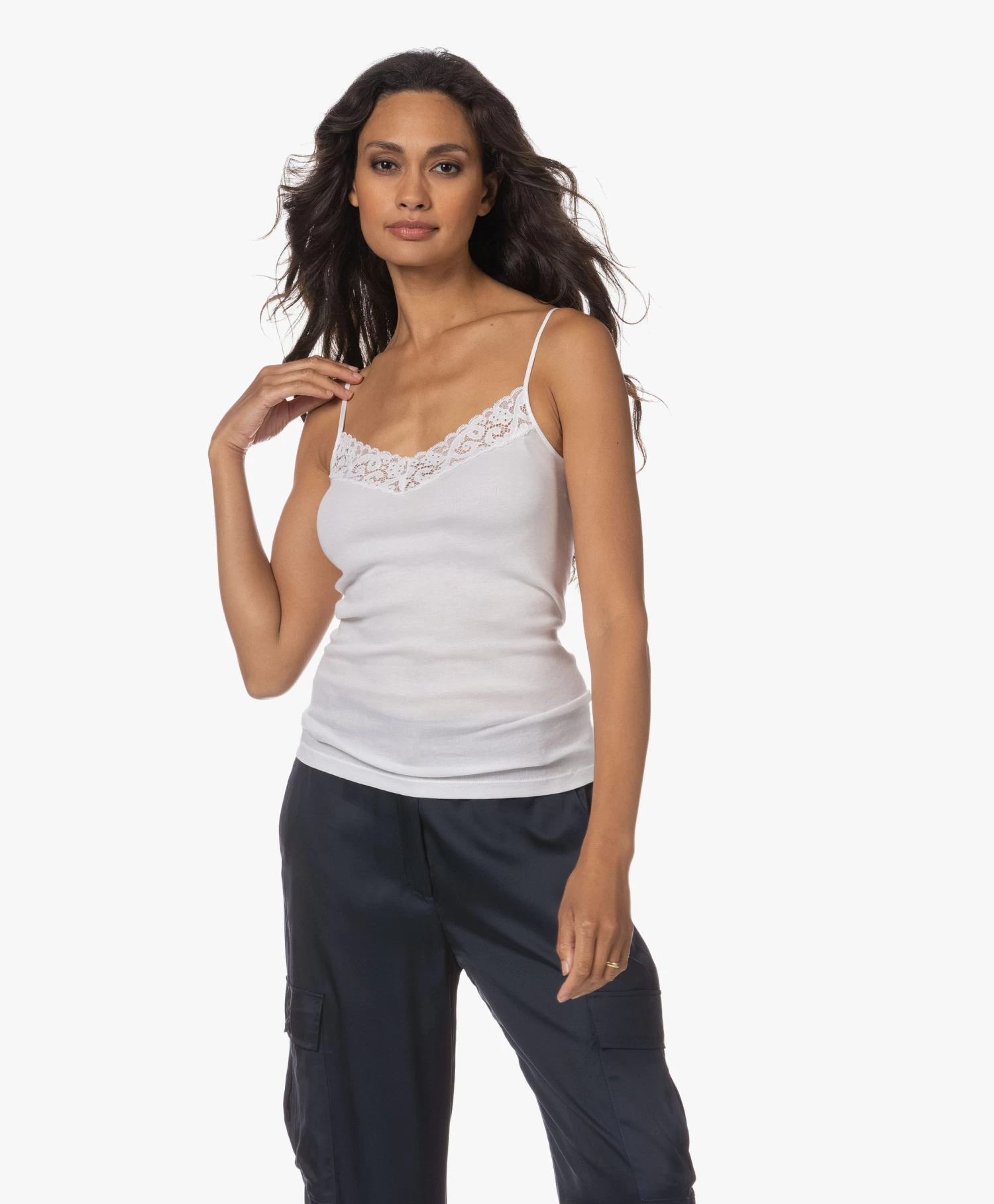 Deze naadloze spaghetti top van HANRO is gemaakt van zacht en lichtgewicht gemerceriseerd katoen in een fijne ribkwaliteit. Deze witte top toont een delicate kanten afwerking voor een sexy touch. Creëer de perfecte basis met de bijpassende ‘soft cup’ BH en de slip of hipster of draag gelaagd onder een vest of blazer voor een zachte vrouwelijke touch. Â