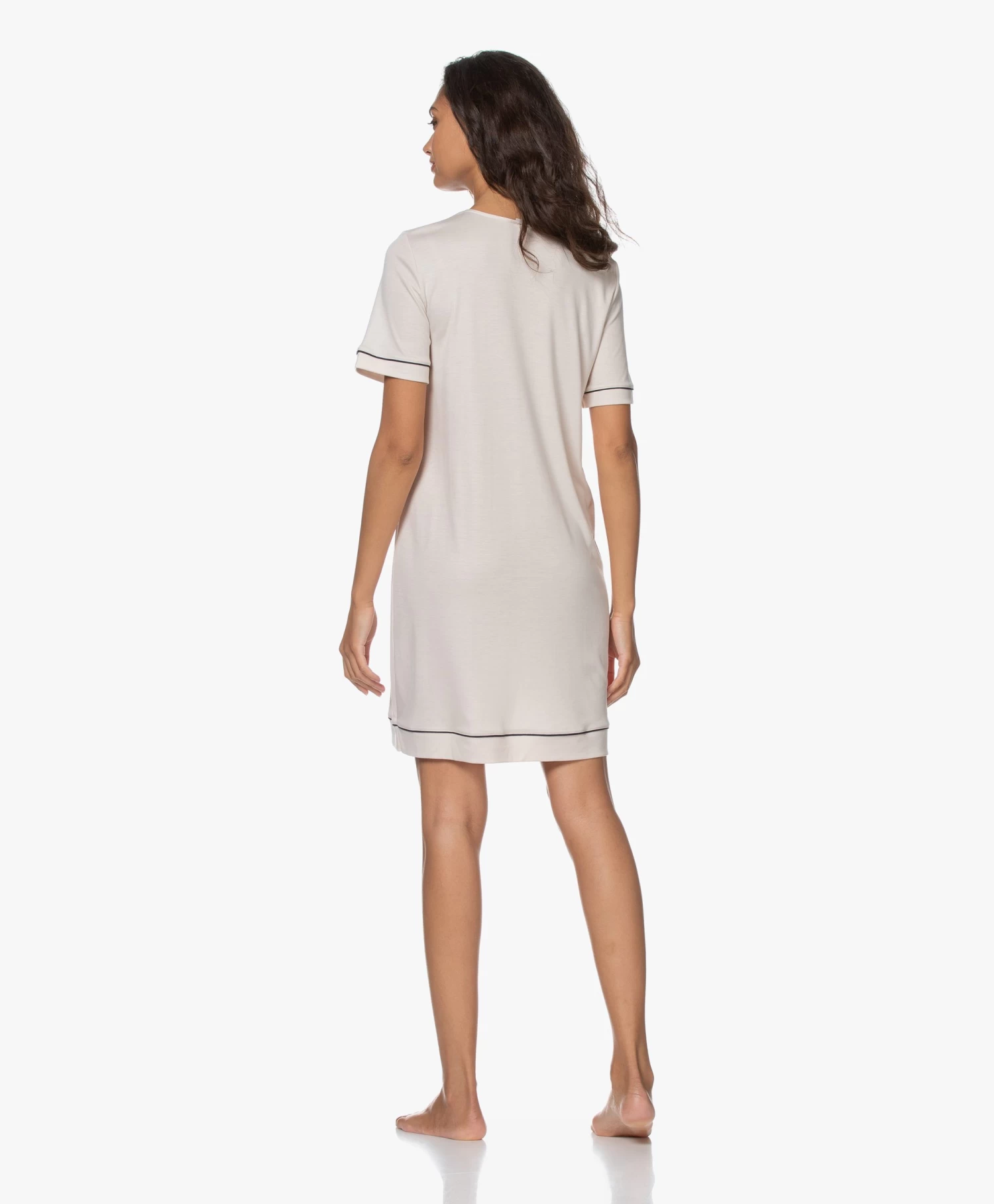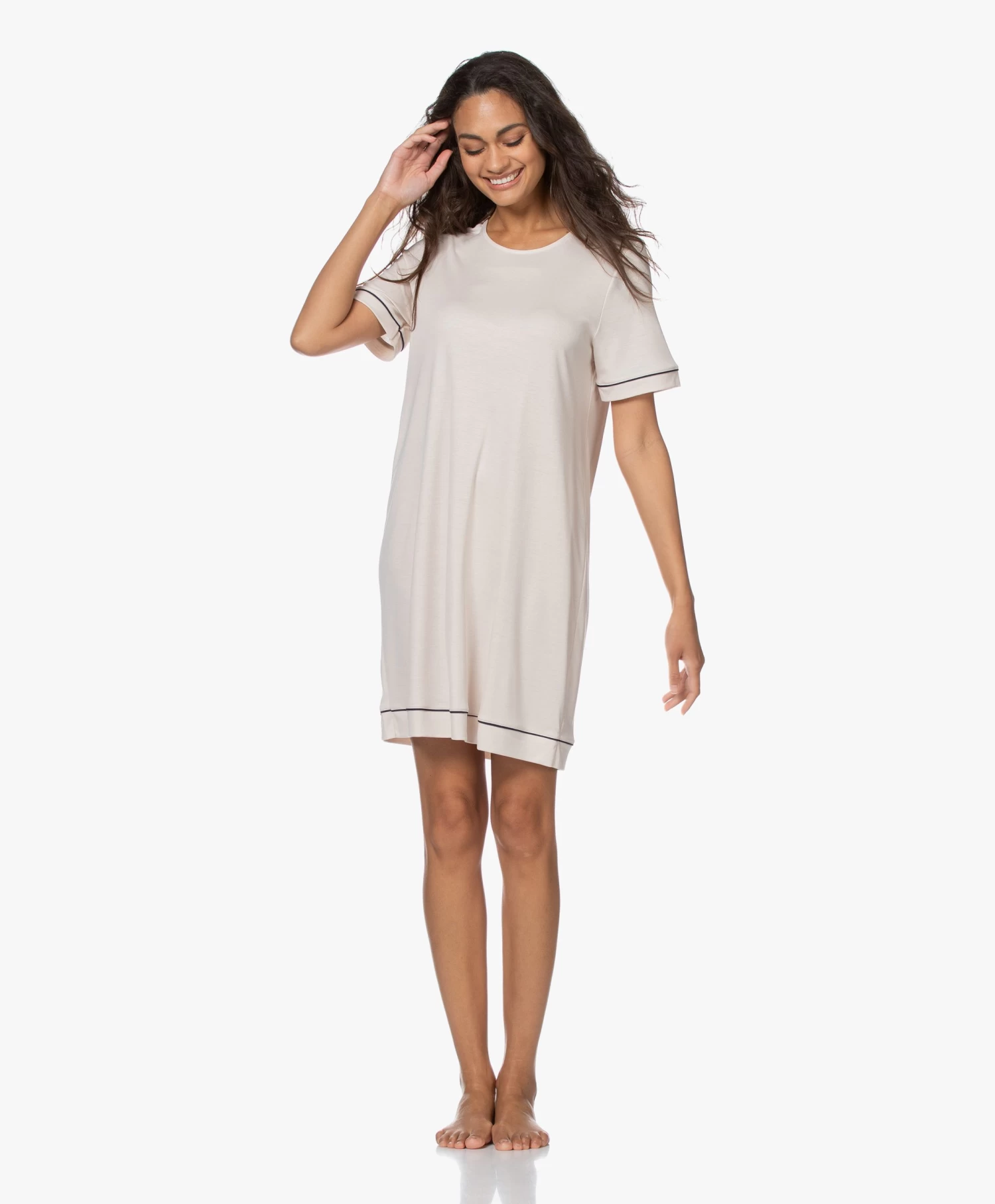 Volgens HANRO moet nachtmode naast comfortabel, vooral ook stijlvol zijn. Dit lichtbeige nachthemd is gemaakt van puur Tencel wat deze T-shirtjurk naast ultra-zacht, ook ultra-duurzaam maakt. Daarnaast is de soepele jersey kwaliteit ademend en temperatuurregulerend met een hoge vochtopname – pure luxe voor ’s nachts.