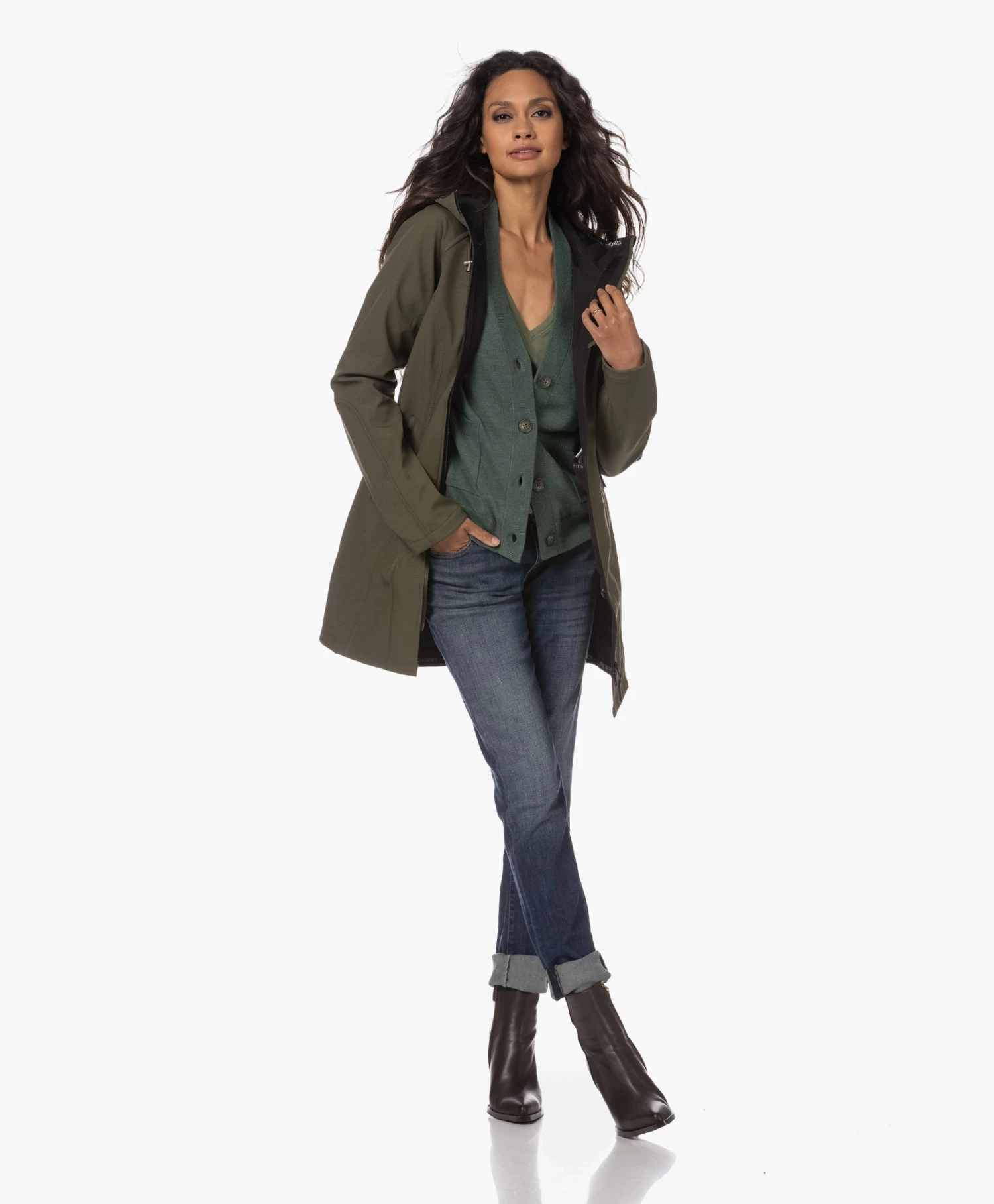 Deze legergroene softshell regenjas van Ilse Jacobsen is niet alleen stijlvol, maar biedt ook bescherming tegen alle weersomstandigheden. De dij-lange jas is uitgevoerd met een teflon membraam en stoot zelfs water af tot 5000 mm. Een ideale jas in uiterlijk, pasvorm, comfort en gebruik!Â