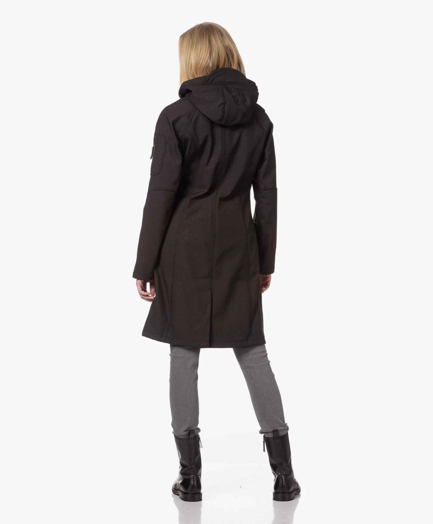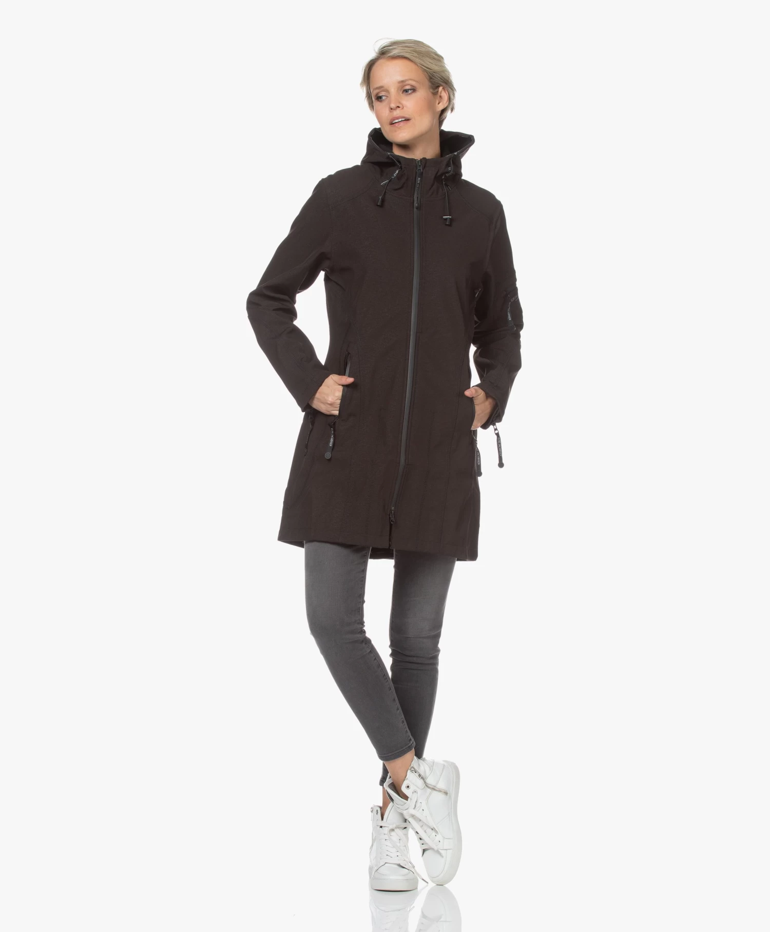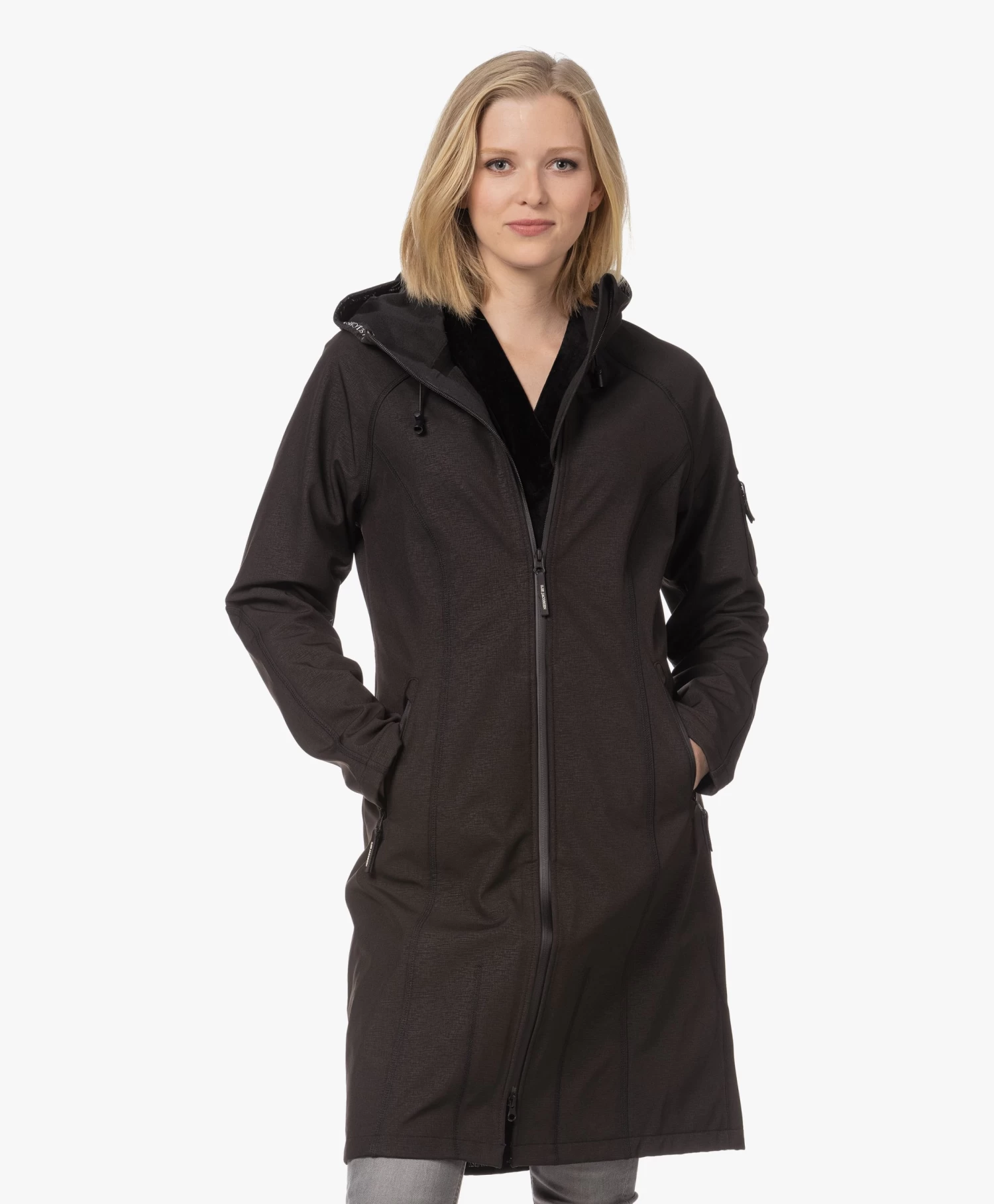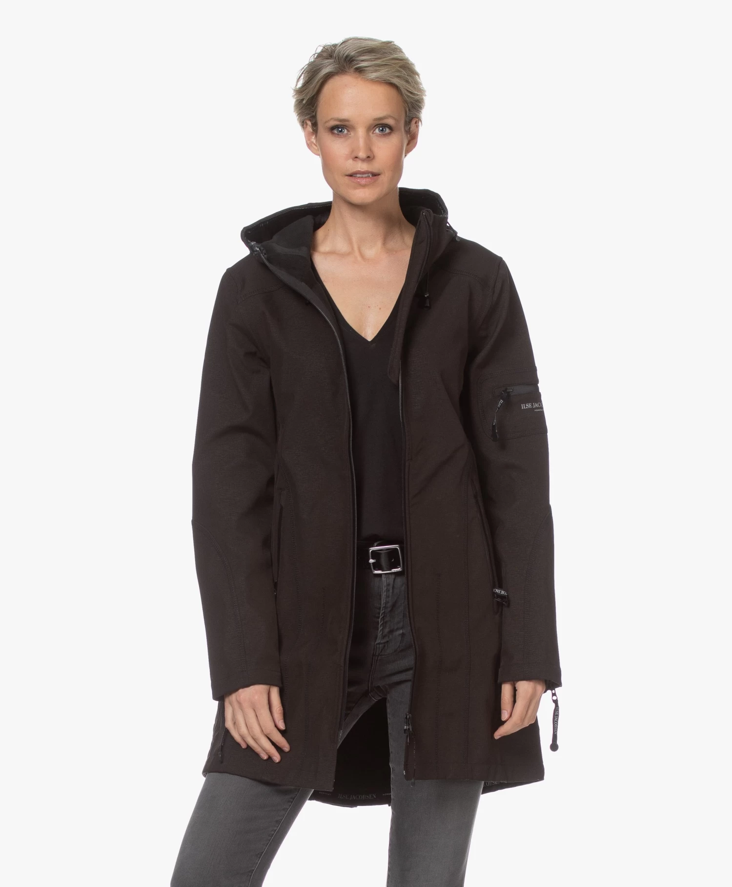 – Aangesloten pasvorm, dij-lang silhouet, valt normaal qua maat