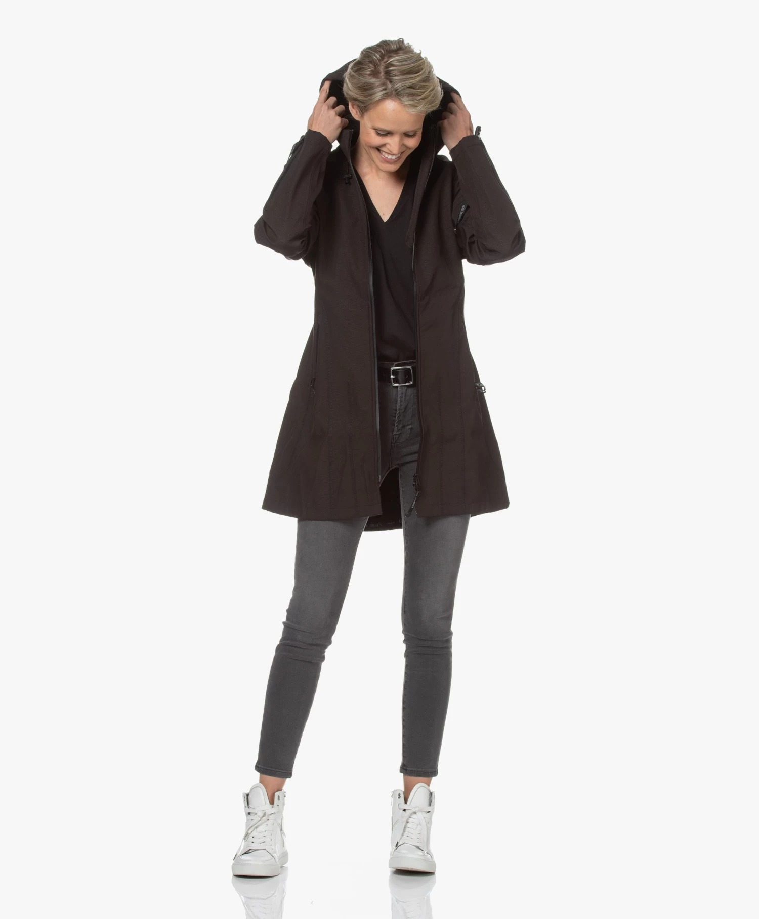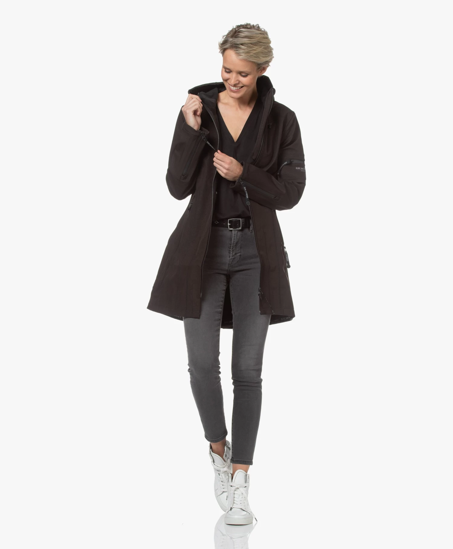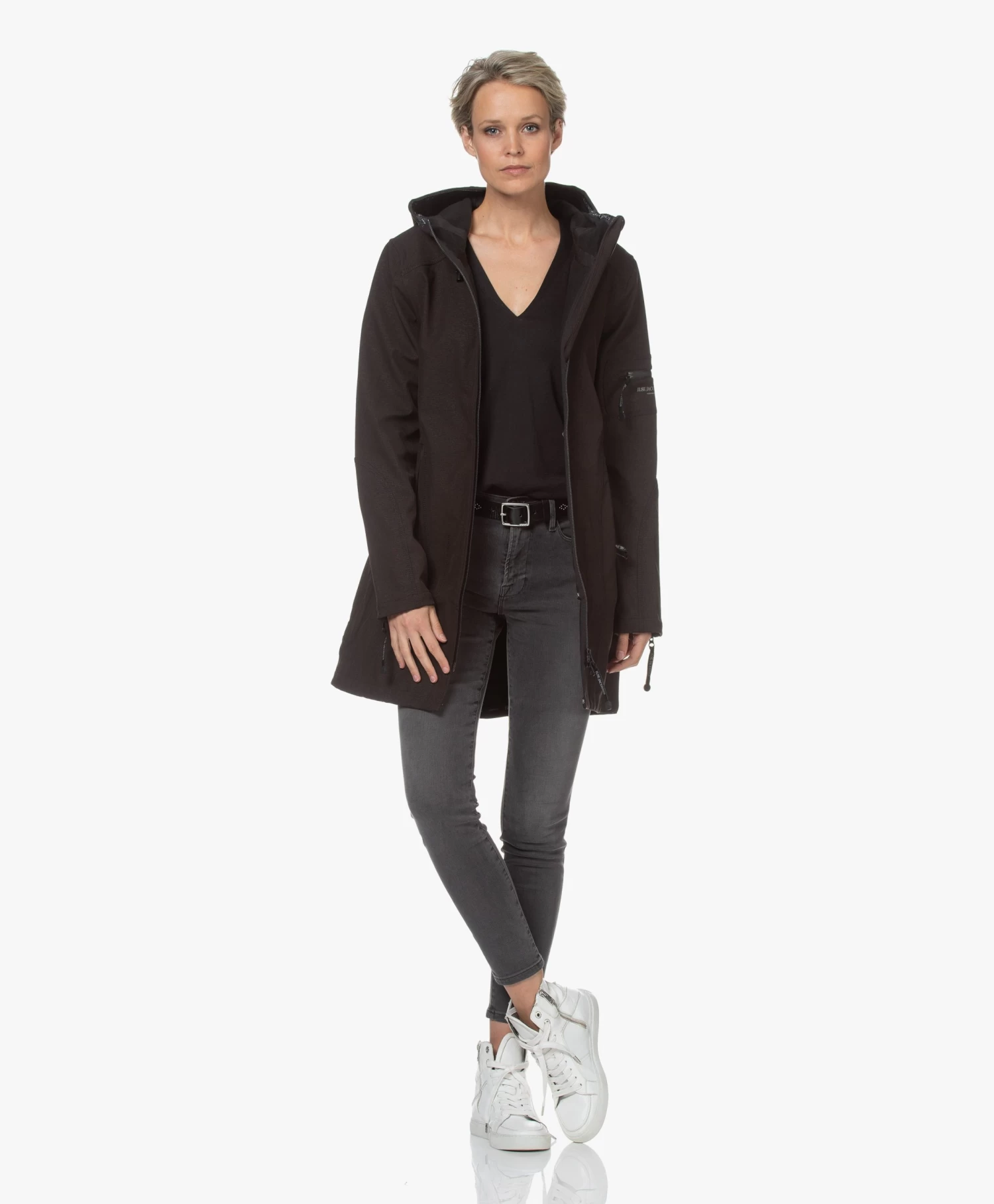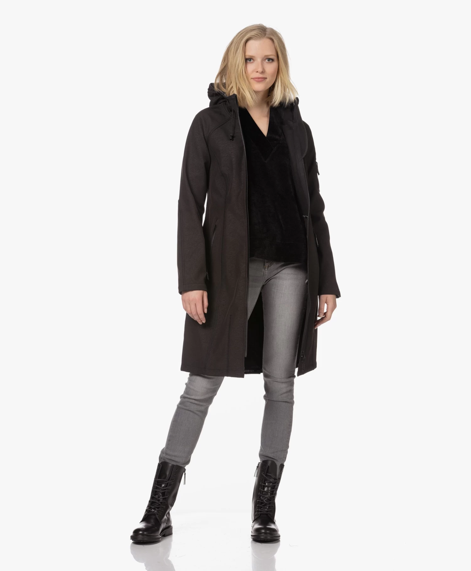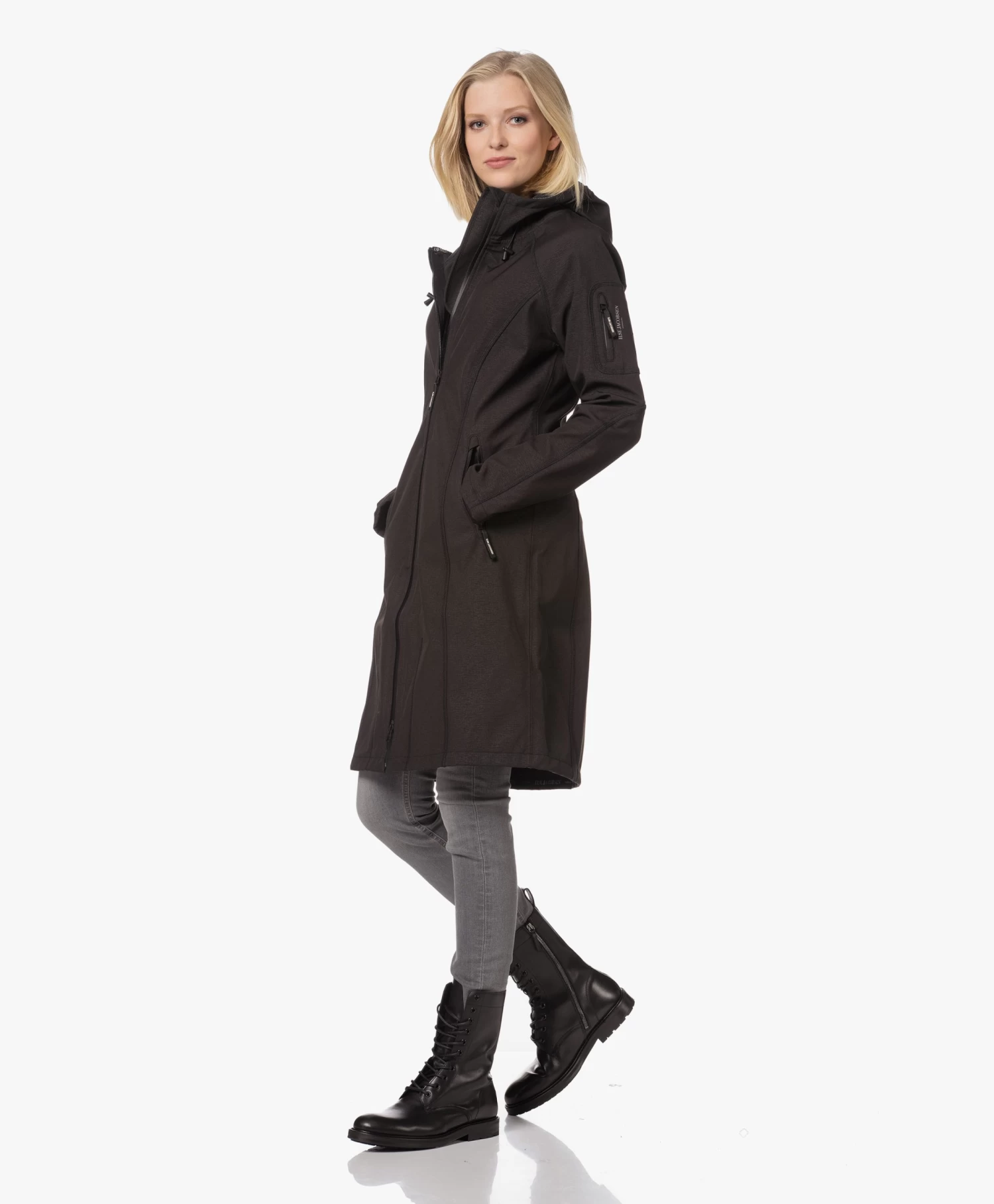 – Aangesloten pasvorm, dij-lang silhouet, valt normaal qua maat