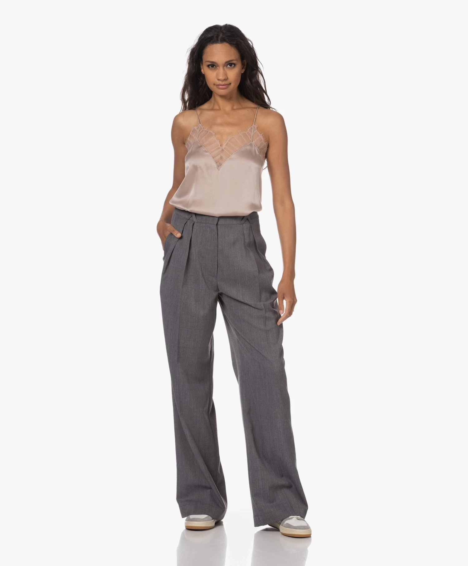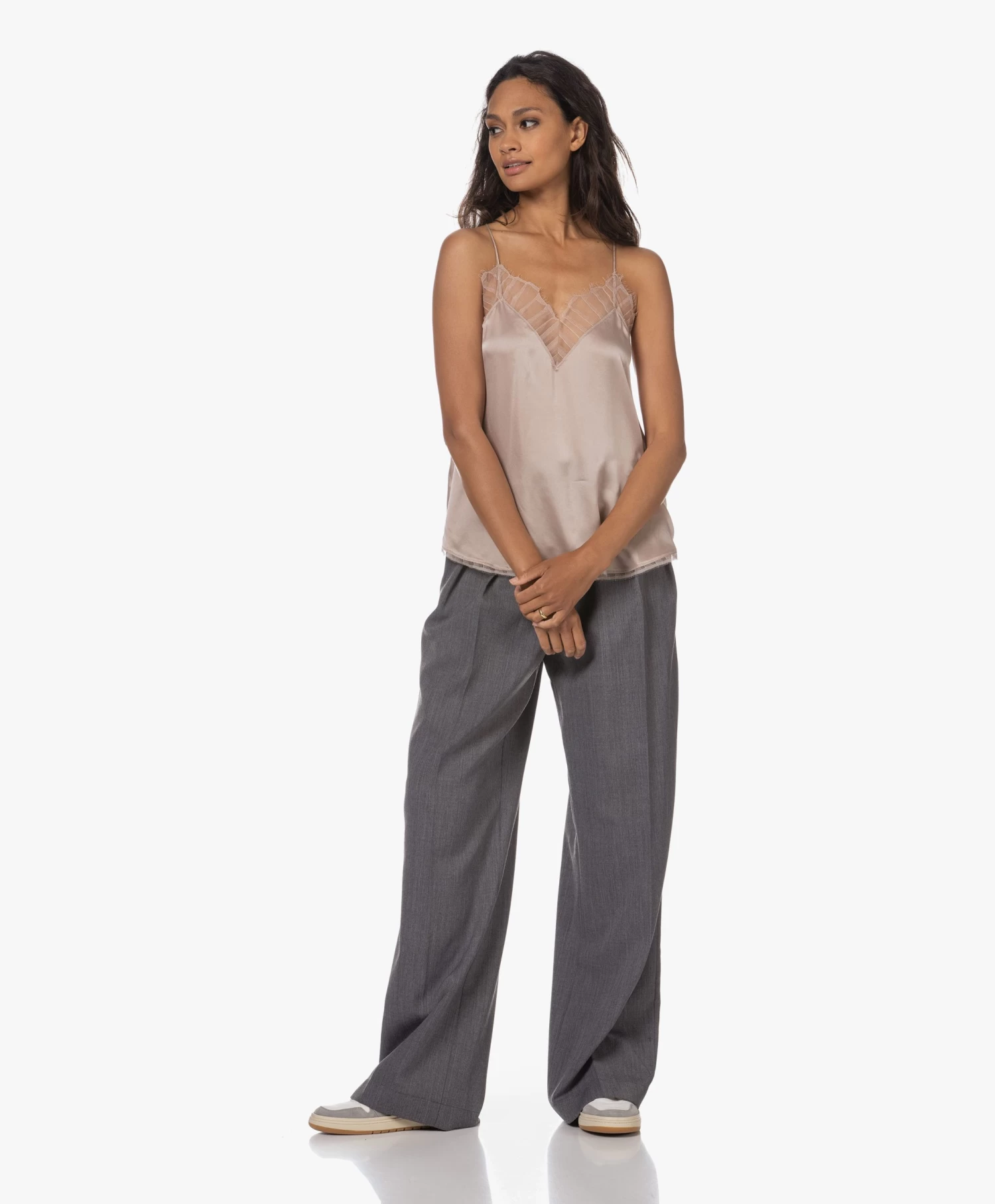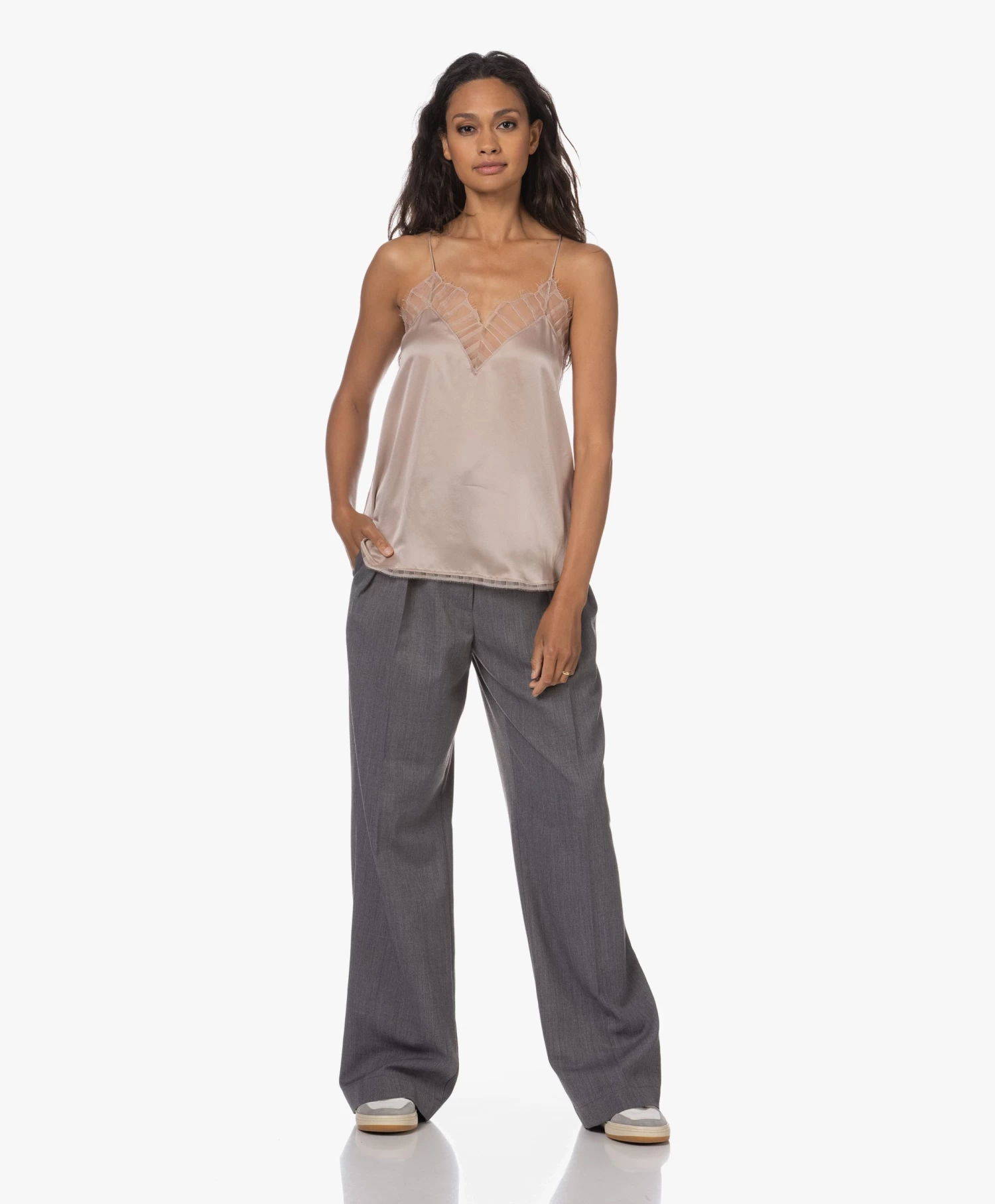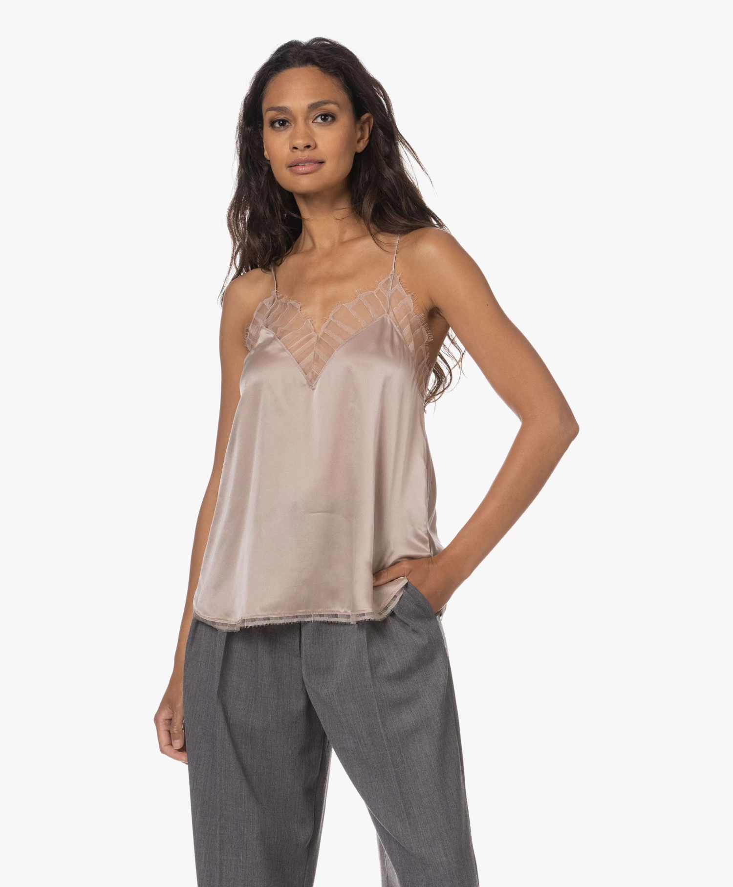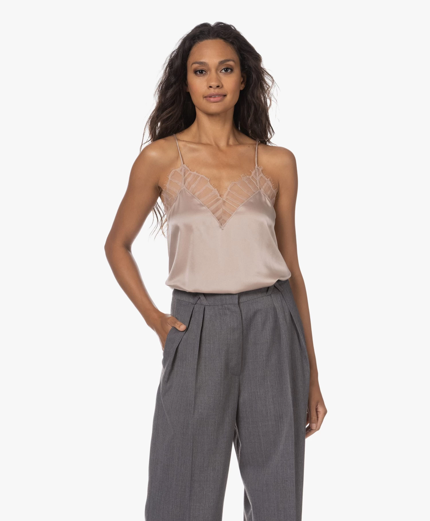 Vrouwelijk-chique Berwyn spaghetti top van IRO met een verfijnde en delicate kanten afwerking langs de halslijn en zoom. De soepel vallende top komt in vrouwelijk oudroze en is gemaakt van een luxueuze en gladde pure zijden kwaliteit met een iets mat karakter.Â
