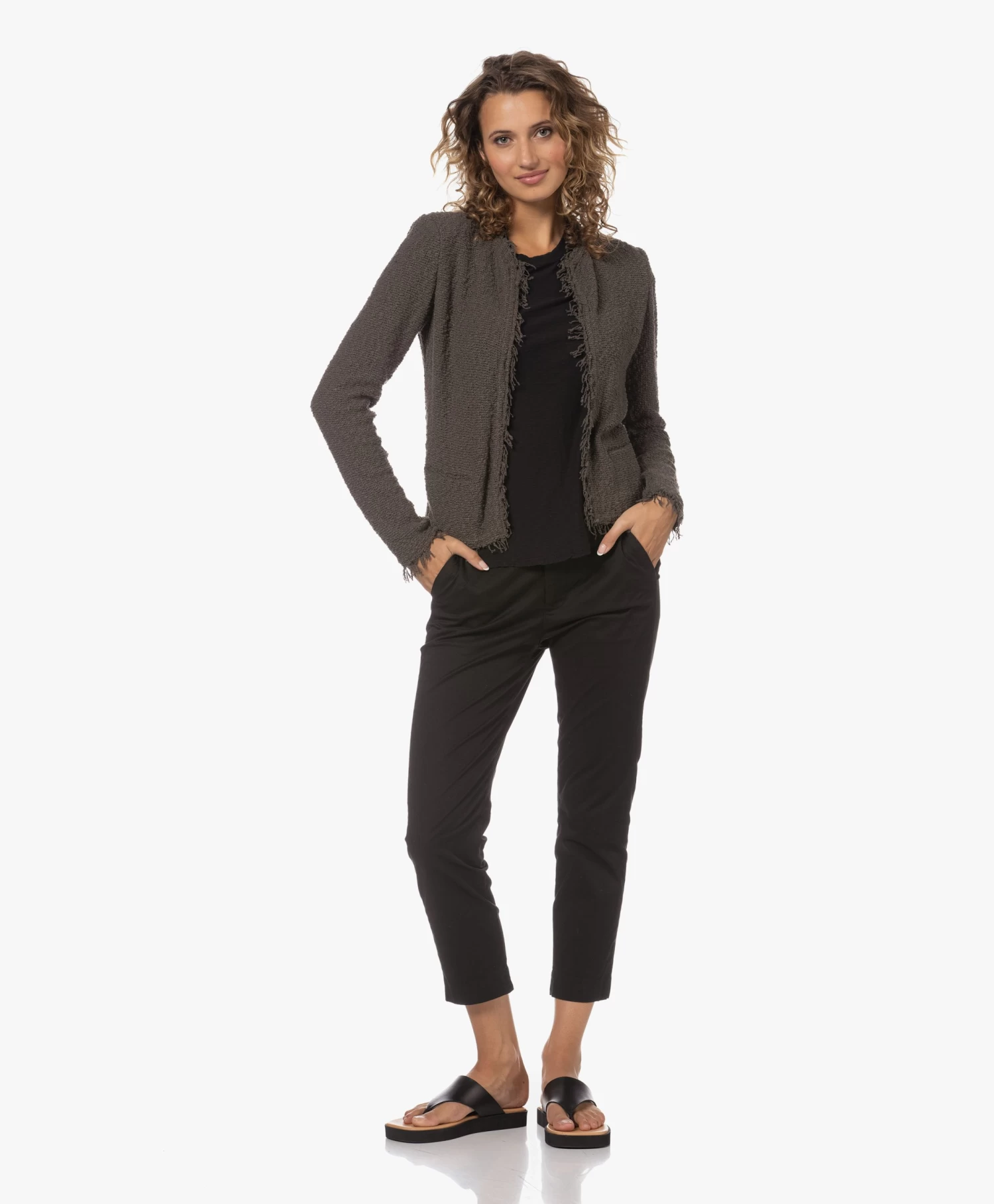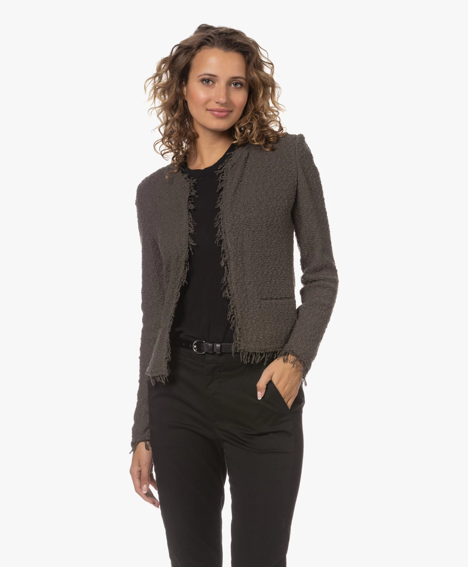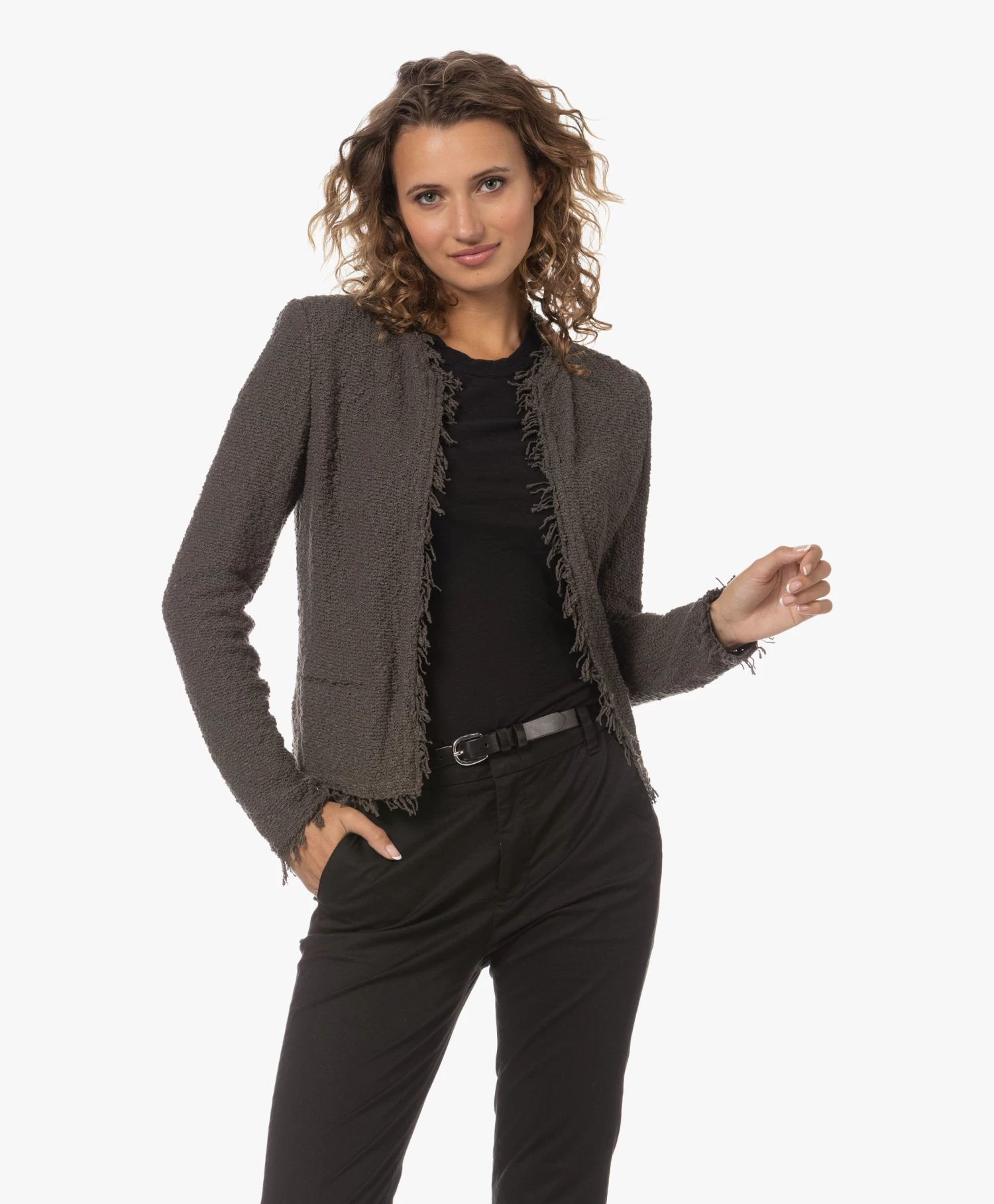 Deze donkergroene, kraagloze Shavani blazer van IRO met open silhouet is vervaardigd van een soepel bouclé-garen in katoenmix. De nonchalante stijl is afgewerkt met rafelige randen voor een eigentijdse edgy look. Het perfecte alternatief voor een klassieke blazer!