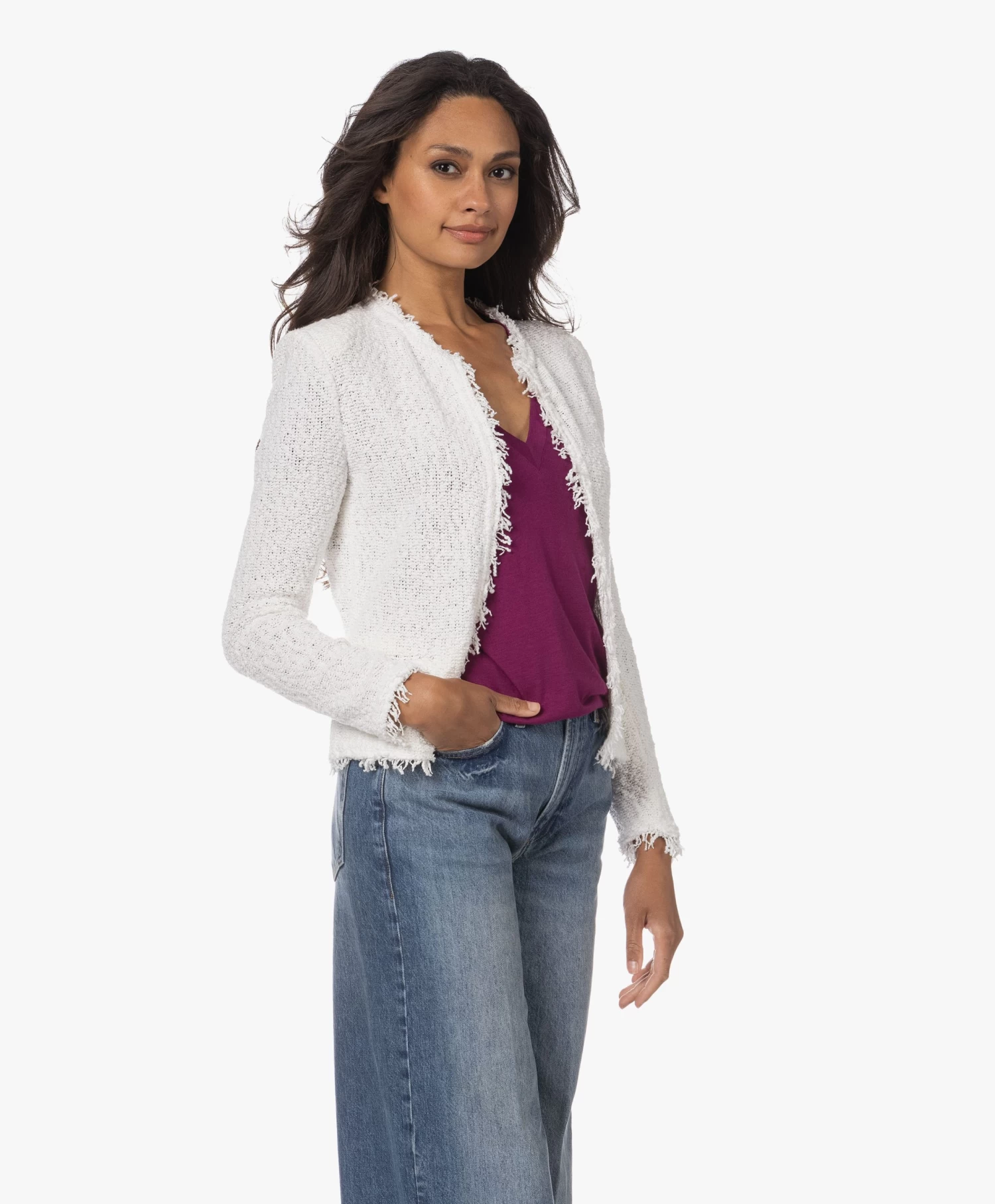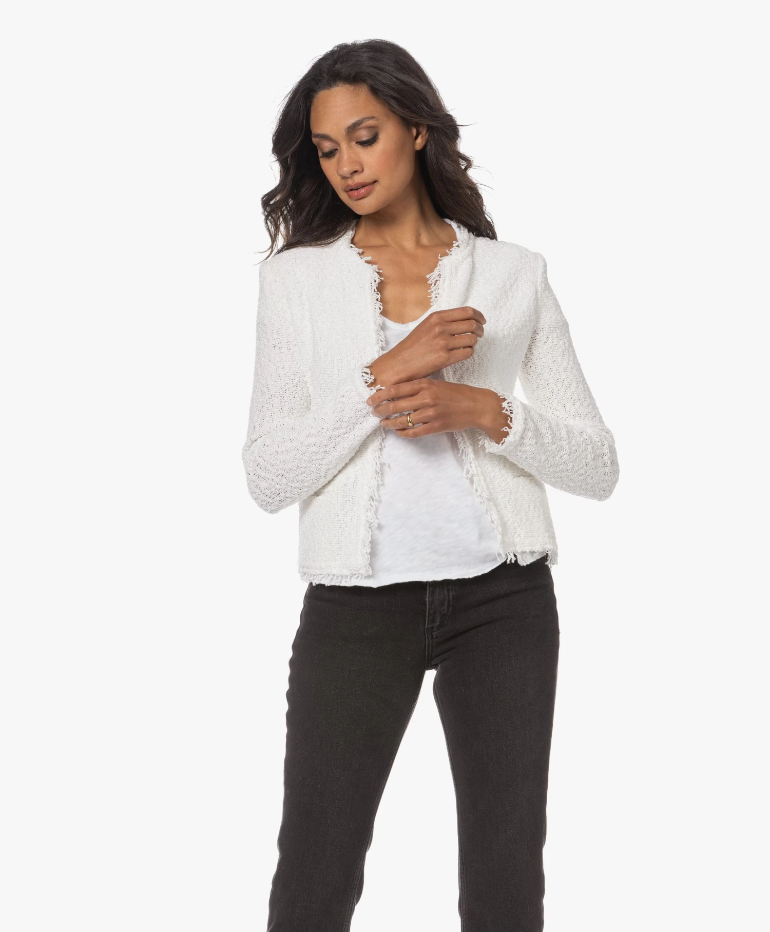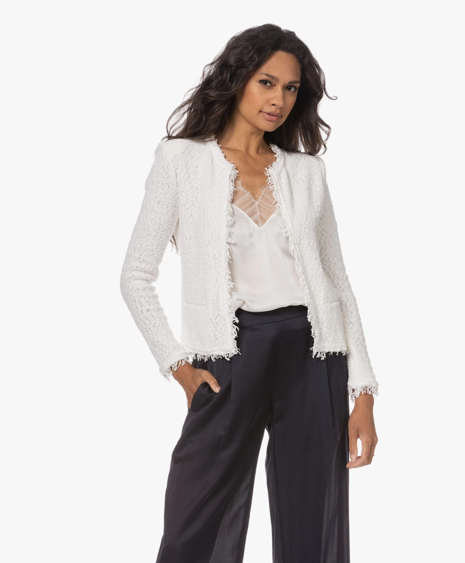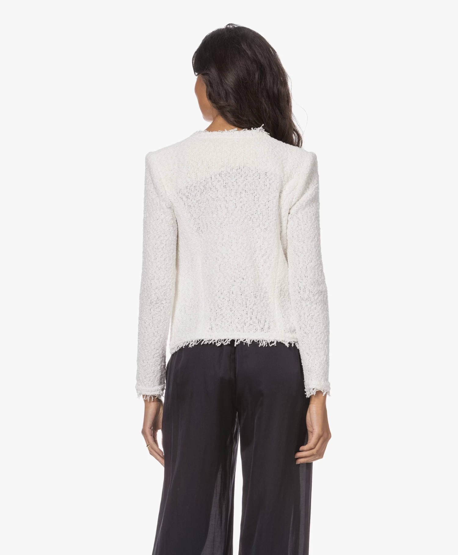 Deze off-white kraagloze Shavani blazer van IRO met open silhouet is vervaardigd van een soepel bouclé-garen in katoenmix. De nonchalante stijl is afgewerkt met rafelige randen voor een eigentijdse edgy look. Het perfecte alternatief voor een klassieke blazer!