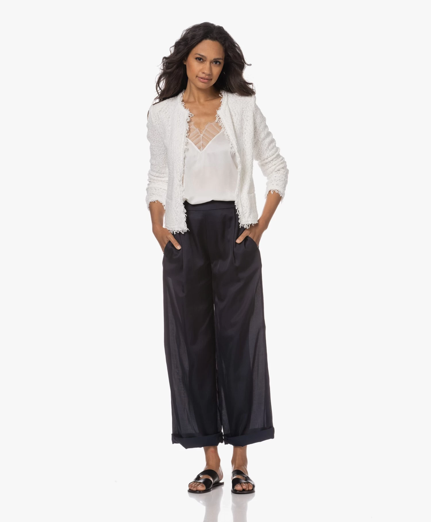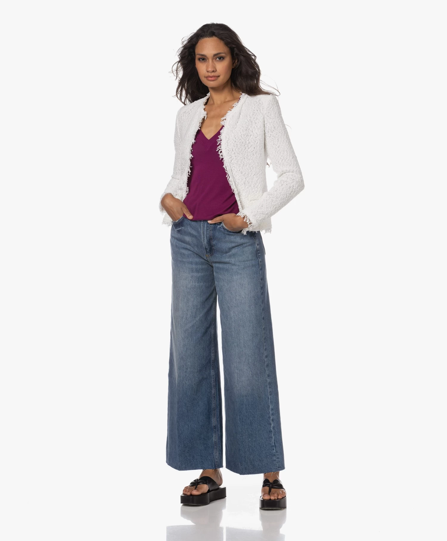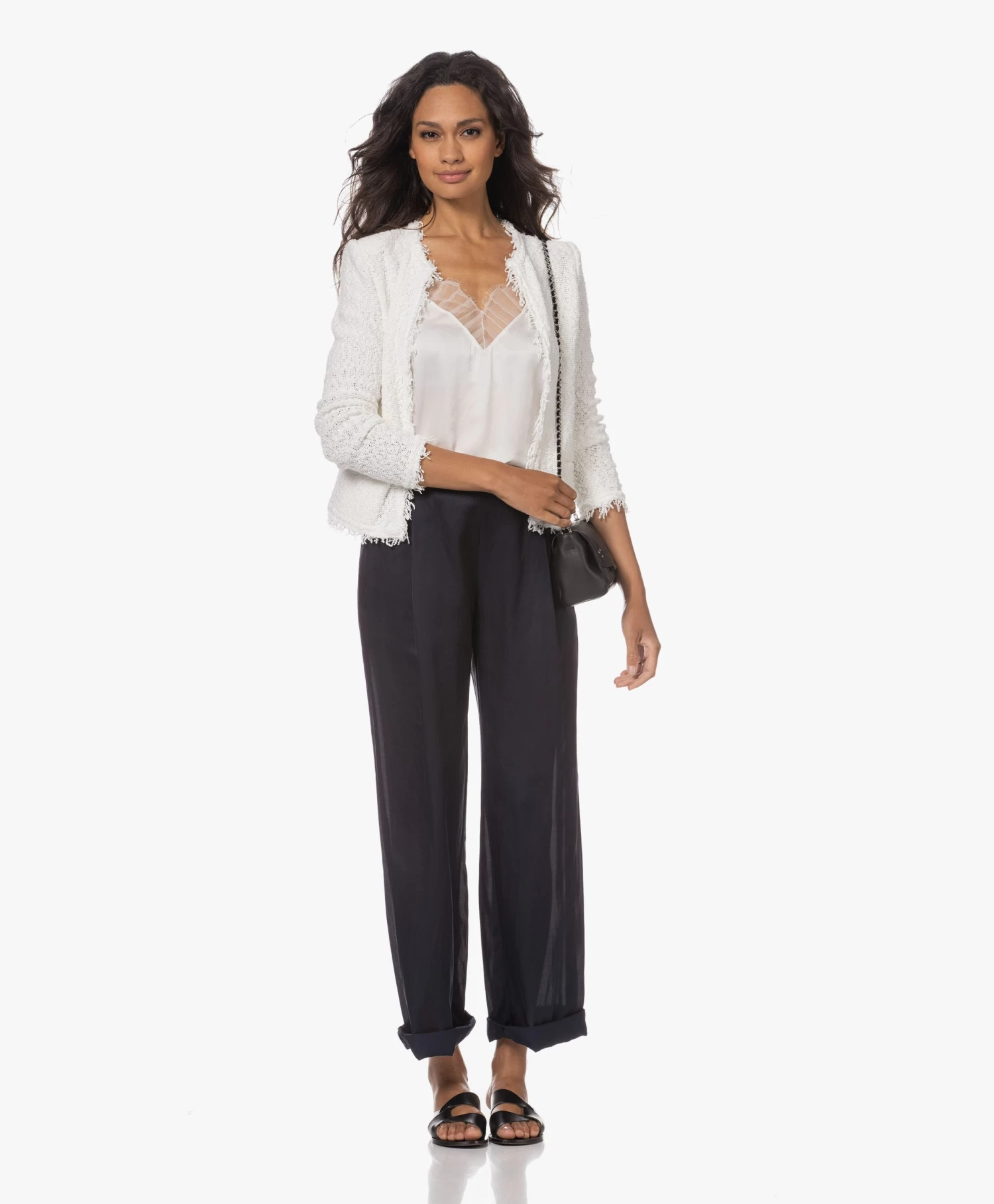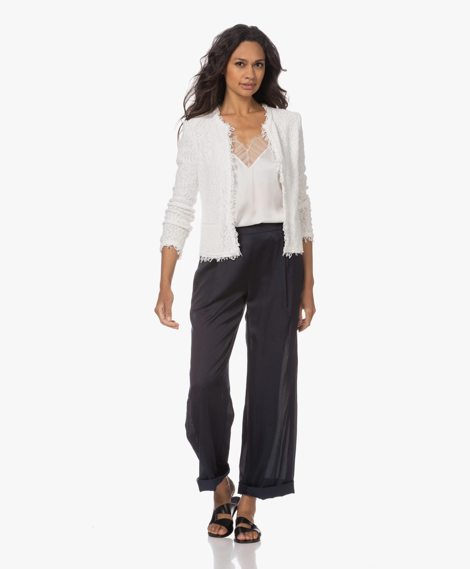Deze off-white kraagloze Shavani blazer van IRO met open silhouet is vervaardigd van een soepel bouclé-garen in katoenmix. De nonchalante stijl is afgewerkt met rafelige randen voor een eigentijdse edgy look. Het perfecte alternatief voor een klassieke blazer!
