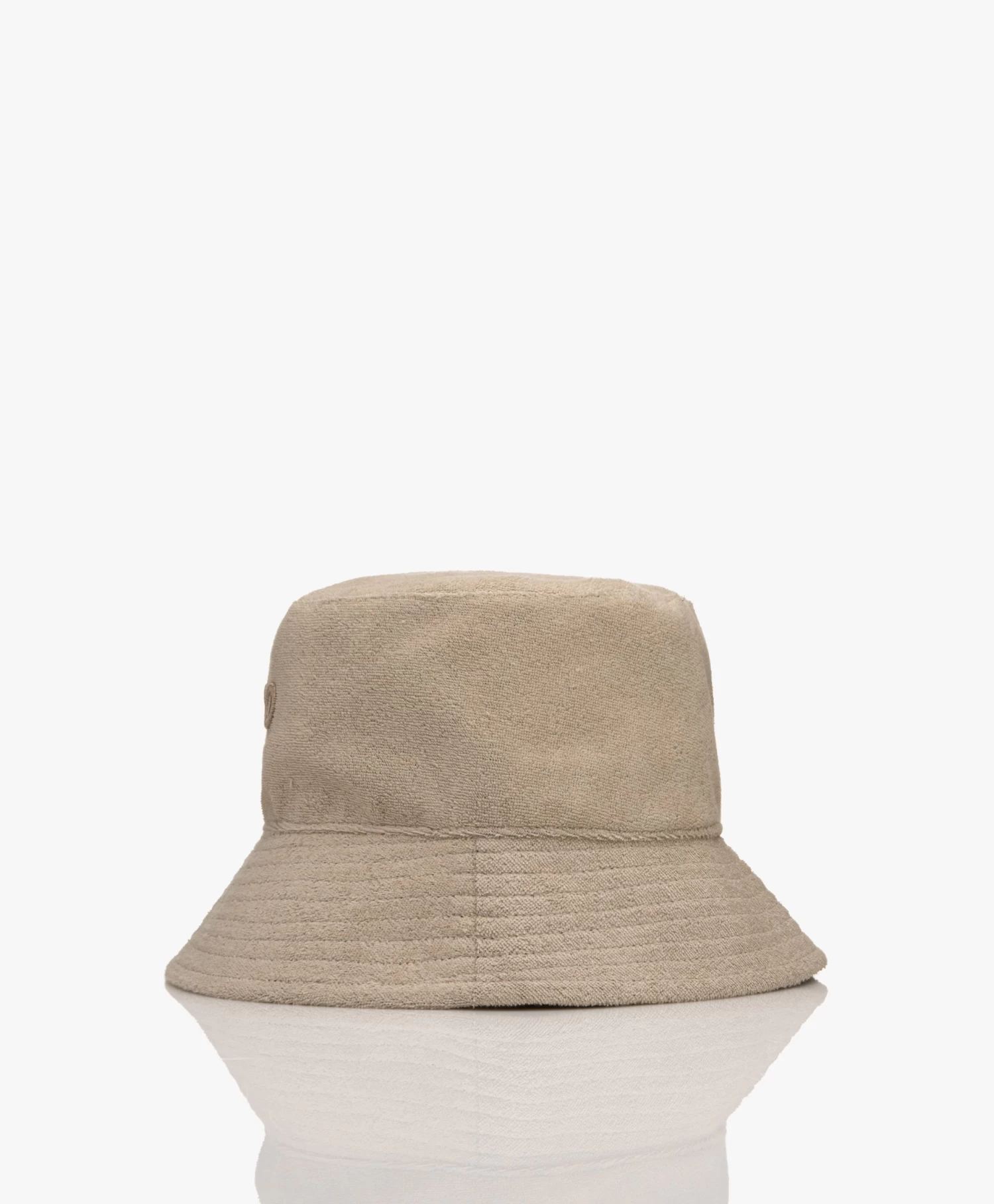 De bucket hat staat eigenlijk iedereen – probeer het, en je bent om. IRO’s zandkleurige Veneto Sponge is gemaakt van niet te zware katoenmix terry: beter bekend als badstof. De rand is meernaalds doorgestikt en het ton-sur-ton logoborduur geeft aan dat het hier een heuse IRO betreft.