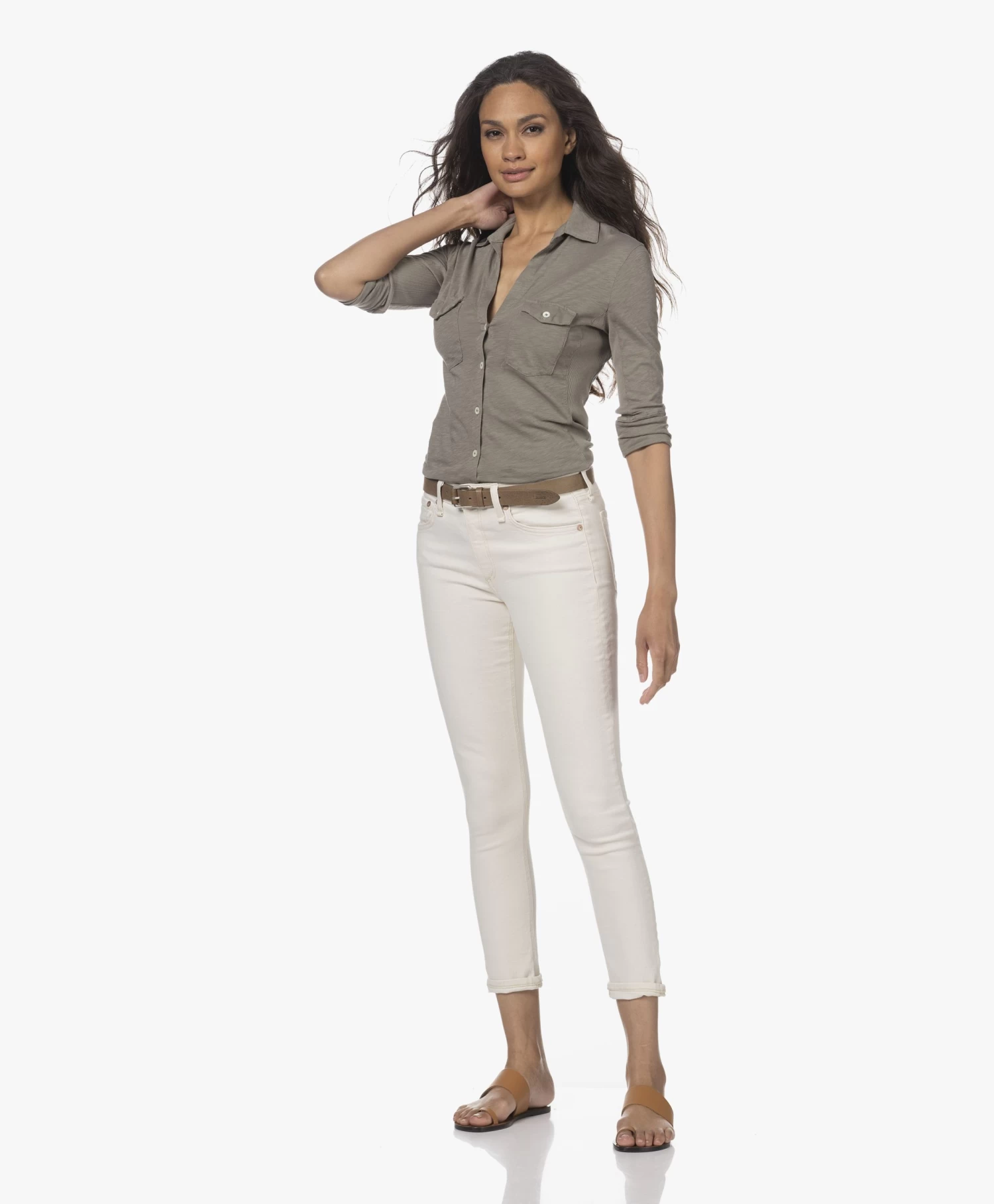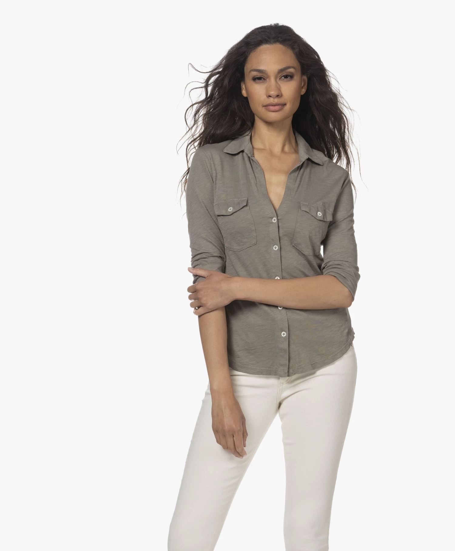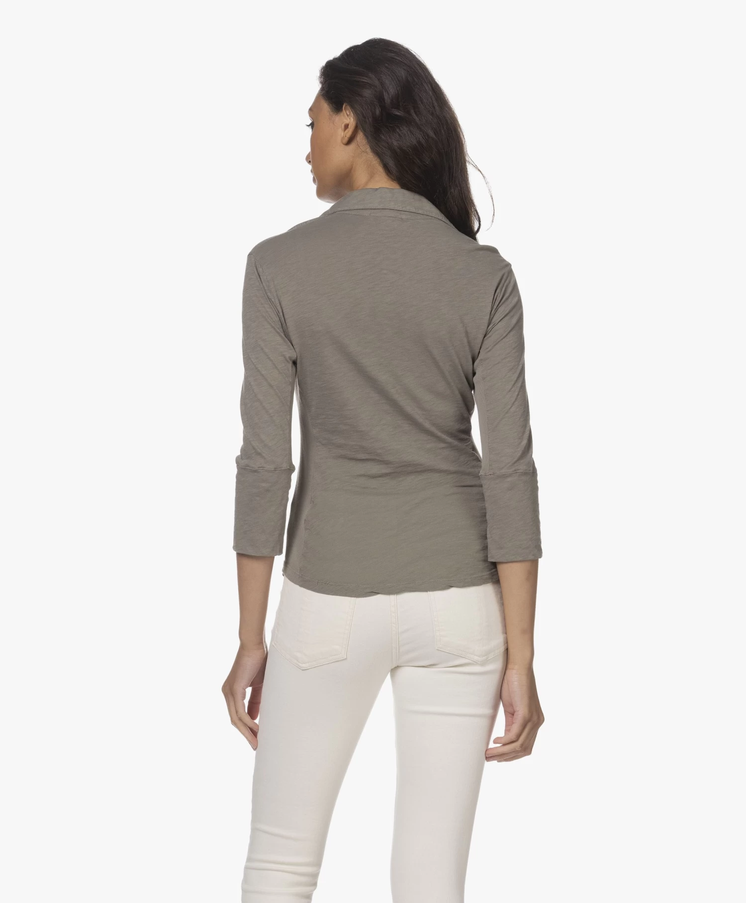 James Perse combineert comfort en stijl op eigentijdse wijze in één ontwerp. Deze taupekleurige blouse is gemaakt van een lichtgewicht en iets transparante jersey in Supima katoen met een subtiel slub effect. Ontworpen met driekwart mouwen en contrasterende rib gebreide inzetten langs de zijkanten.