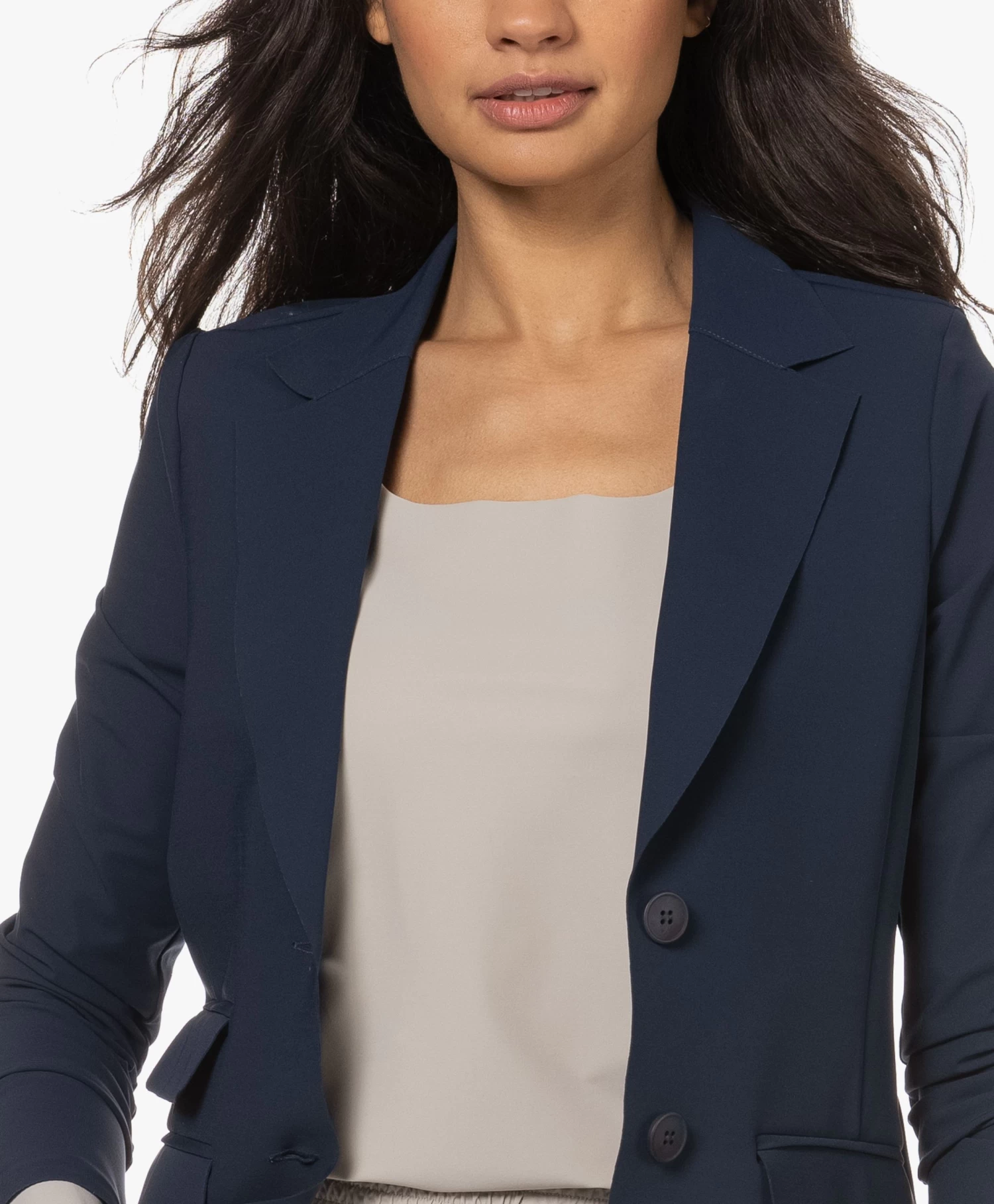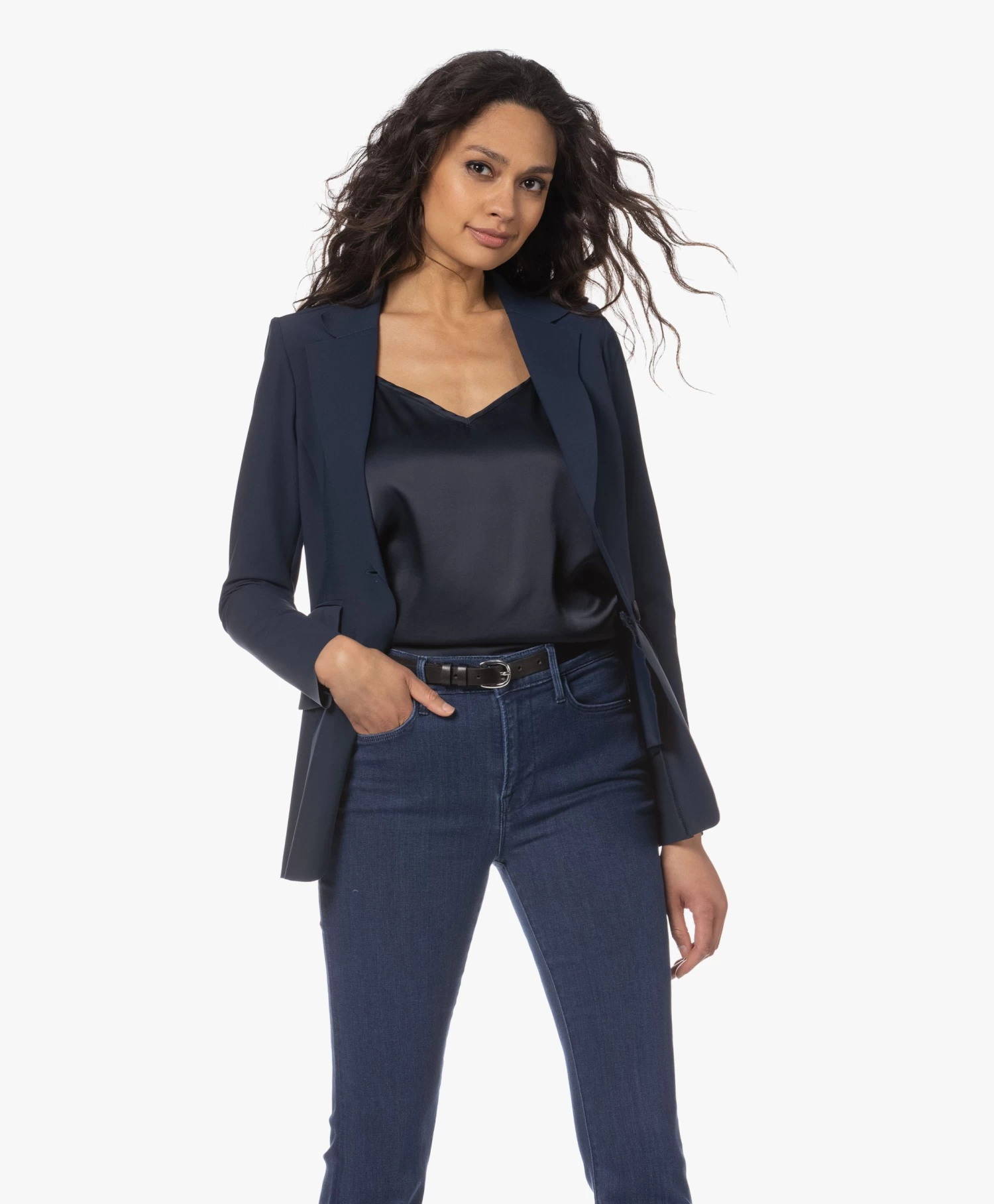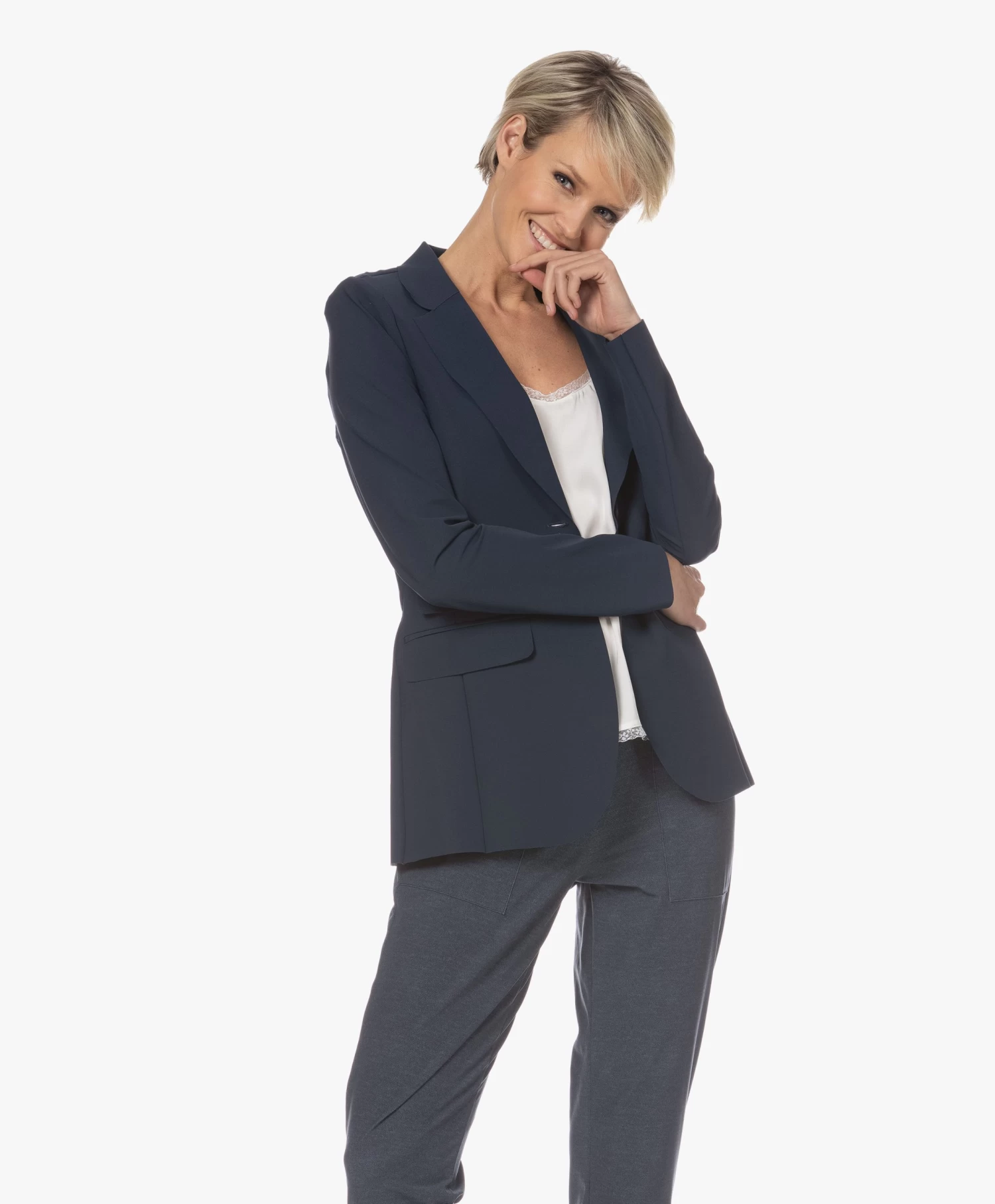 Deze vrouwelijke diep donkerblauwe Yuu blazer van JapanTKY is gemaakt van een ultra-stretchy doch stevige materialenmix voor optimaal draagcomfort en is daarnaast gemakkelijk te wassen, kreukvrij én sneldrogend! Subtiele details – zoals de lasercut afwerking en de meerdere paspelzakken met klep – creëren een klassieker met een twist.Â