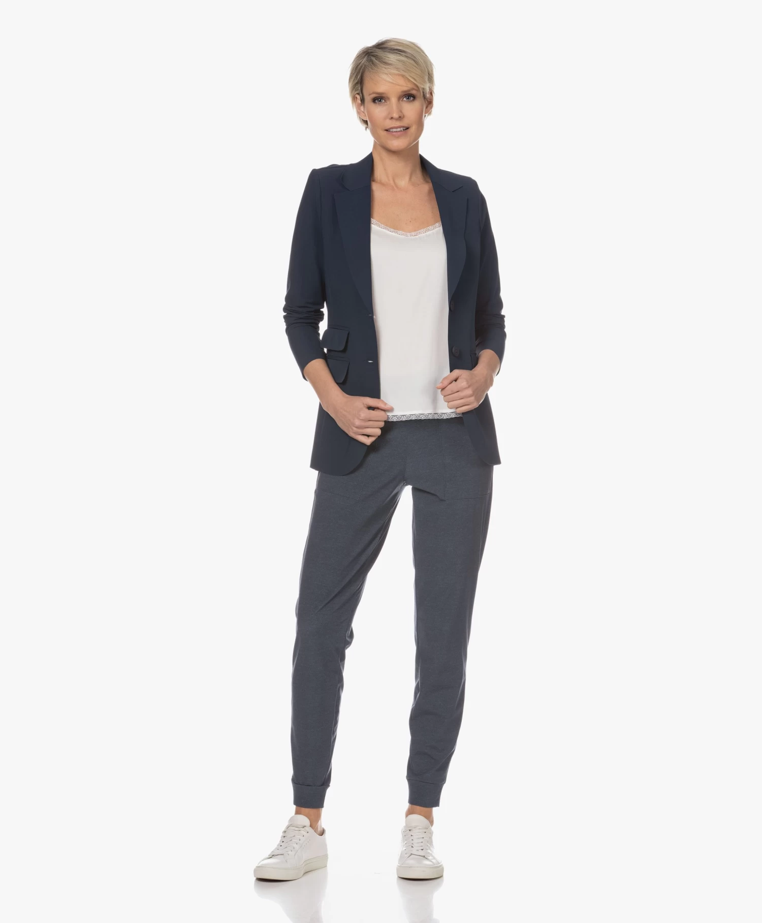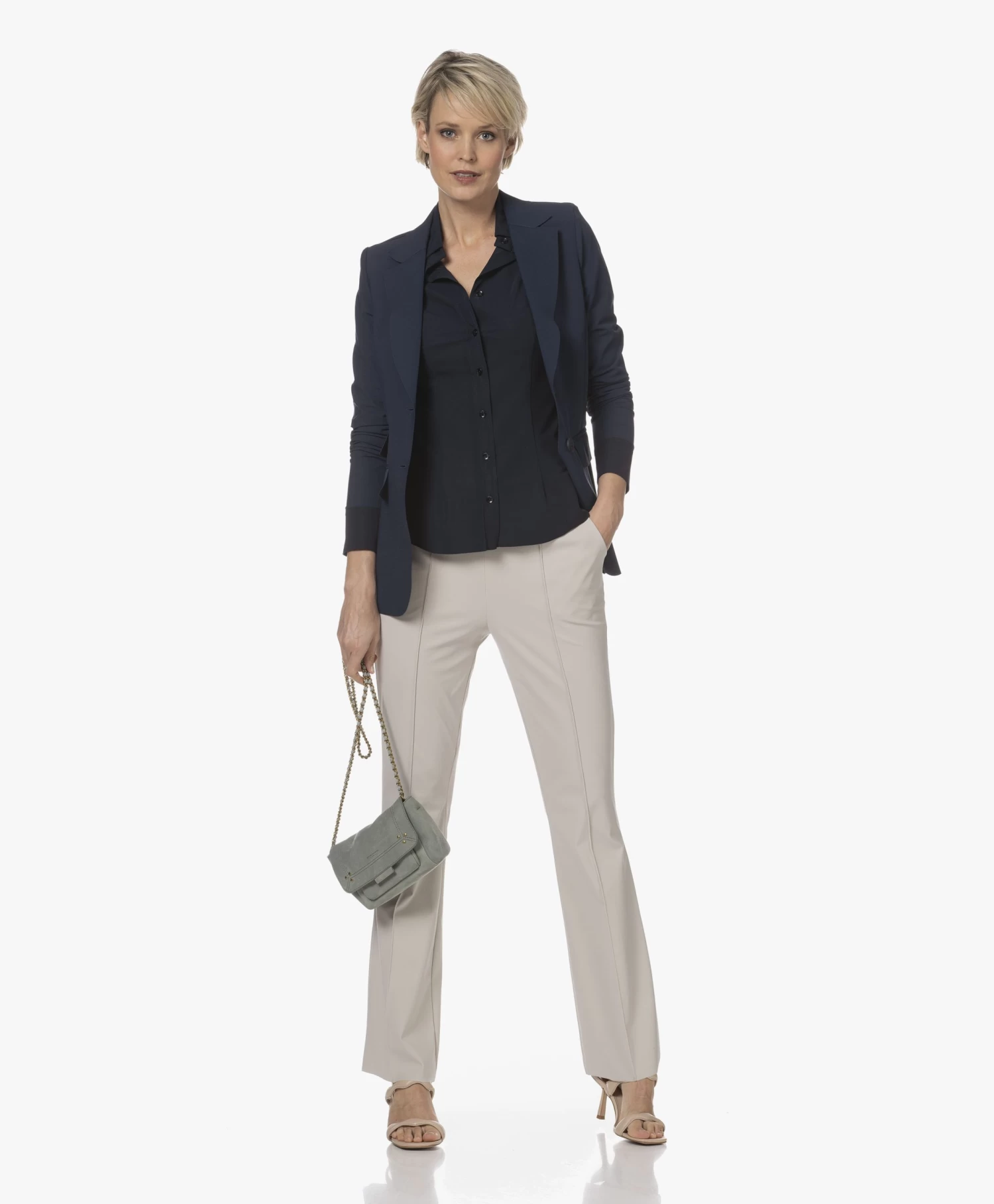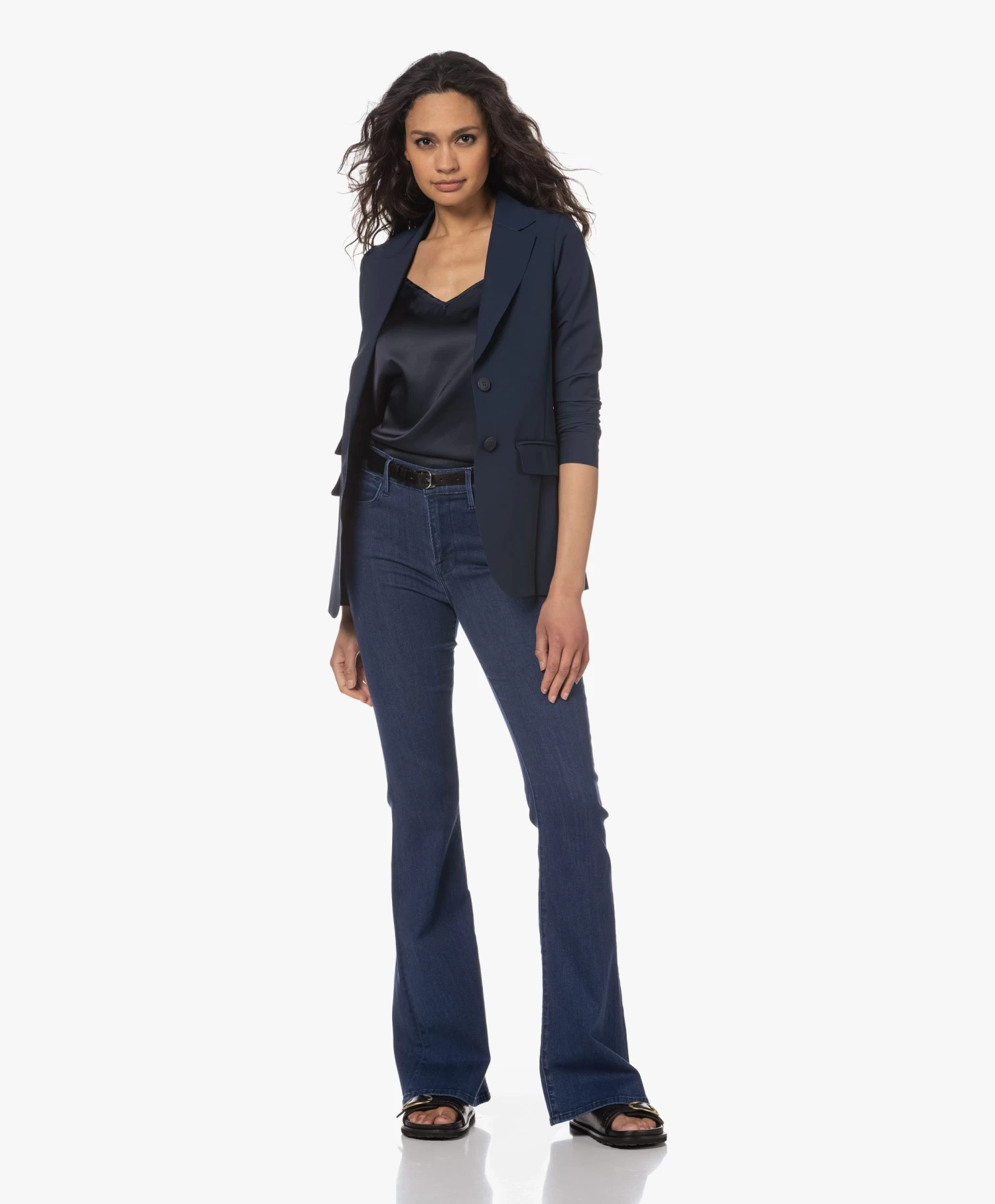 Deze vrouwelijke diep donkerblauwe Yuu blazer van JapanTKY is gemaakt van een ultra-stretchy doch stevige materialenmix voor optimaal draagcomfort en is daarnaast gemakkelijk te wassen, kreukvrij én sneldrogend! Subtiele details – zoals de lasercut afwerking en de meerdere paspelzakken met klep – creëren een klassieker met een twist.Â