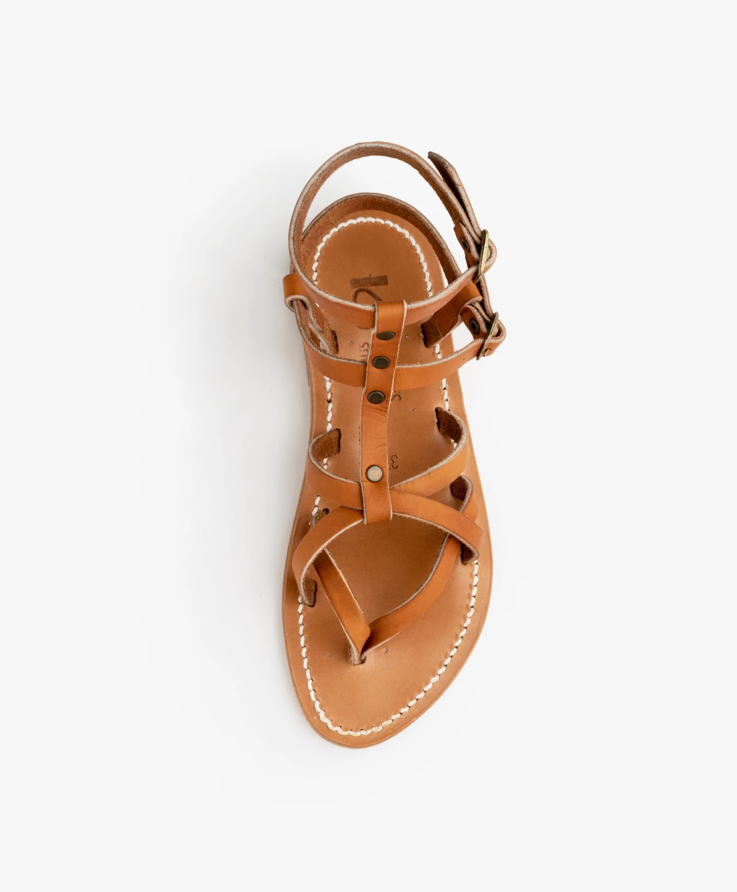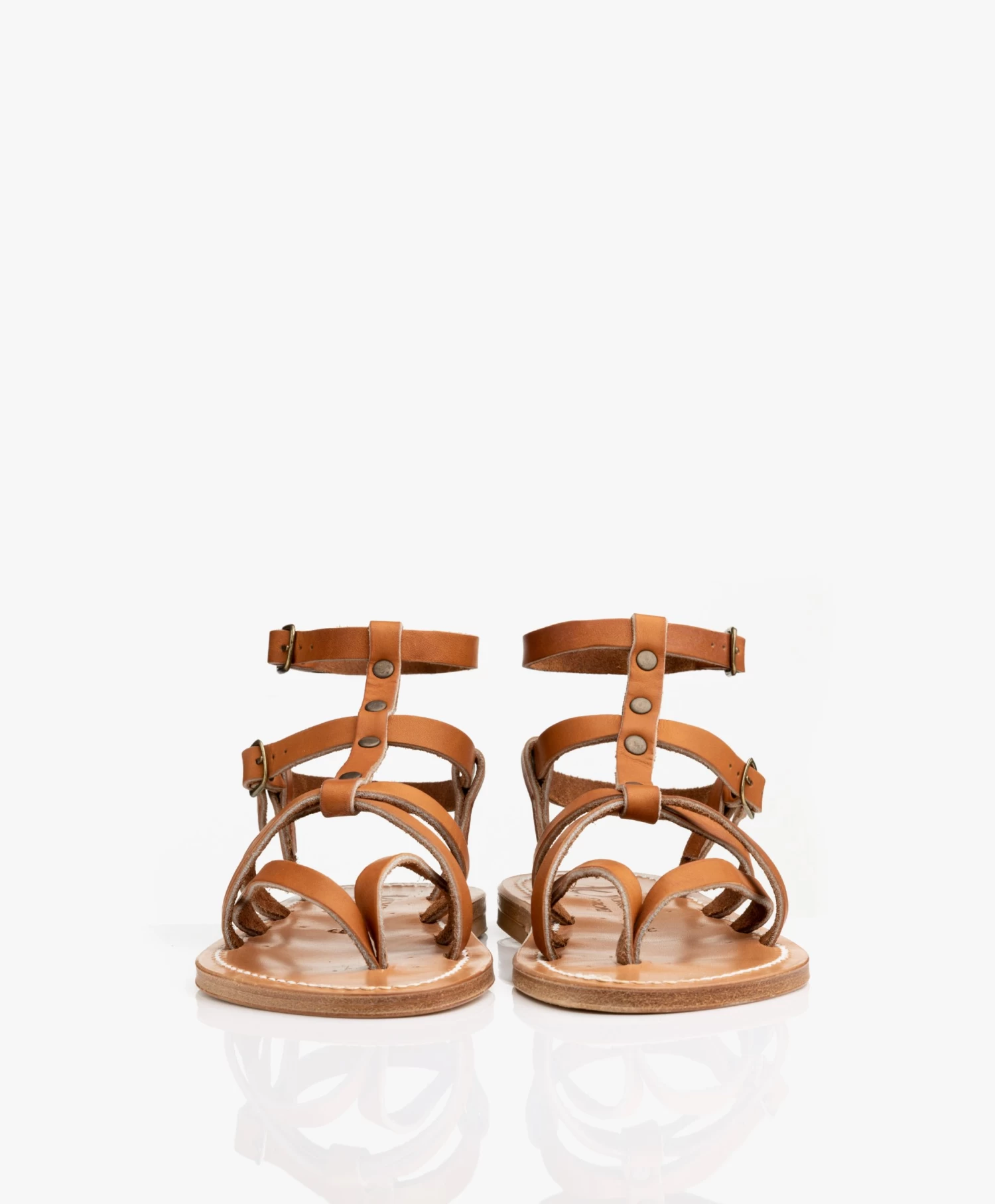 De leren Larissa sandalen van K.Jacques Saint Tropez ademen een tijdloze stijl. Deze sandalen zijn met de hand gemaakt van camelbruin leer en ontworpen met smalle leren bandjes in een kruislings design en zijn gedetailleerd met vintage metalen studs. Deze gladiator-stijl sandalen complementeren iedere look, seizoen na seizoen.