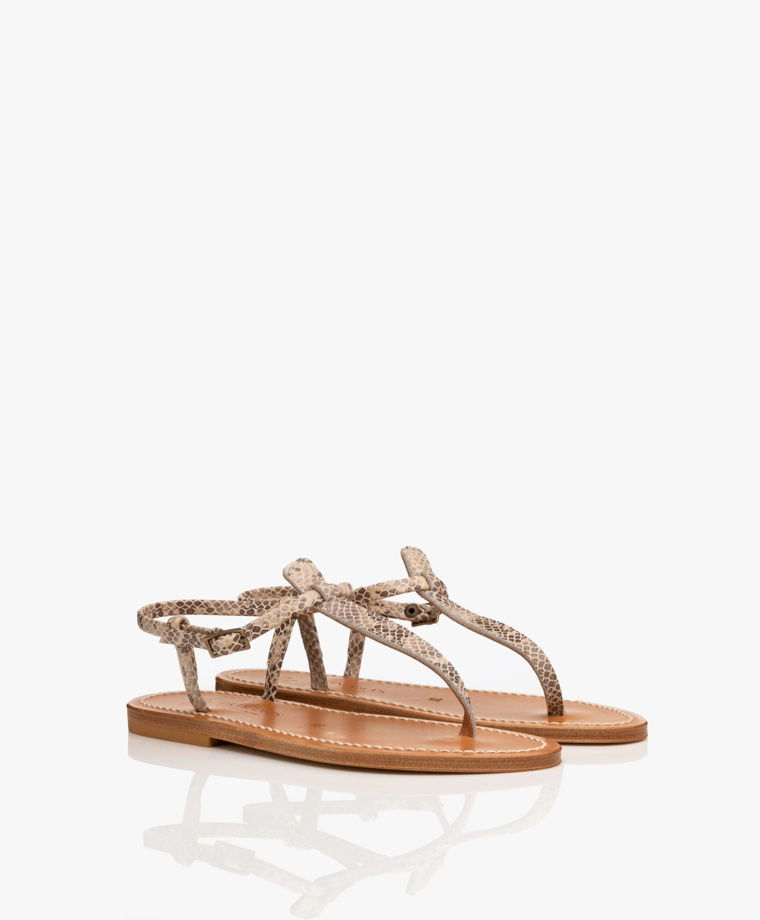 Deze met de hand gemaakte leren sandalen van K. Jacques St. Tropez zijn een tijdloze en veelzijdige must in je collectie. De glanzende slangenprint en goudkleurige hardware zorgen voor een chique touch, terwijl het dubbellaagse voetbed je optimaal comfort geeft. Draag deze sandalen bij al je zomerse outfits – van jurken tot badmode en denim shorts!