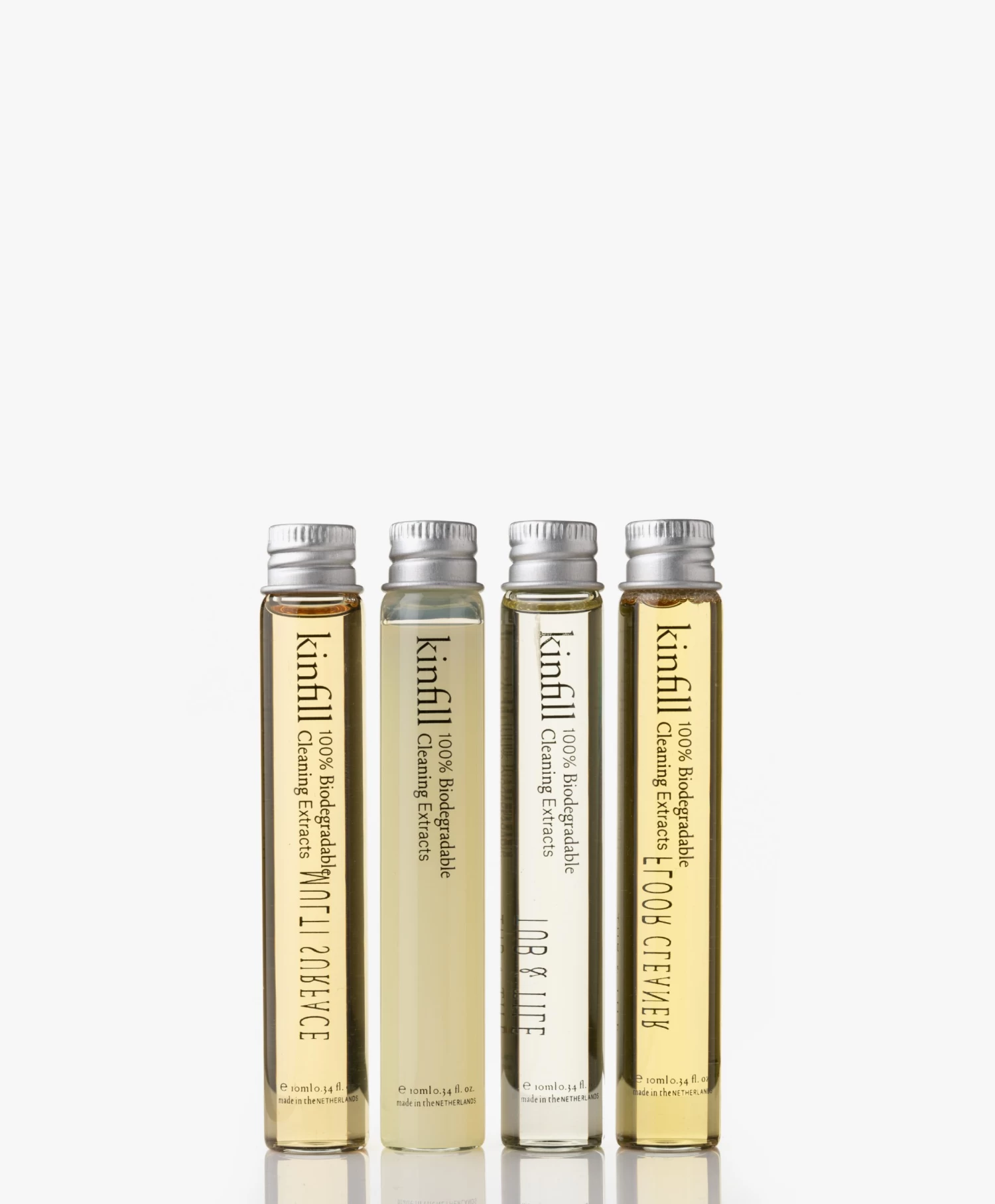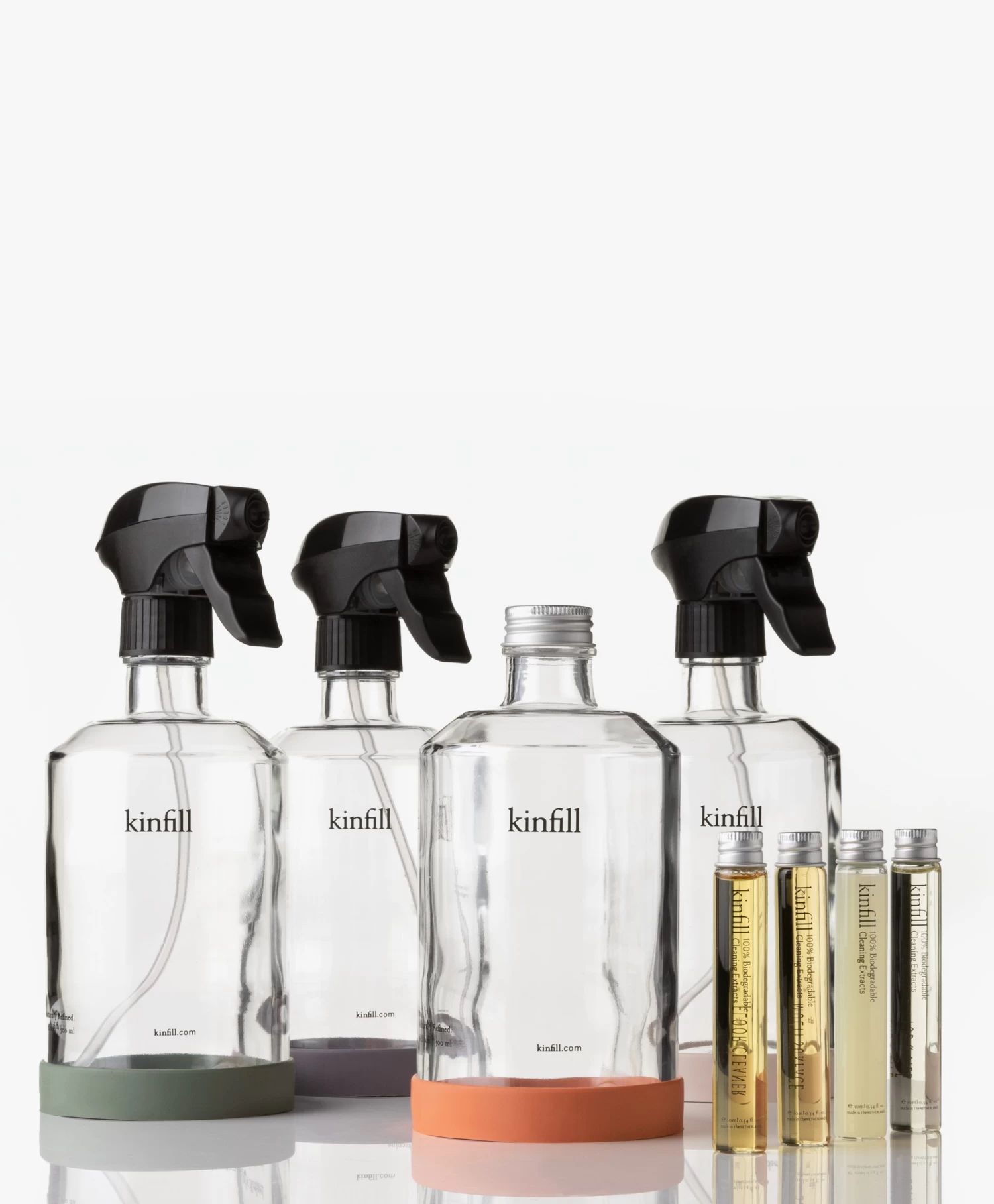 De duurzame Full House Collectie van Kinfill bestaat uit vier verschillende soorten schoonmaakmiddelen; elk geschikt voor een ander oppervlak. Dit luxueuze pakket wordt geleverd met vier navulbare Forever Bottles van Italiaans glas, een rubberen flesbeschermer voor elk reinigingsproduct en vier schoonmaakconcentraten die je aanvult met kraanwater om ‘single-use’ plastic in het dagelijks leven te verminderen. Bovendien worden de sprays geleverd met een triggerspuit én ontvang je labels om de flessen georganiseerd te houden. De schoonmaakconcentraten zijn samengesteld uit krachtige, natuurlijke ingrediënten – voor een heerlijke geur in huis.